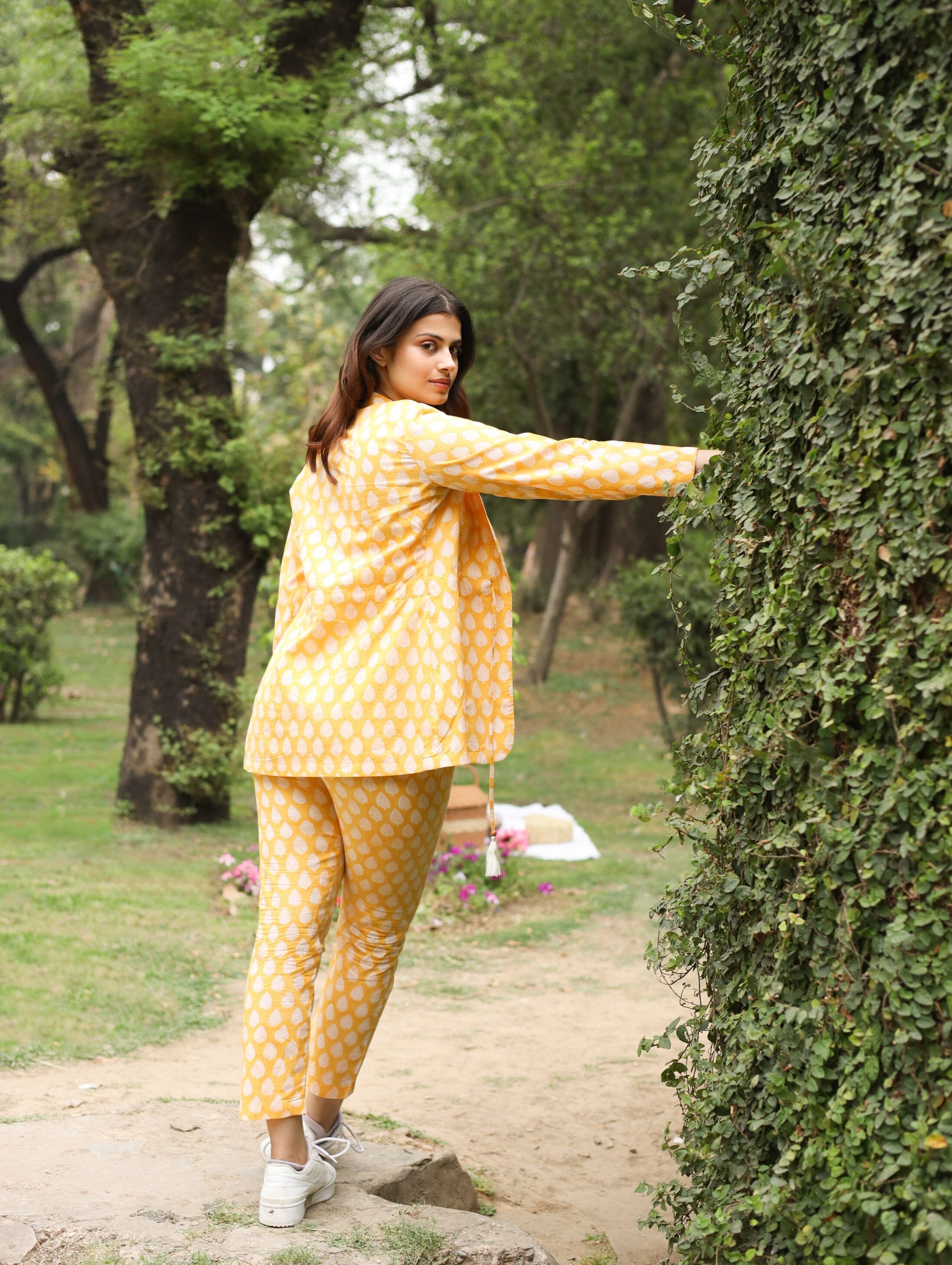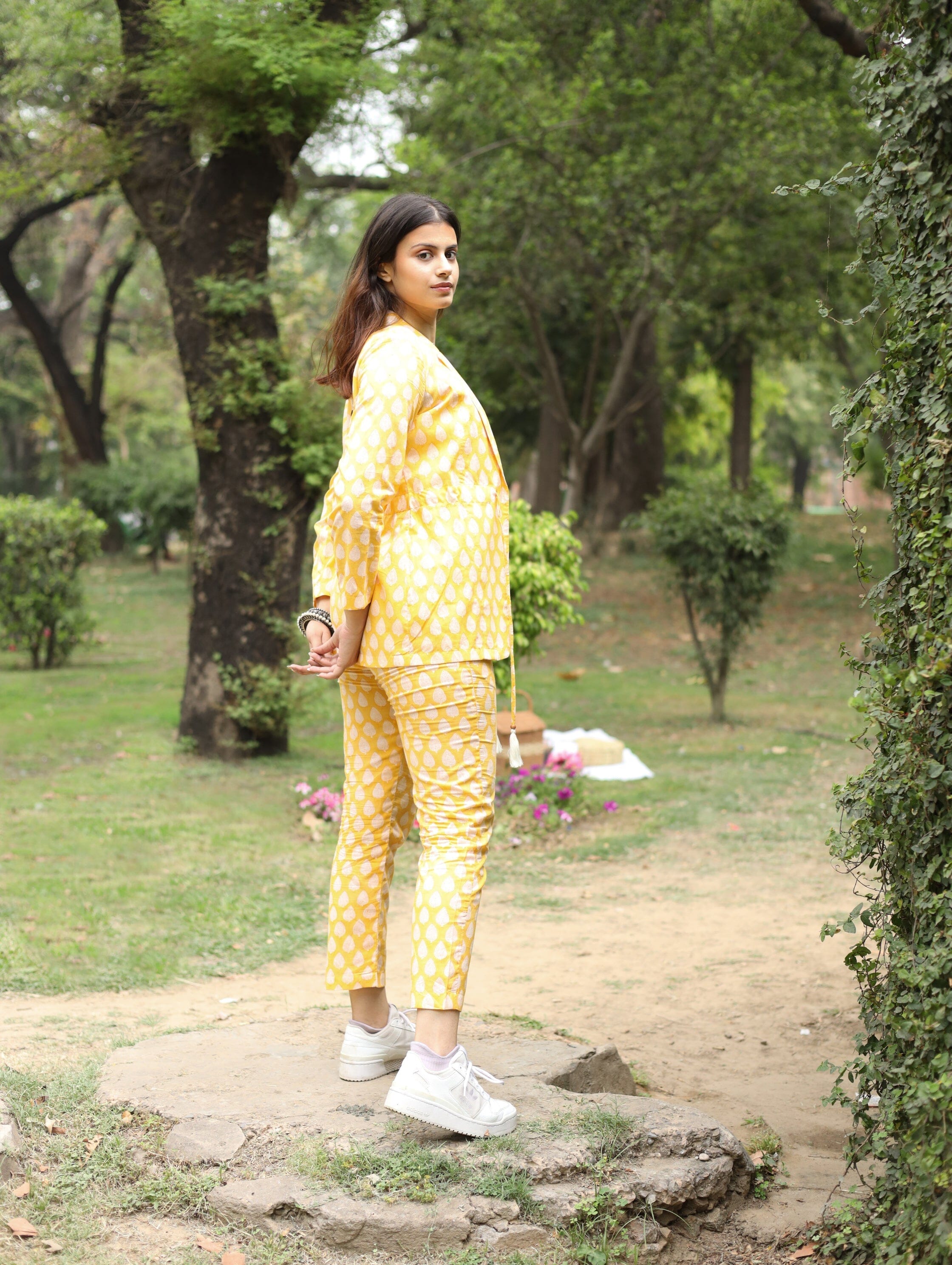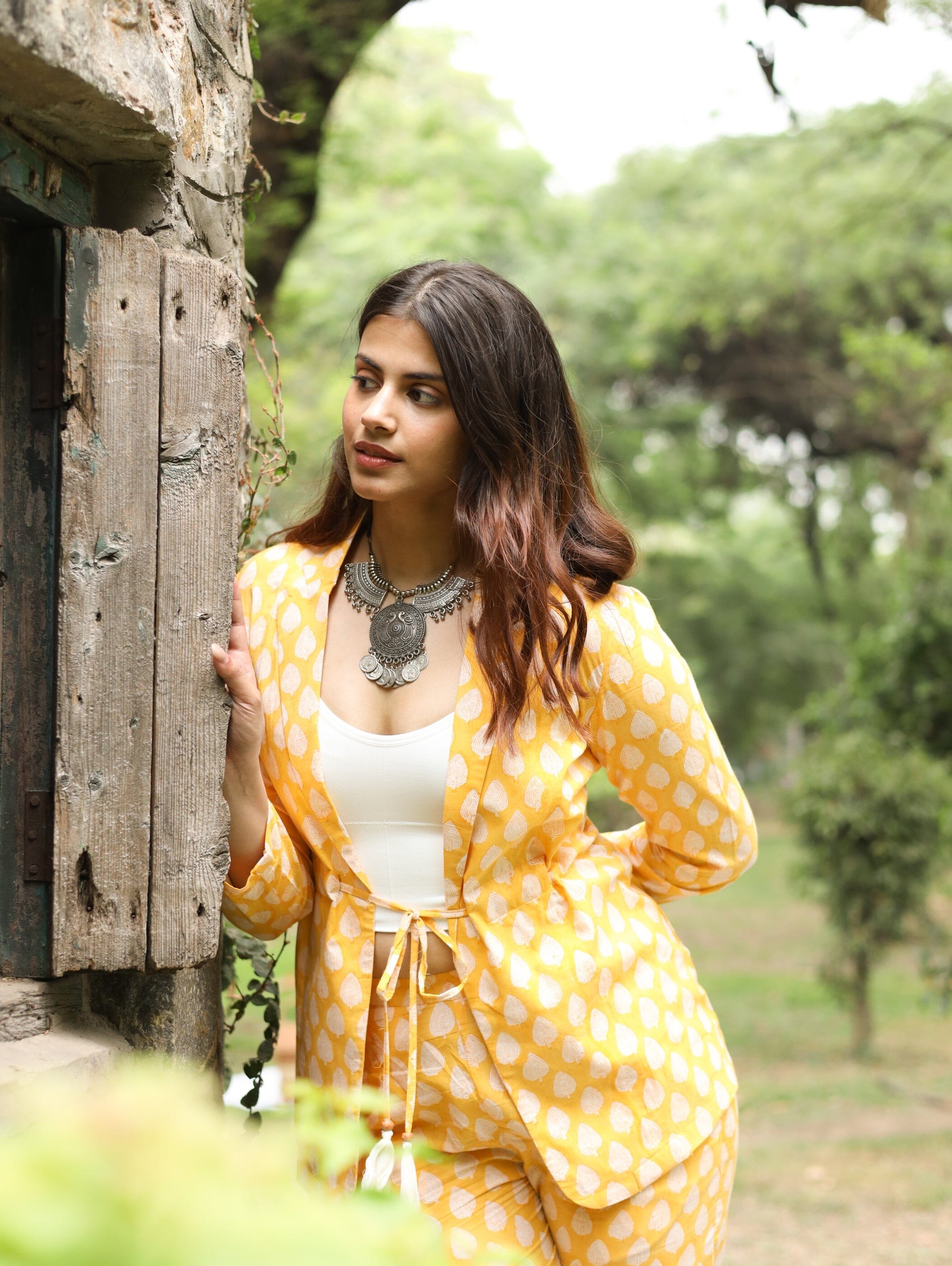 A Versatile Full Sleeves Blazer set with Pants curated in Yellow motif print. The Blazer comes with an inbuilt string and tassels to add that extra edginess to the silhouette! Pair it with your classic white crop top or spaghetti & set your super chic mood.
