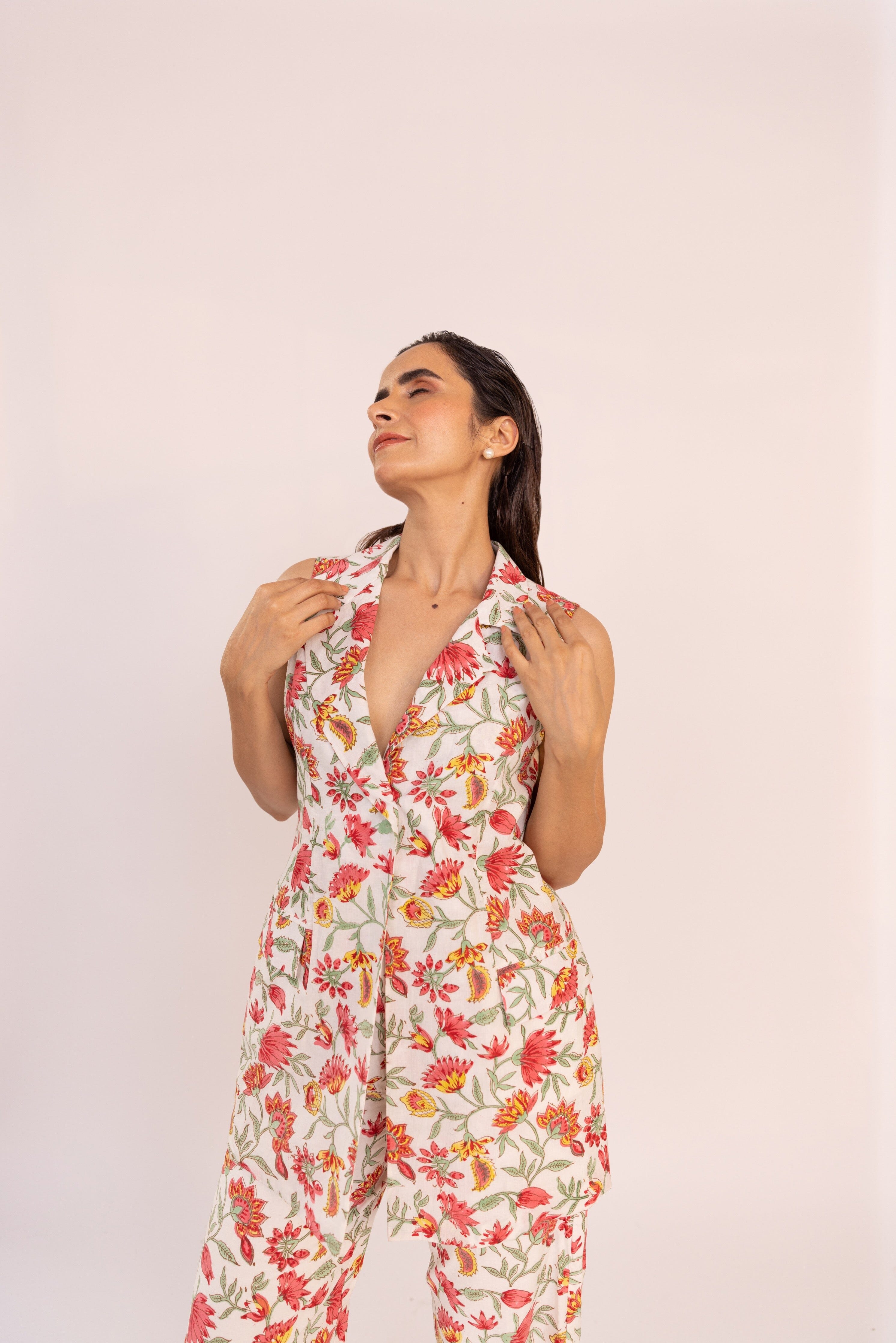 Featuring a sleeveless jacket , paired with matching pants in cotton base.