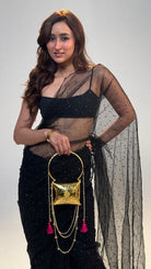 Chorus Bag – A luxurious gold-plated accessory with a charming pillow shape, adorned with delicate square pearl strings, a distinctive handle, baby mini elephant, and a touch of favorite pink for an unforgettable statement.