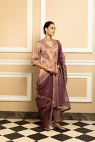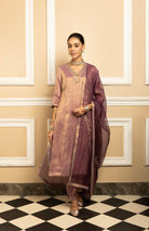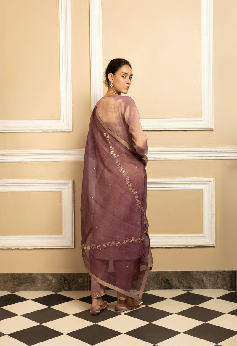A sophisticated ensemble crafted for timeless appeal. This long kurta is paired with sleek straight pants and a lightweight pure silk organza dupatta, embellished with intricate embroidery using dabka, zari, cutdana, resham, sequins, and gota, each detail showcases meticulous artistry. The Suhani Purple Kurta Set is perfect for festive occasions, offering a rich blend of traditional craftsmanship and contemporary style.