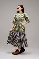 Tiered dress crafted handwoven cotton and features beautiful hand block prints. It comes in a stylish dual-color combination that gives it a bold yet classic look. Designed for everyday comfort, it has two handy pockets and a full back opening for easy wear.