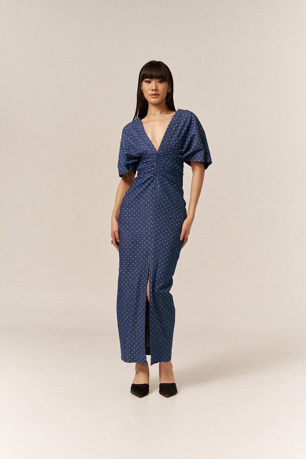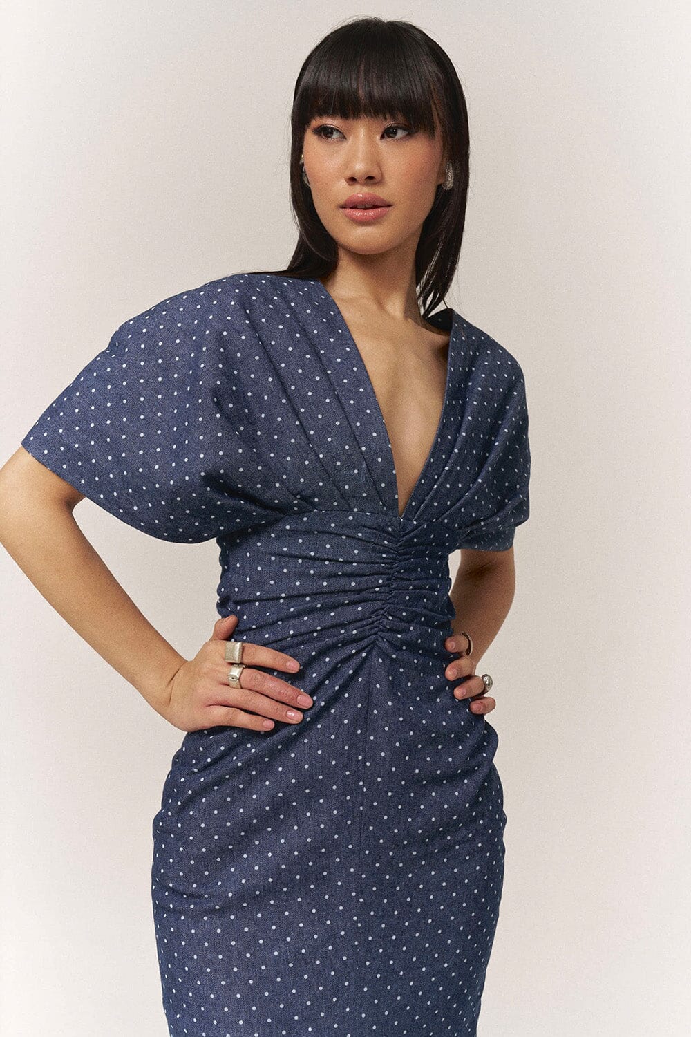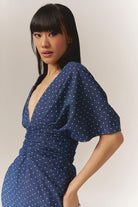 Elevate your wardrobe with our enchanting polka dot denim dress, a stunning blend of style and sophistication. Tailored to accentuate your waist, this dress features a captivating twisted front and a chic front slit hem, ensuring you make a memorable impression at baby showers, birthdays, brunches, garden parties, and more.