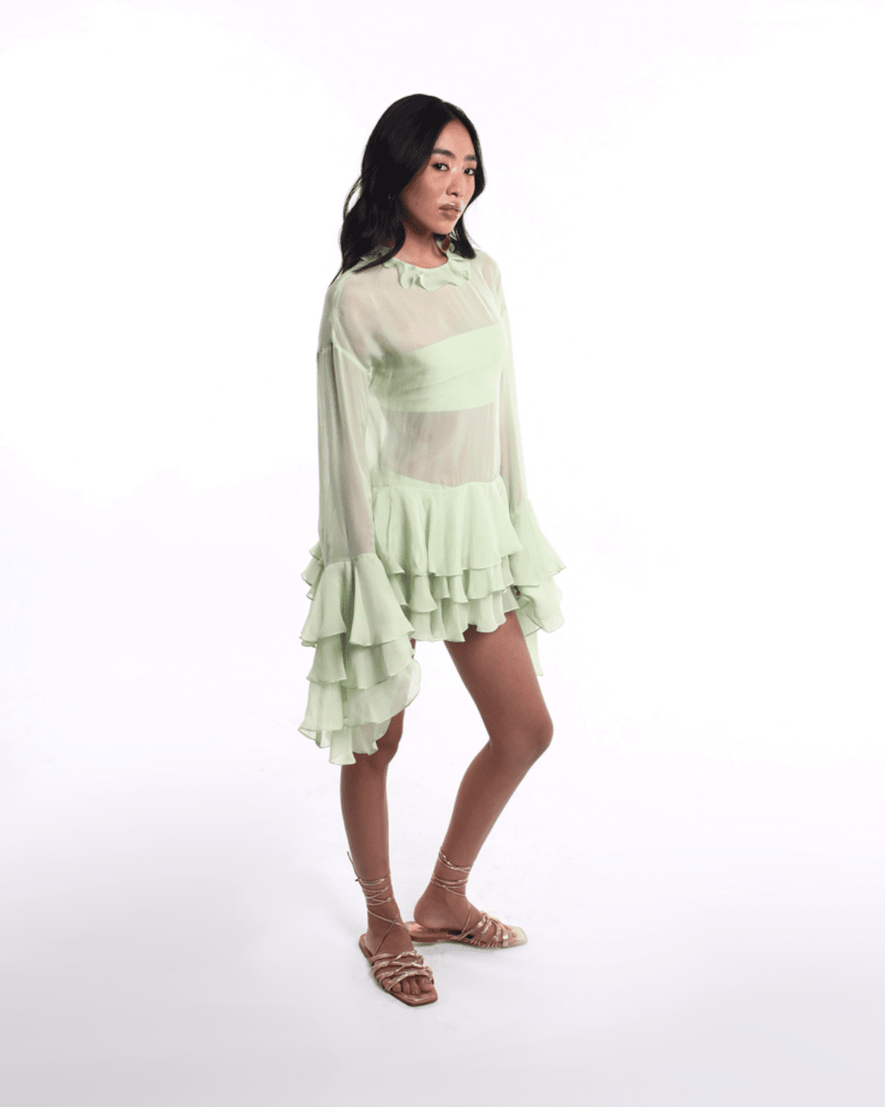 The JOLIE dress is sheer, soft, and oh-so-romantic. Crafted in a dreamy mint green with cascading ruffle sleeves and a tiered hem, it strikes a delicate balance between playfulness and poetic charm. The high neckline adds a touch of vintage whimsy, while the silhouette keeps it modern and fluid. Perfectly fit look that radiates vitality and refinement.