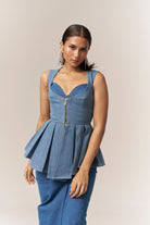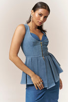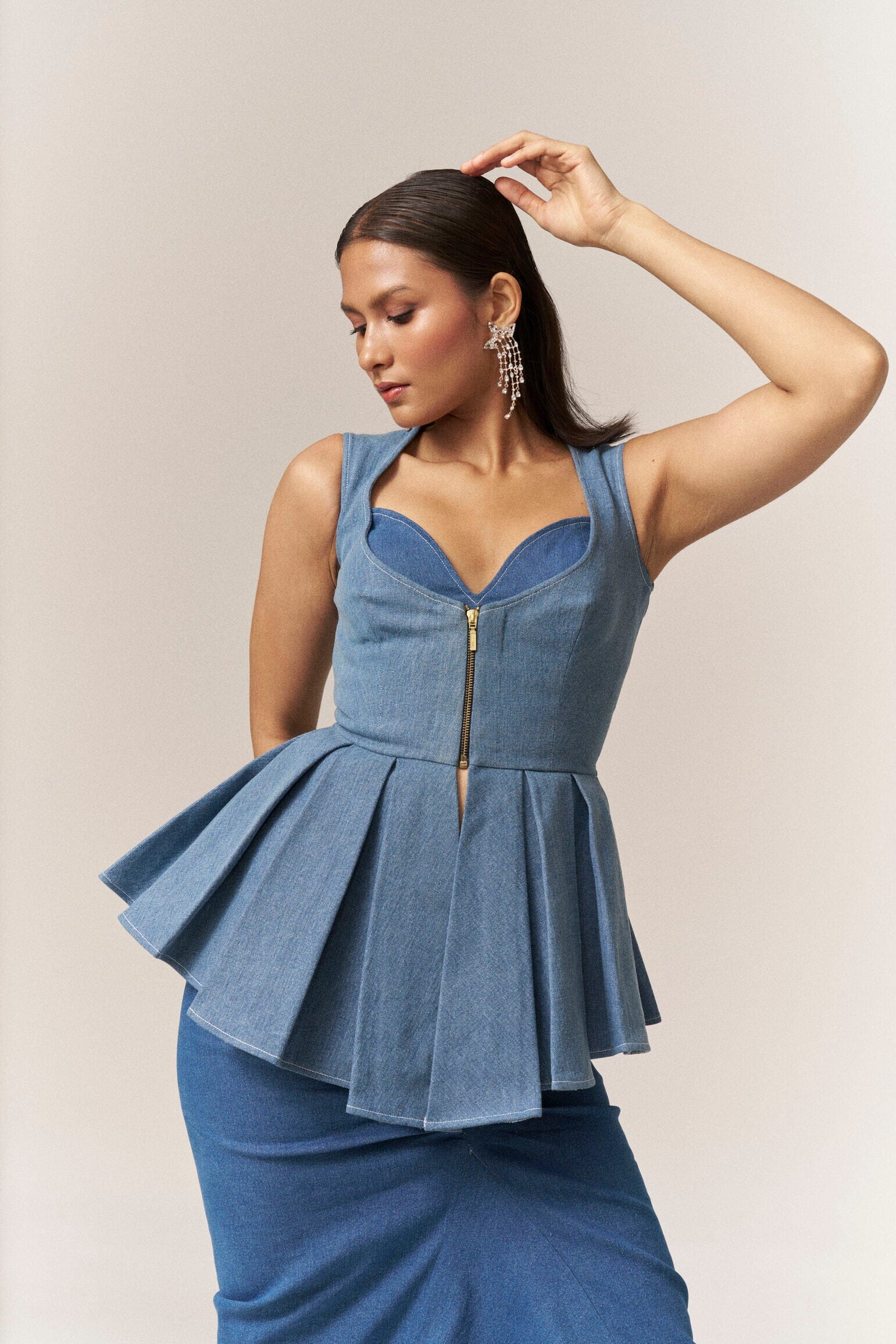Elevate your wardrobe with our trendy three-piece set, featuring a chic bustier, a denim peplum jacket, and an asymmetric gathered skirt with silver zip detailing. This versatile ensemble is perfect for shopping, brunches, vacations, and baby showers. Make a fashionable statement with this stylish look that transforms casual Fridays into something extraordinary!