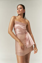 Introducing our stunning strapless tube dress in a beautiful peachy pink, adorned with exquisite Japanese Swarovski and elegant knot detailing. This versatile piece is perfect for cocktail parties, fine dining, wedding celebrations, bachelorette events, and baby showers. The length of the dress can be customized to suit your preference, allowing you to elevate your look for any occasion with effortless style.