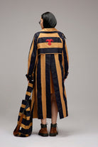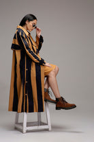 Crafted from handwoven cotton, this knee-length dress blends timeless style with sustainable craftsmanship. Featuring a Johnny collar, button-detailed sleeves, and shirt-style cuffs, it offers effortless comfort with a refined silhouette. Paired with a matching big stripe jacket featuring joker embroidery and statement buttons, this versatile look can be styled up or down for any occasion.