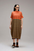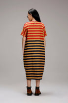 Tan-Brown Red & Blue Dual Striped Dress
