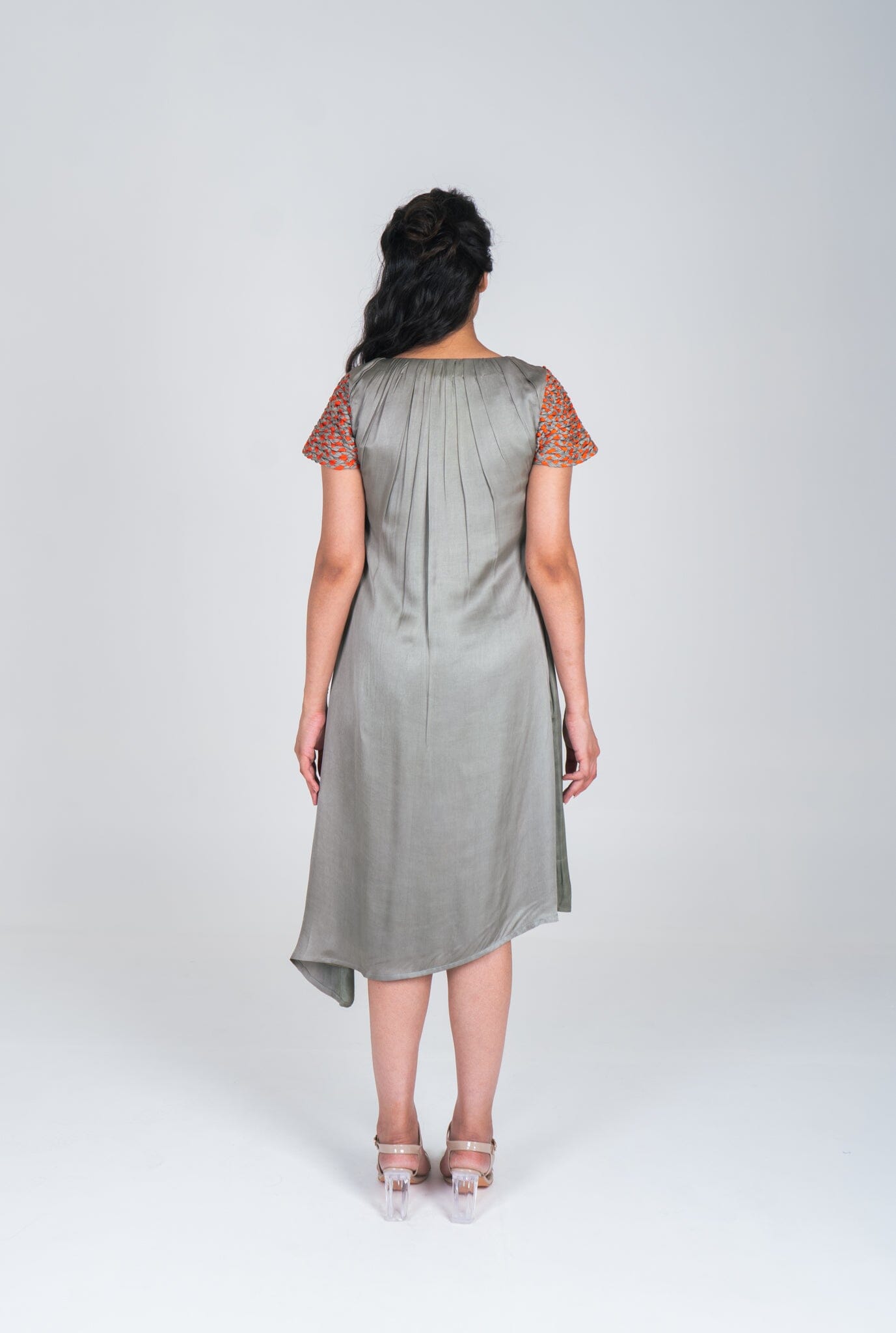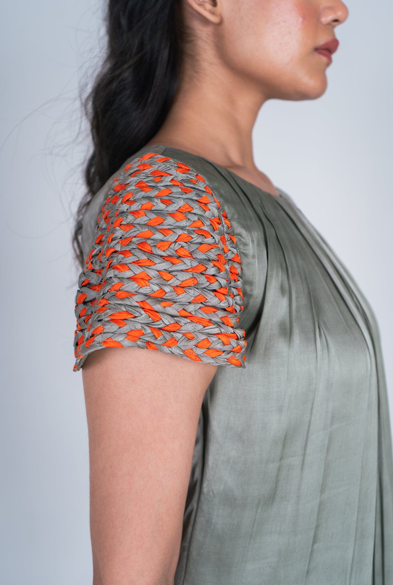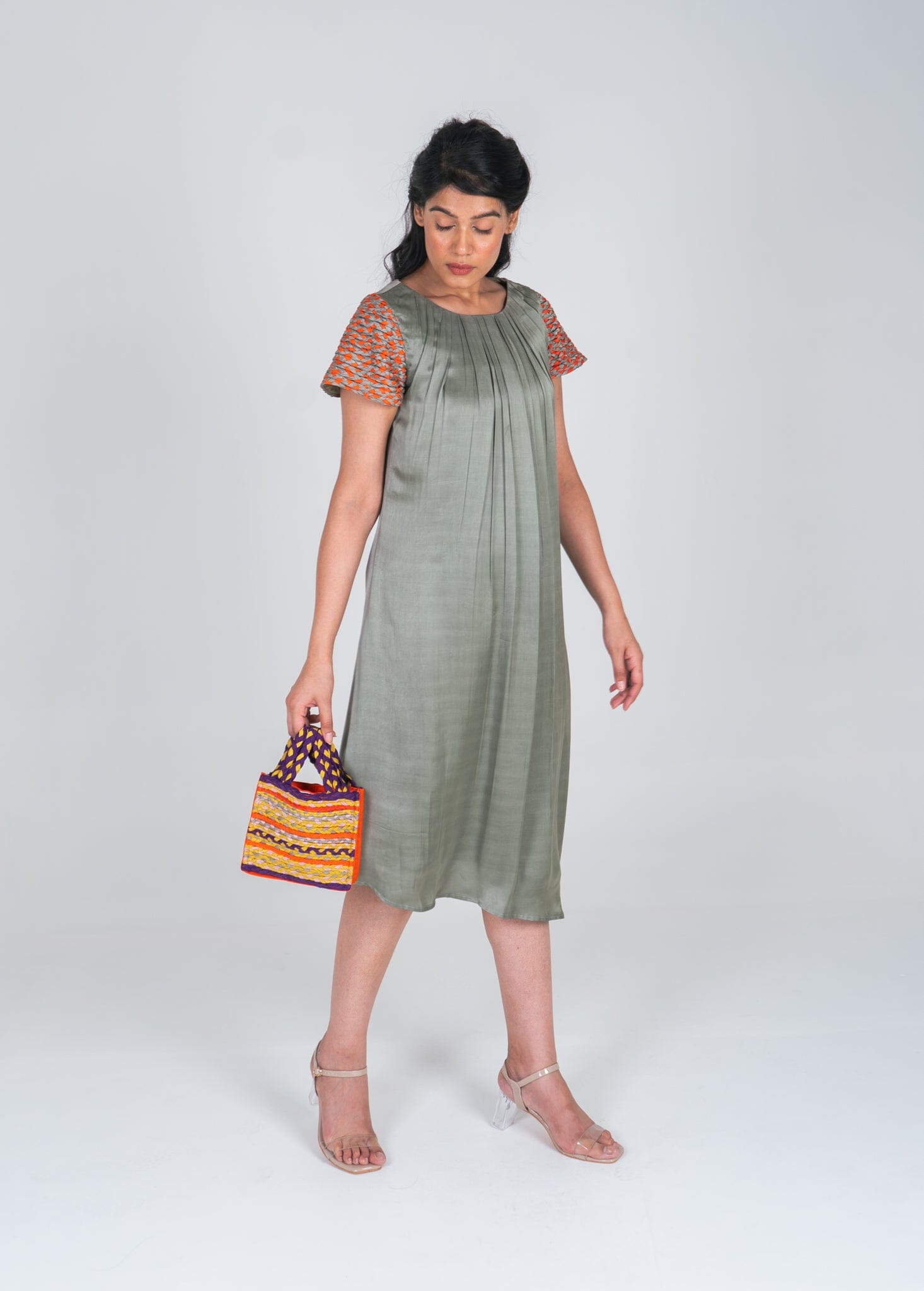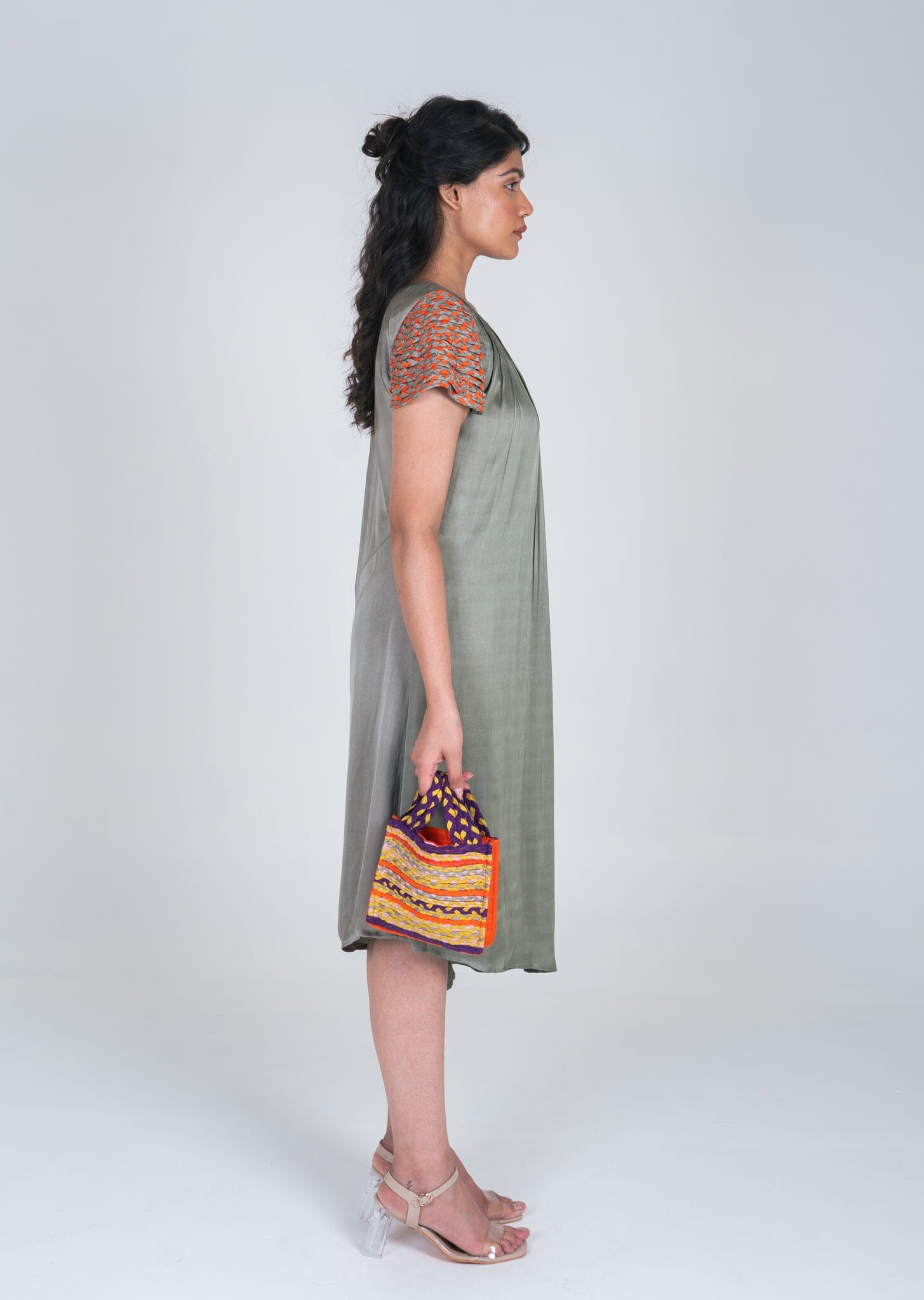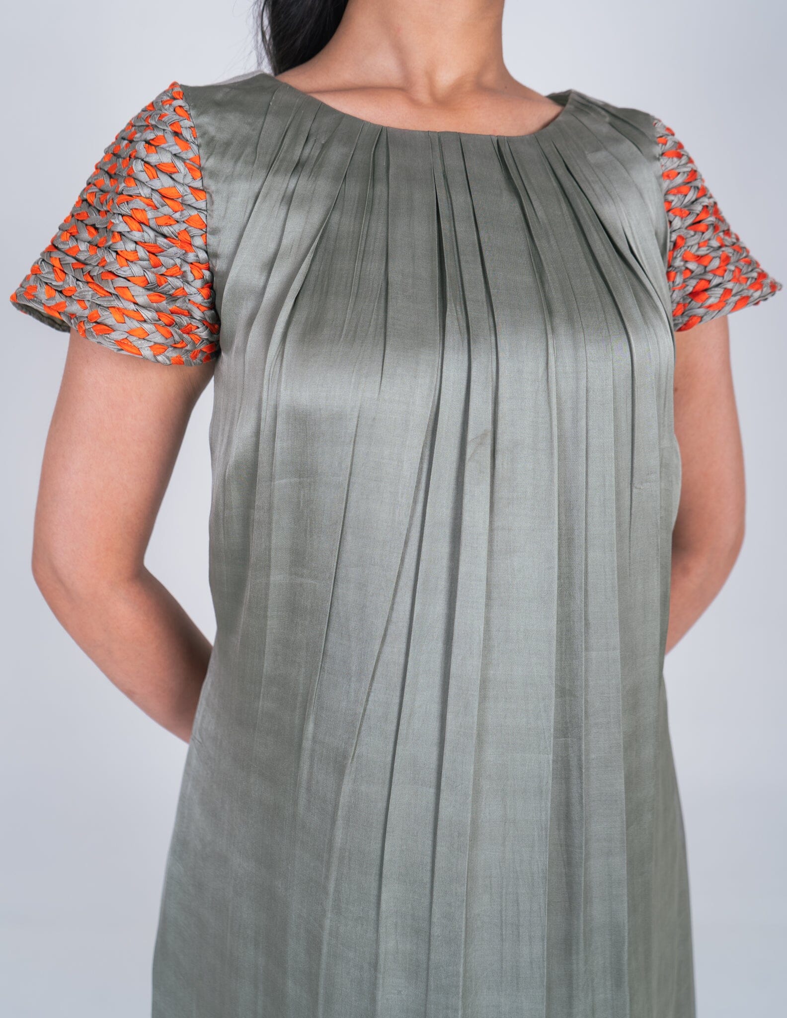 Green-Orange Braided Sleeve Midi Dress