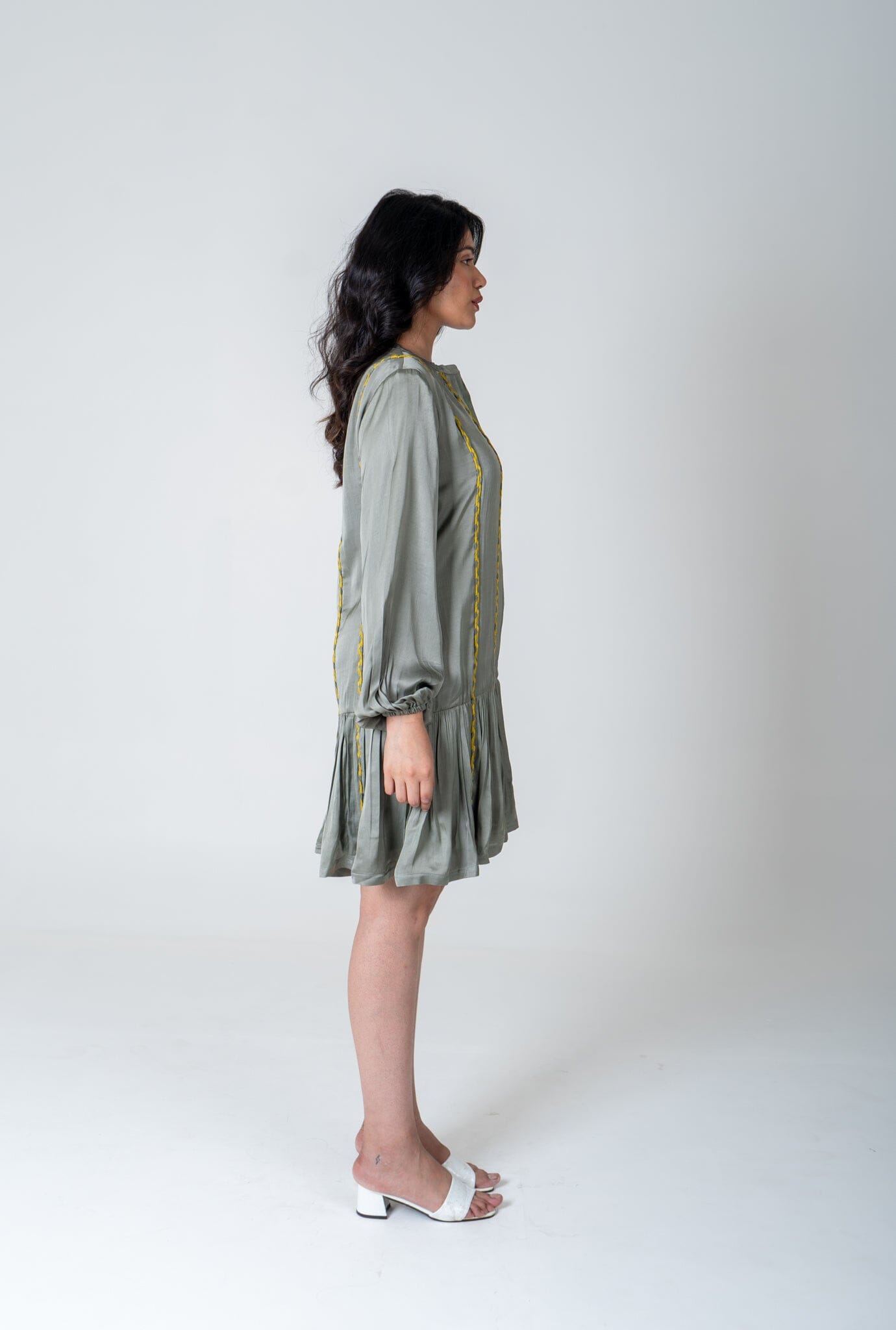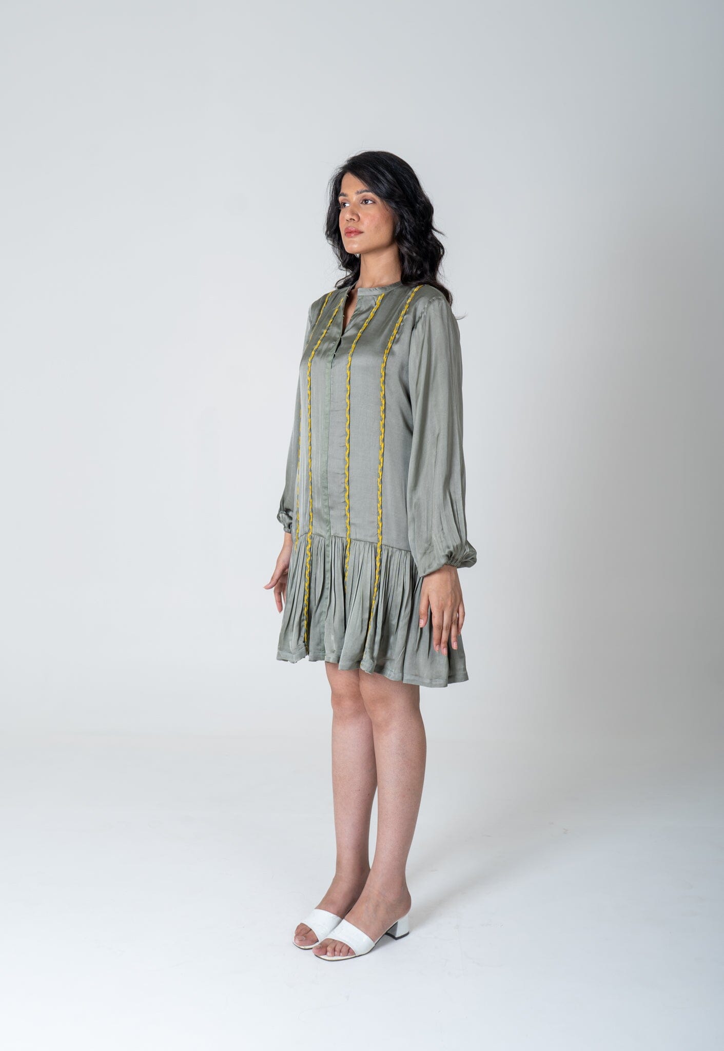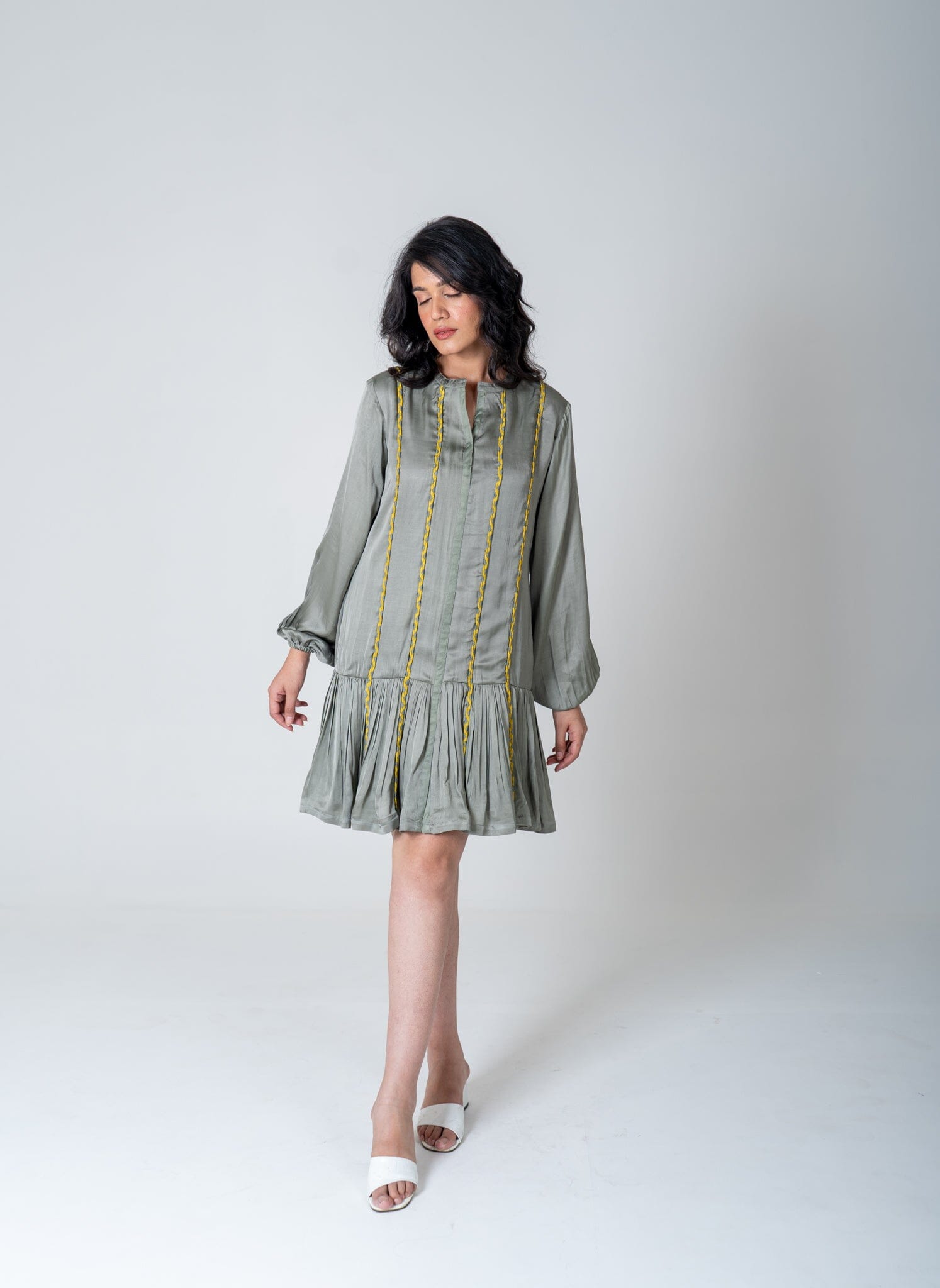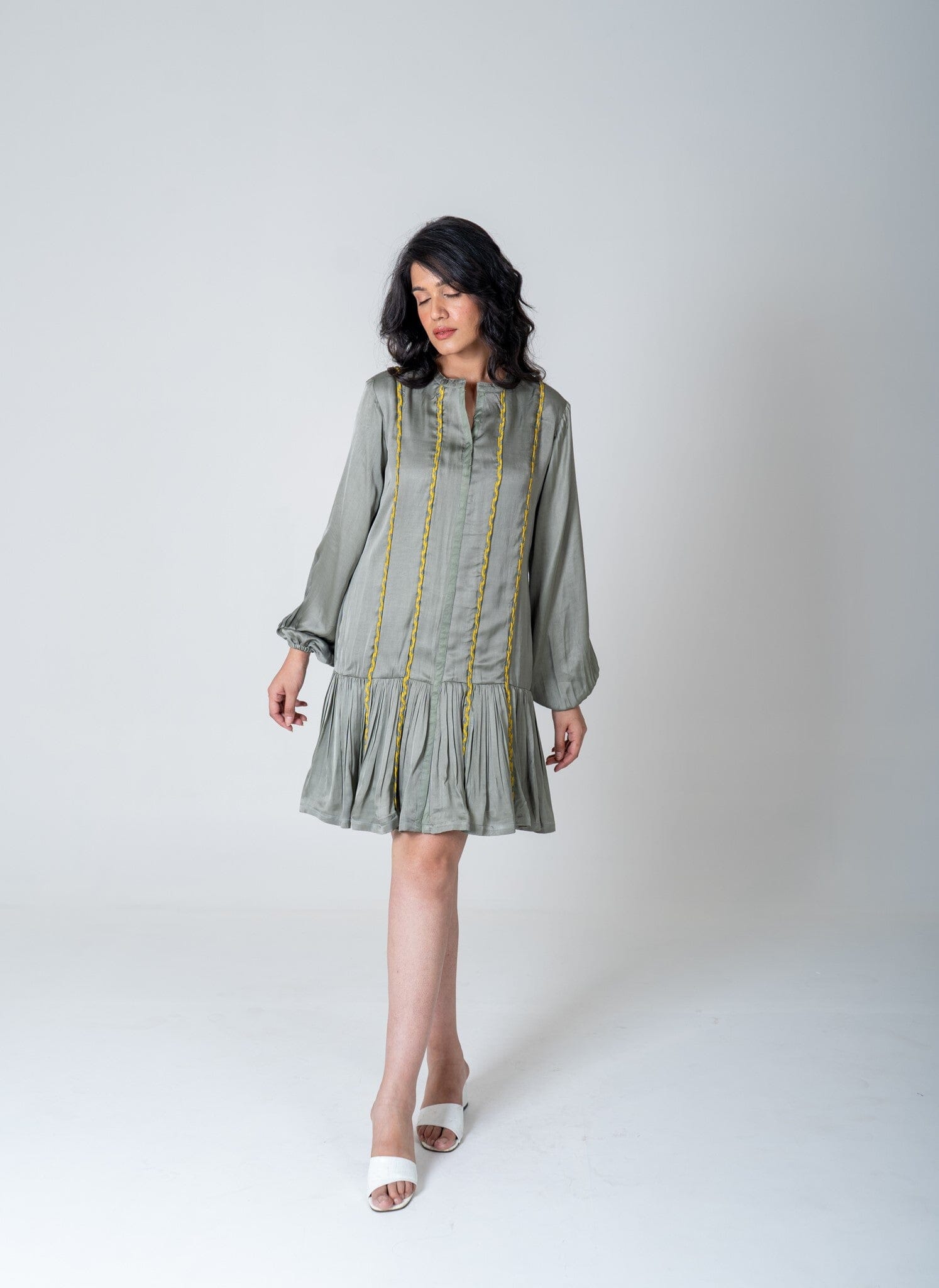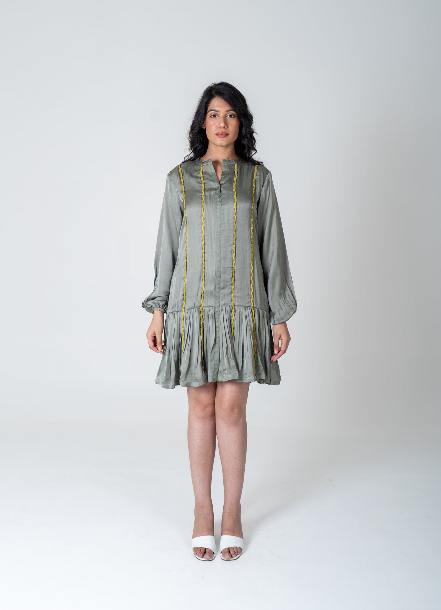 Green-Yellow Braided Short Gather Dress
