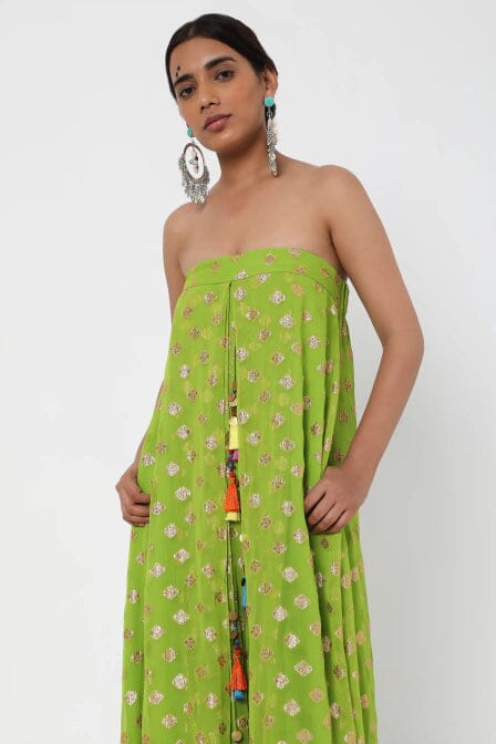 This indo-western is jumpsuit is the ultimate stunner you need to nail the festive fusion dictum. Customised with golden embellished buttis, the jumpsuit is draped in an asymmetric hem and embellished with colourful tassels and coins. Style the look with pop-coloured accessories for a Holi party. Keep it effortlessly chic for pre-wedding affairs, styling the look with statement danglers and juttis.