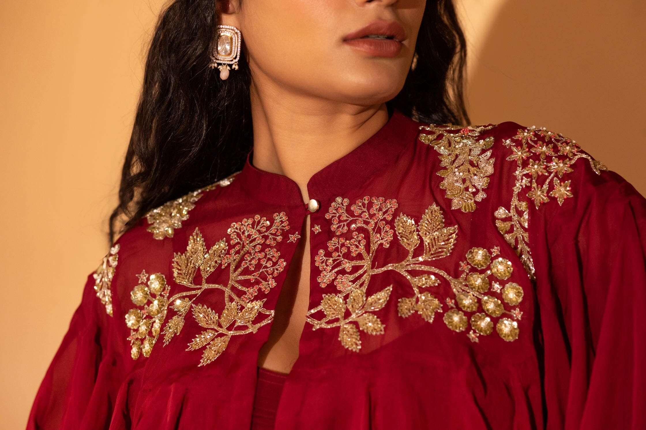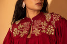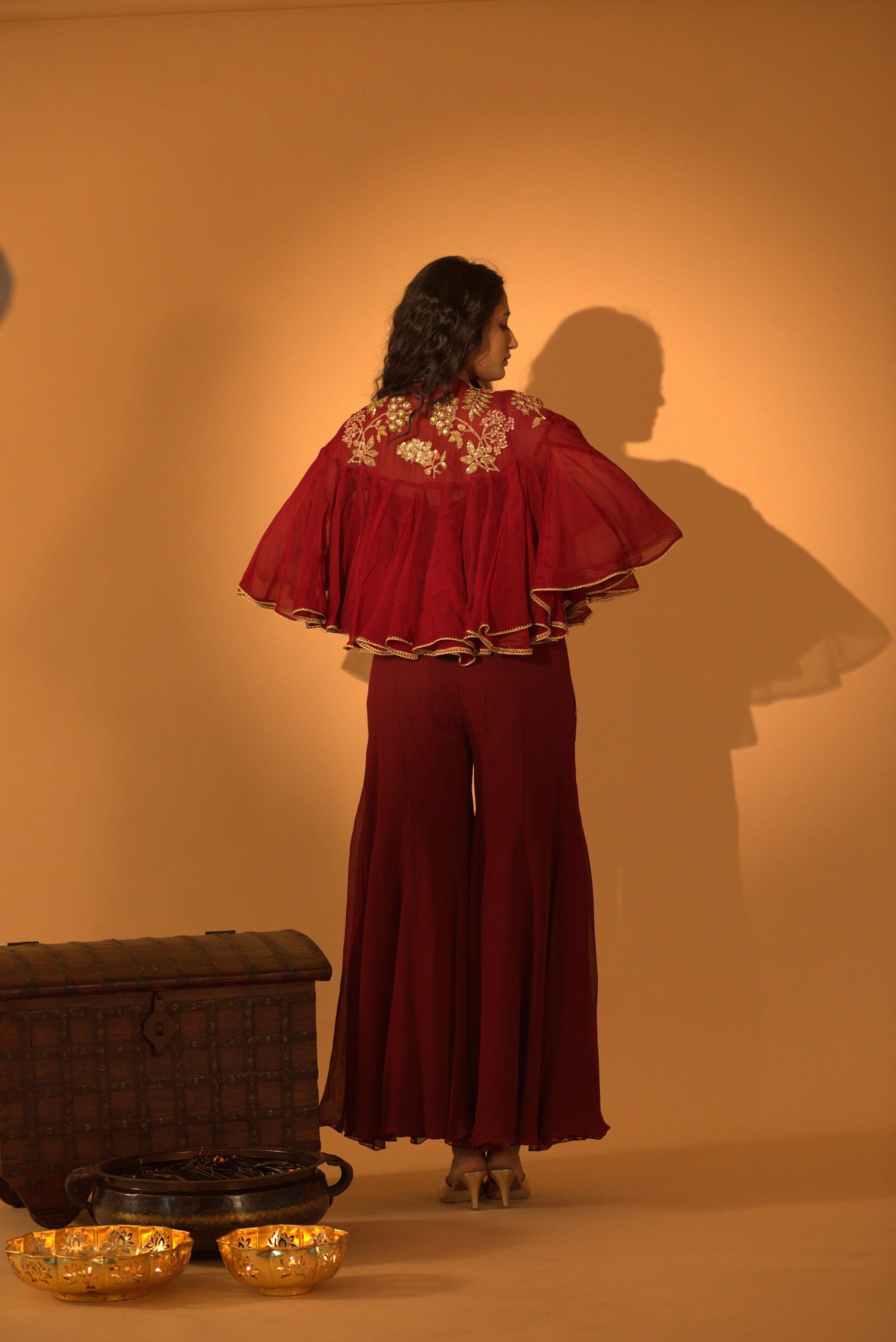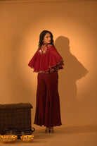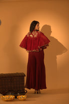 A maroon jumpsuit made of georgette with hand-detailed pockets, paired with a hand-embroidered cape finished with a bor. A jumpsuit with embroidered cape.