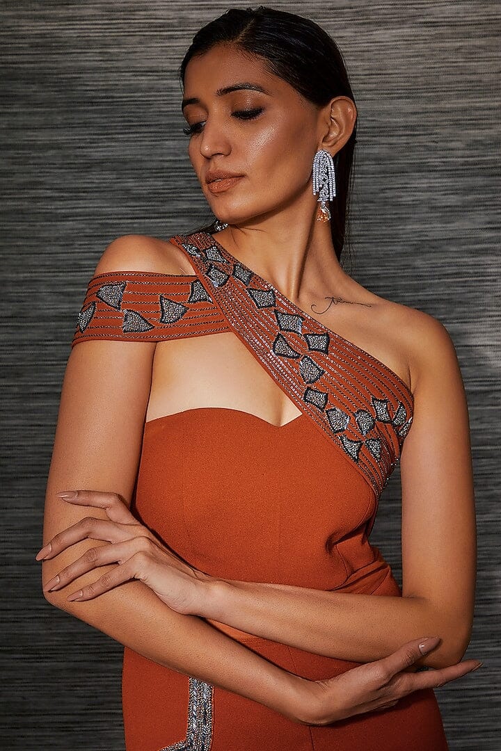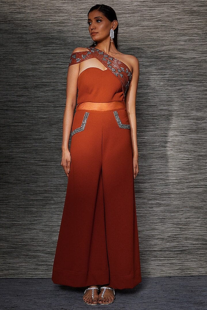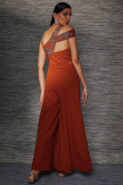 Introducing our stunning rust embroidered jumpsuit, featuring a unique one-shoulder embroidered strap for a touch of sophistication. The gunmetal-coloured embroidery and sheer net detailing on the waist add a glamorous edge, perfect for any cocktail event. This stylish and elegant chic jumpsuit is versatile enough to be worn for a day or evening occasion, making it a must-have addition to your wardrobe.