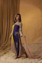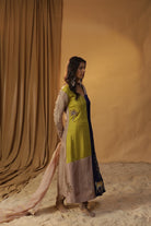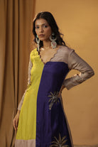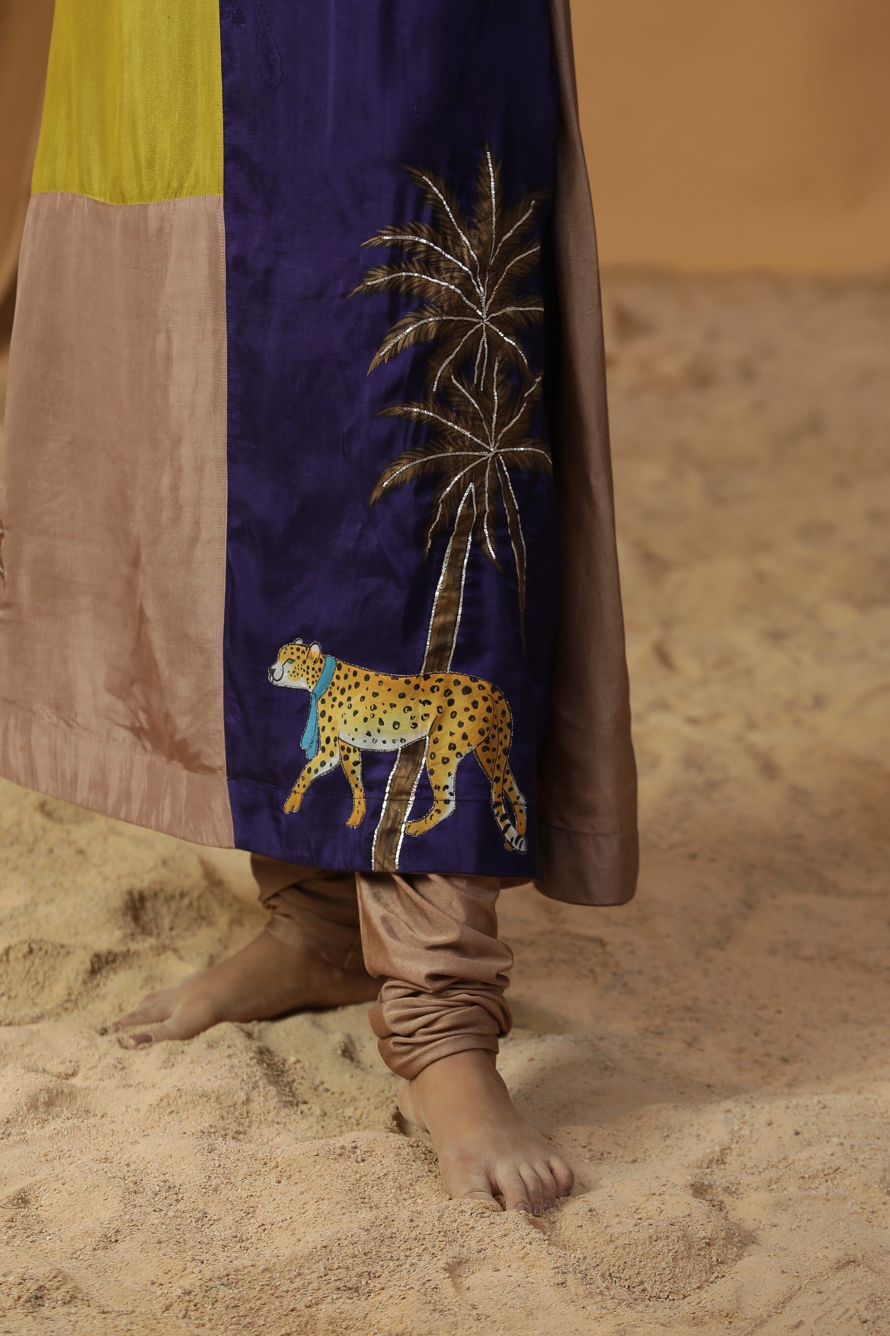 Featuring our blue block print leopard scarf suit set with gota work on the kurta. Comes with churidaar and dupatta.