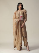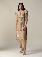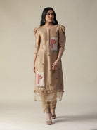 Featuring our chanderi hand painted beige suit set. comes with a straight kurta(chanderi) with hand painting patch work & puff sleeves, straight pant(lurex fabric) with organza cutwork at hem, and leather worked dupatta.