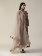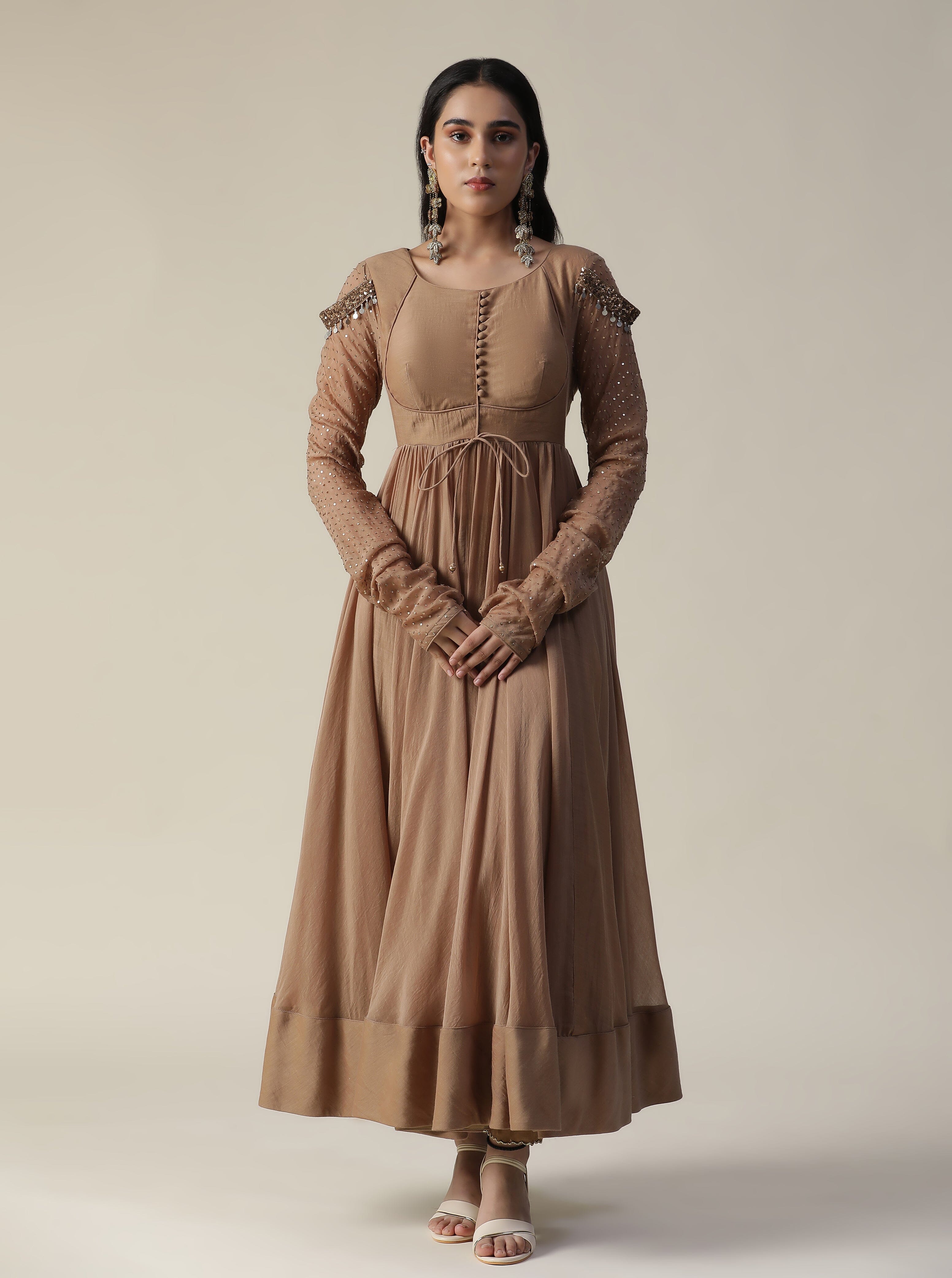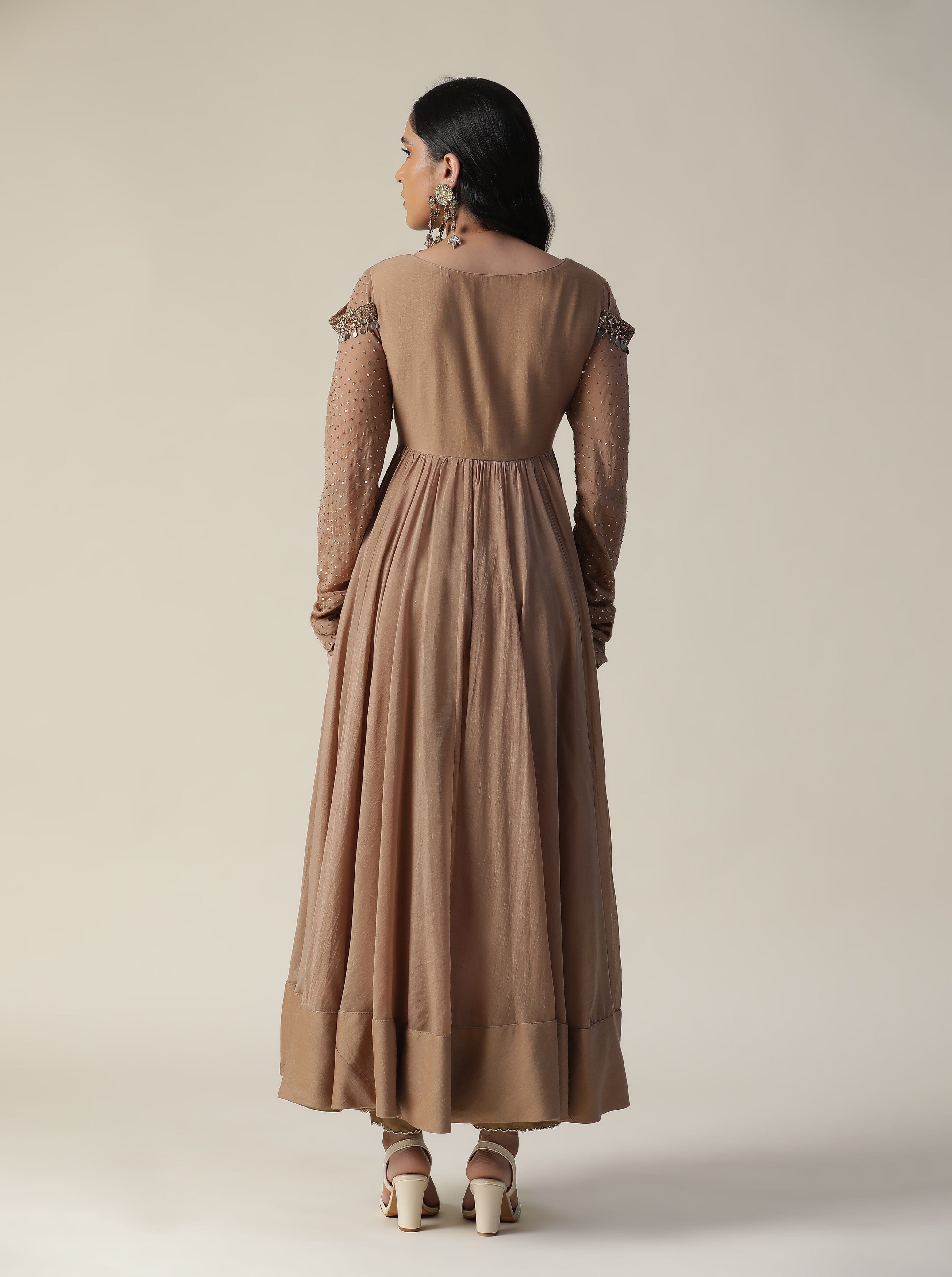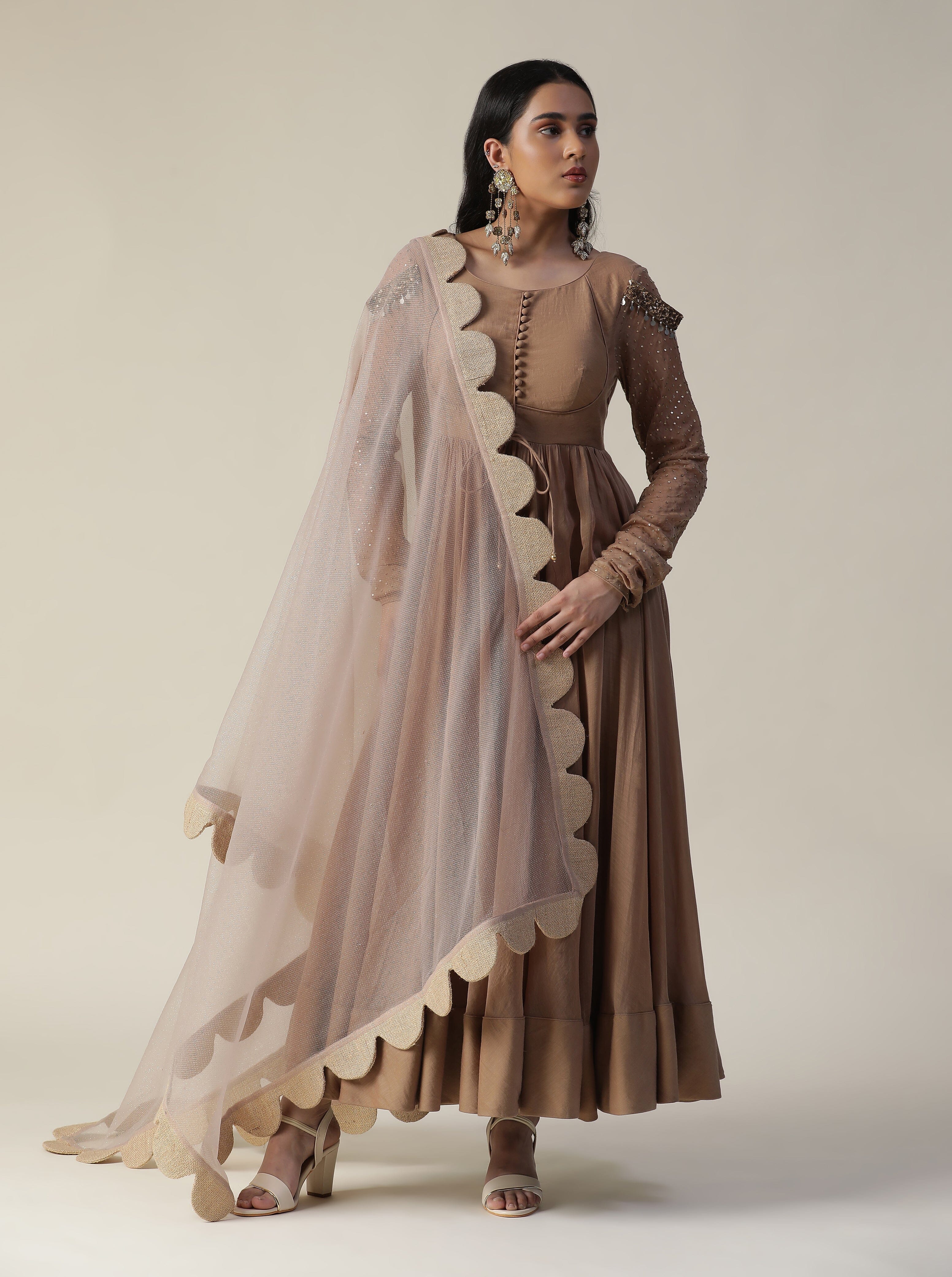 Featuring our cocoa brown chanderi anarkali suit set. Comes with sequence work chudidar sleeve and net cutwork dupatta.