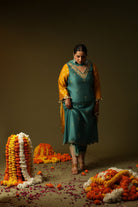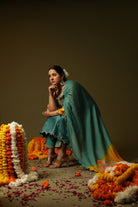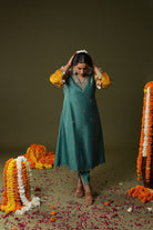 Featuring chanderi silk kurta in firozi color. The aline cut kurta comes with brocade sleeves and a handpainted dupatta.