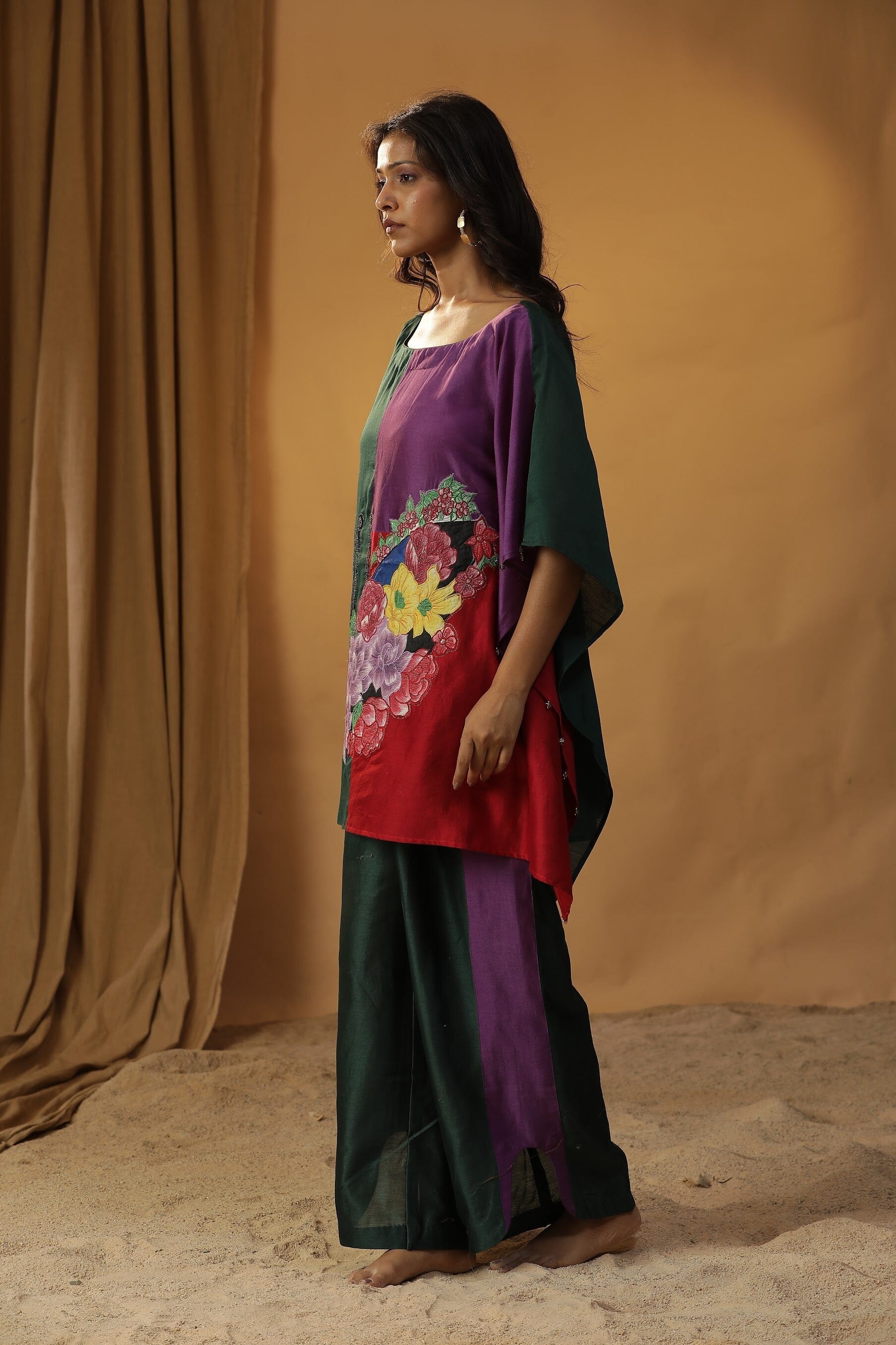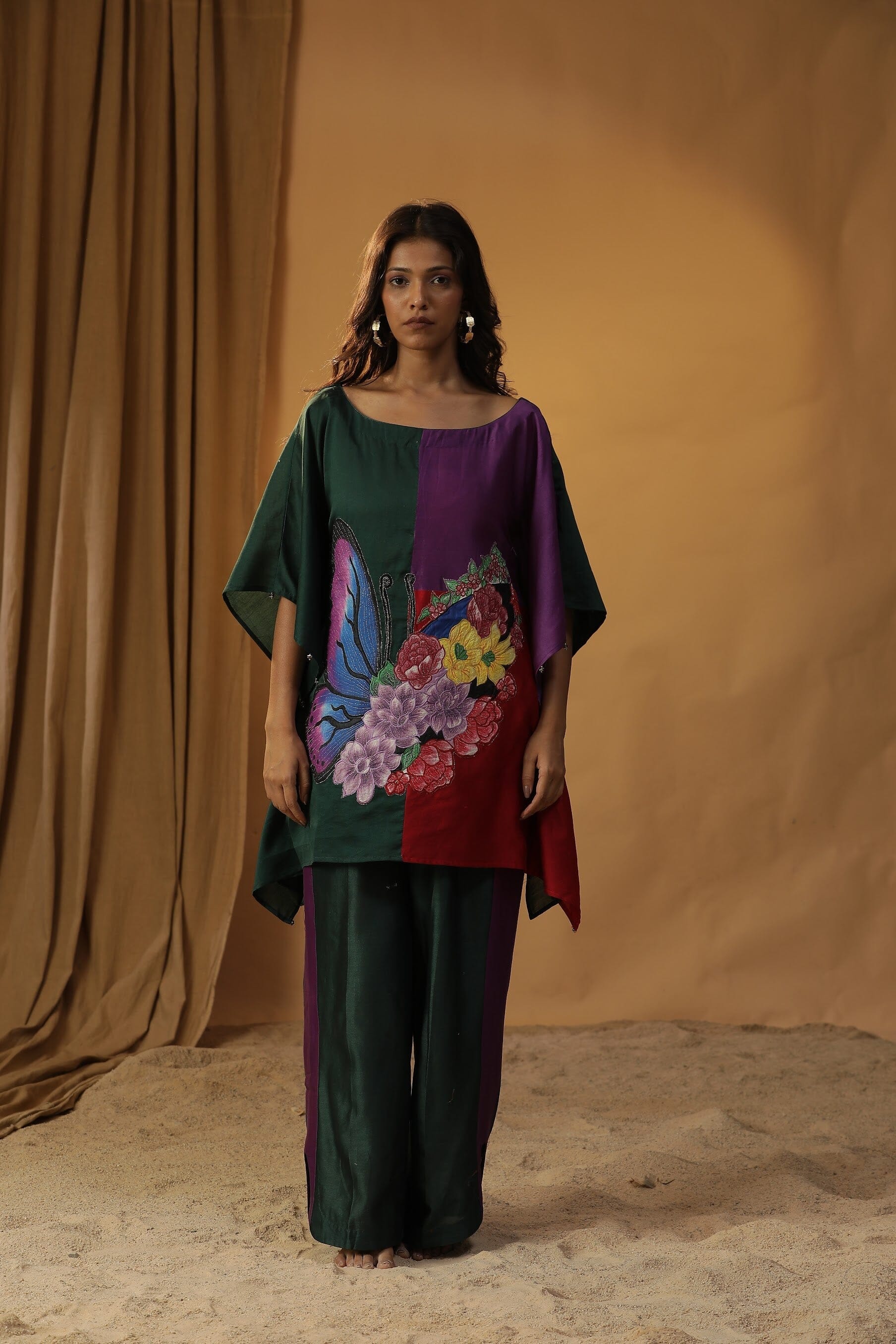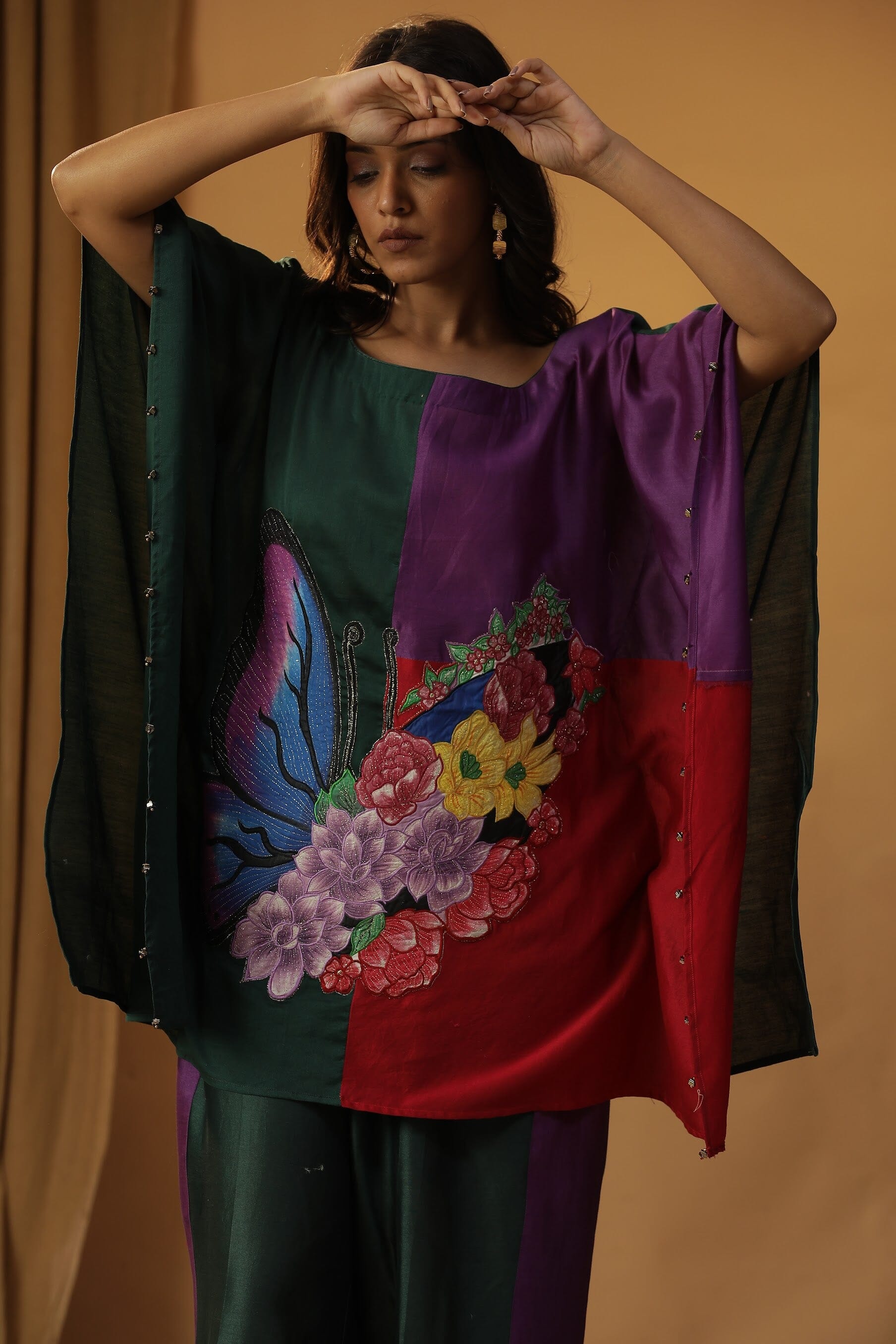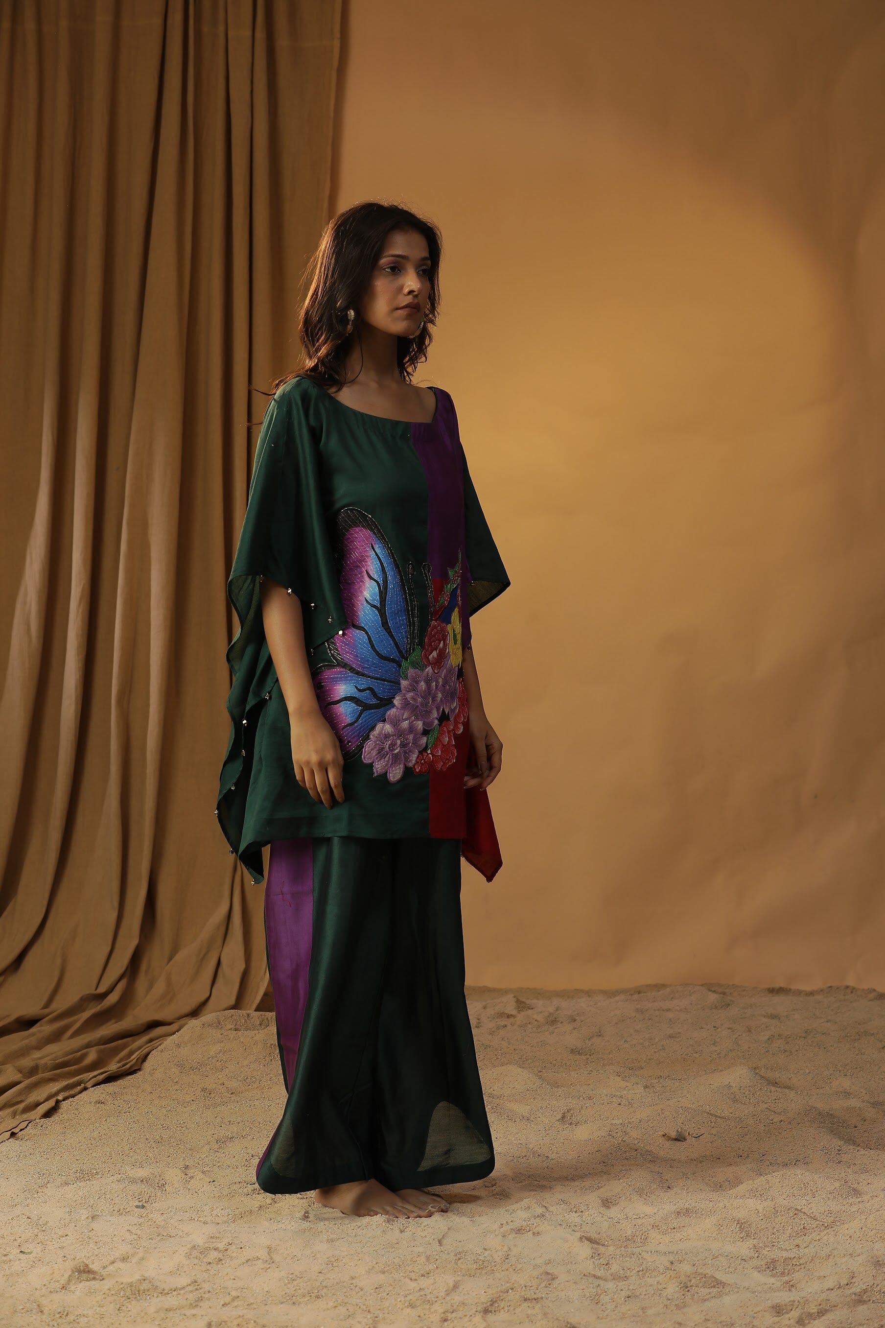 Featuring our Green butterfly block print kaftan co-ord set with handpainted butterfly. Comes with pants.