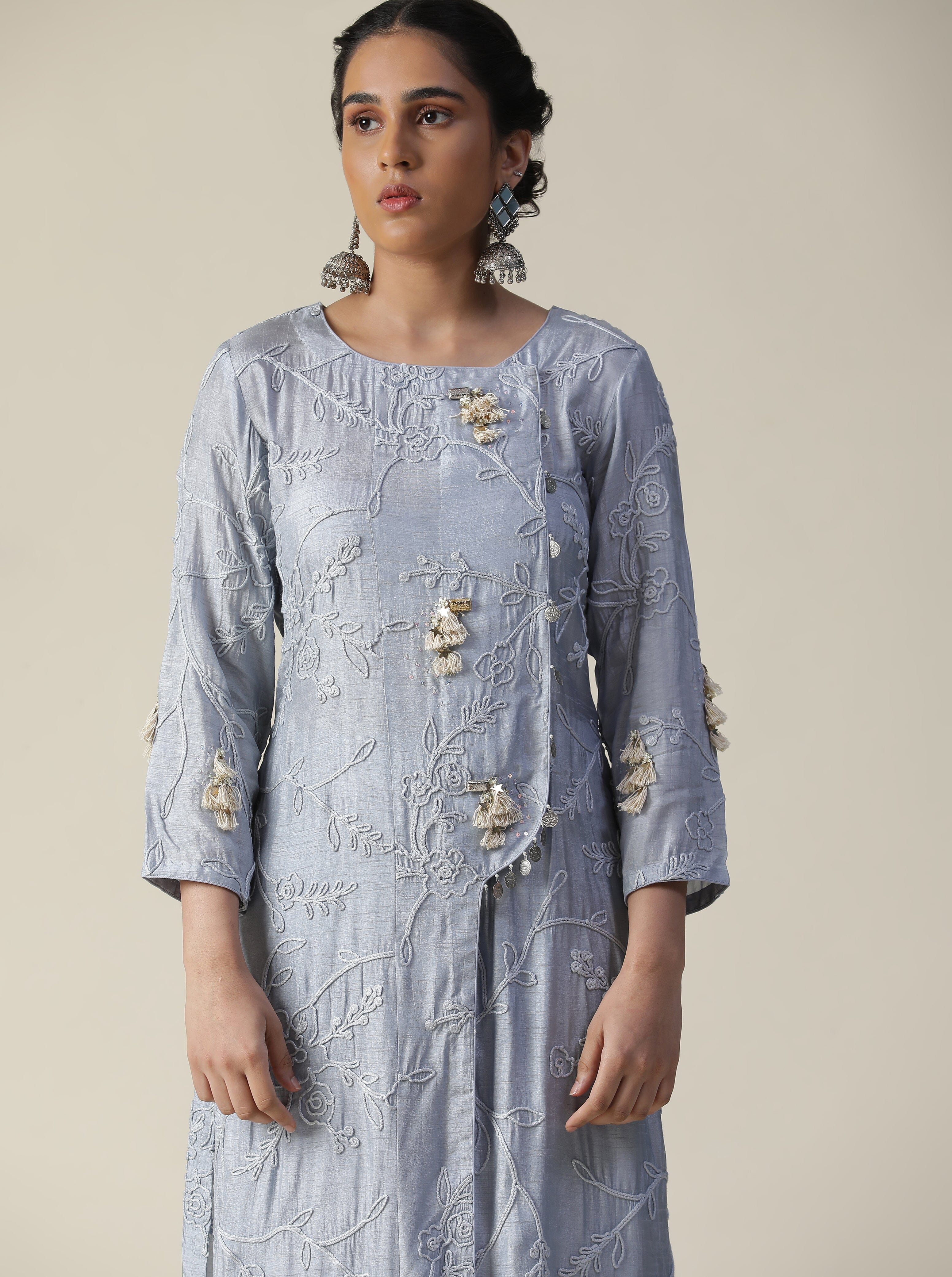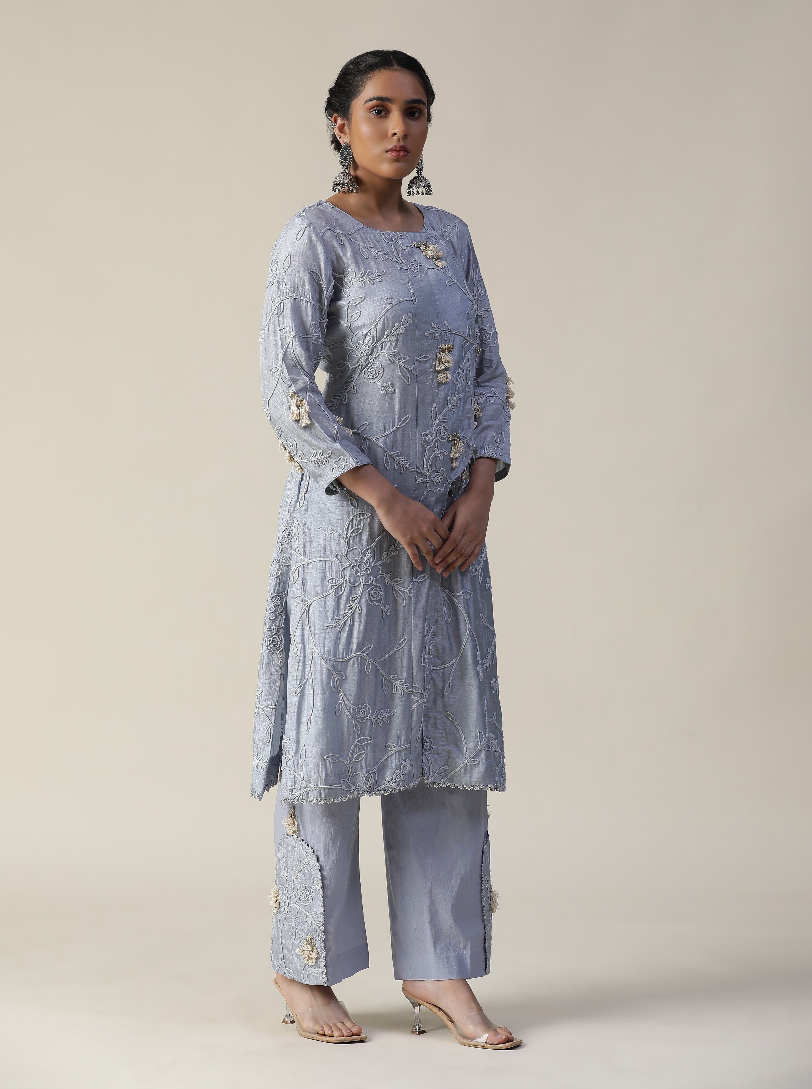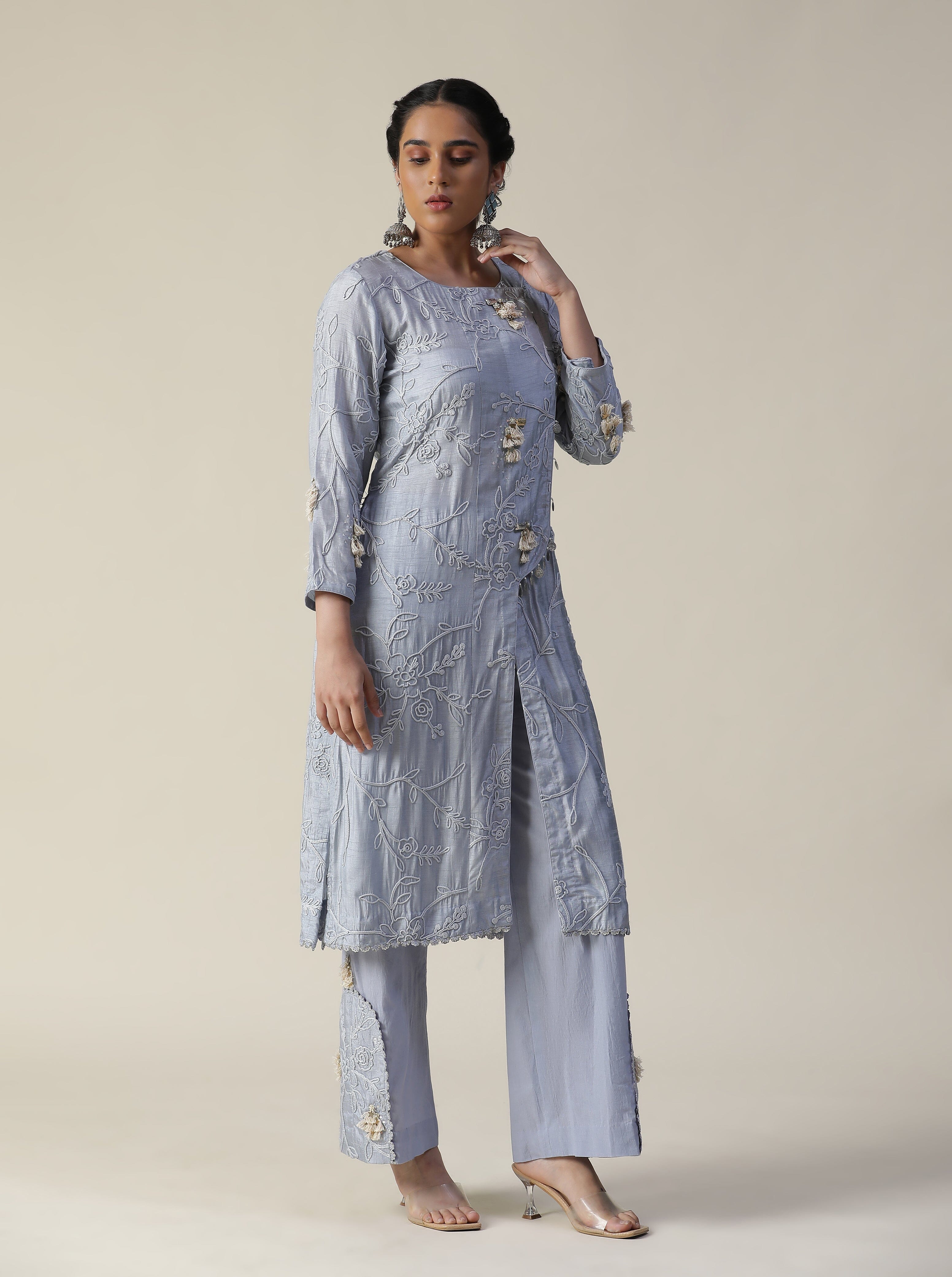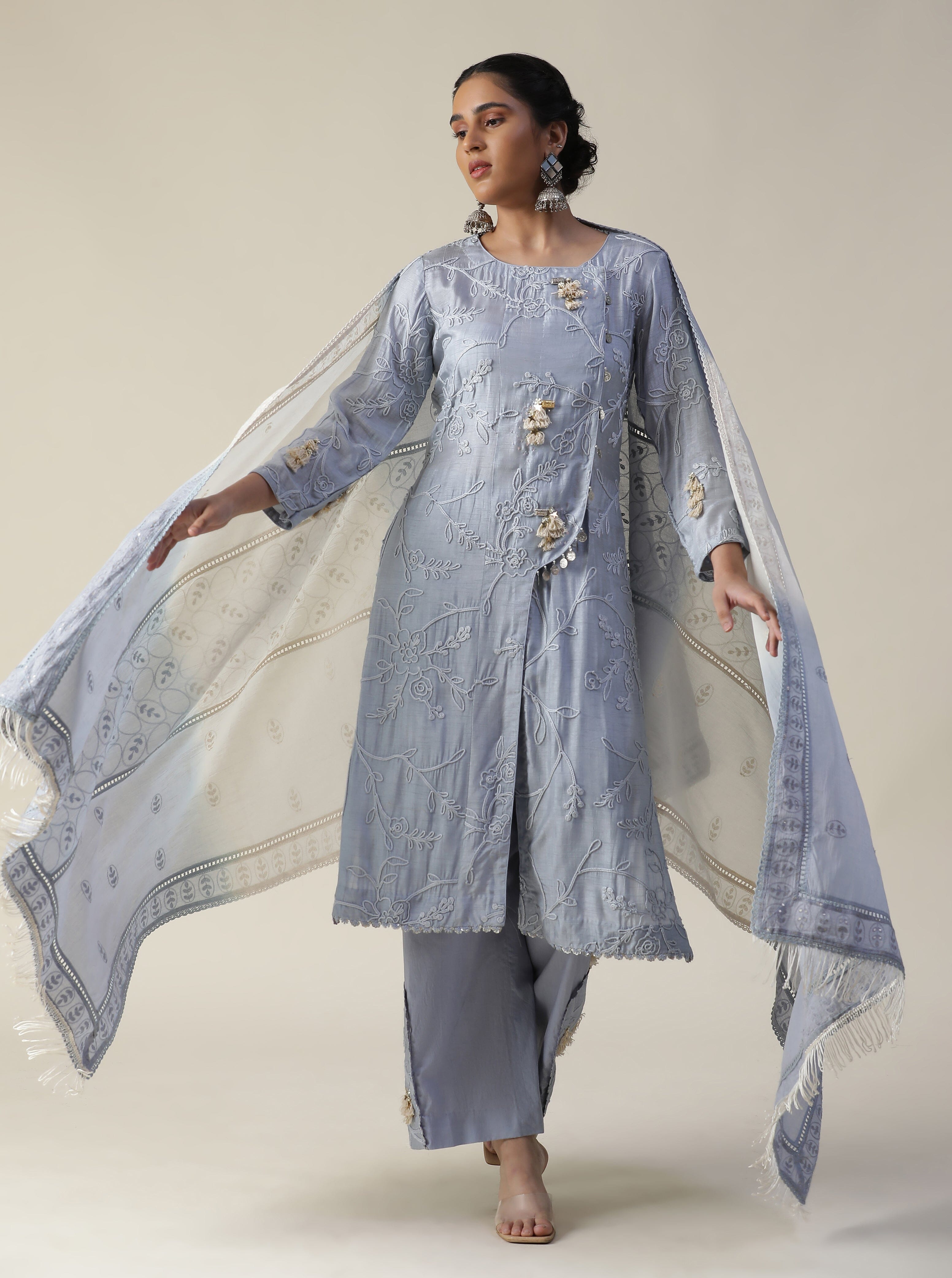 Featuring our ice blue embroidered suit set. Comes with one fully embroidered kurti with front slit and tassel work, one straight pant with embroidery work at side bottom and a thread & sequence embroidered ombre dupatta.