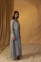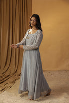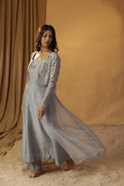 Featuring our ice blue jacket set with embroidered all over the yolk . Comes with a georgette jacket and chanderi tunic.