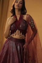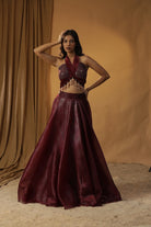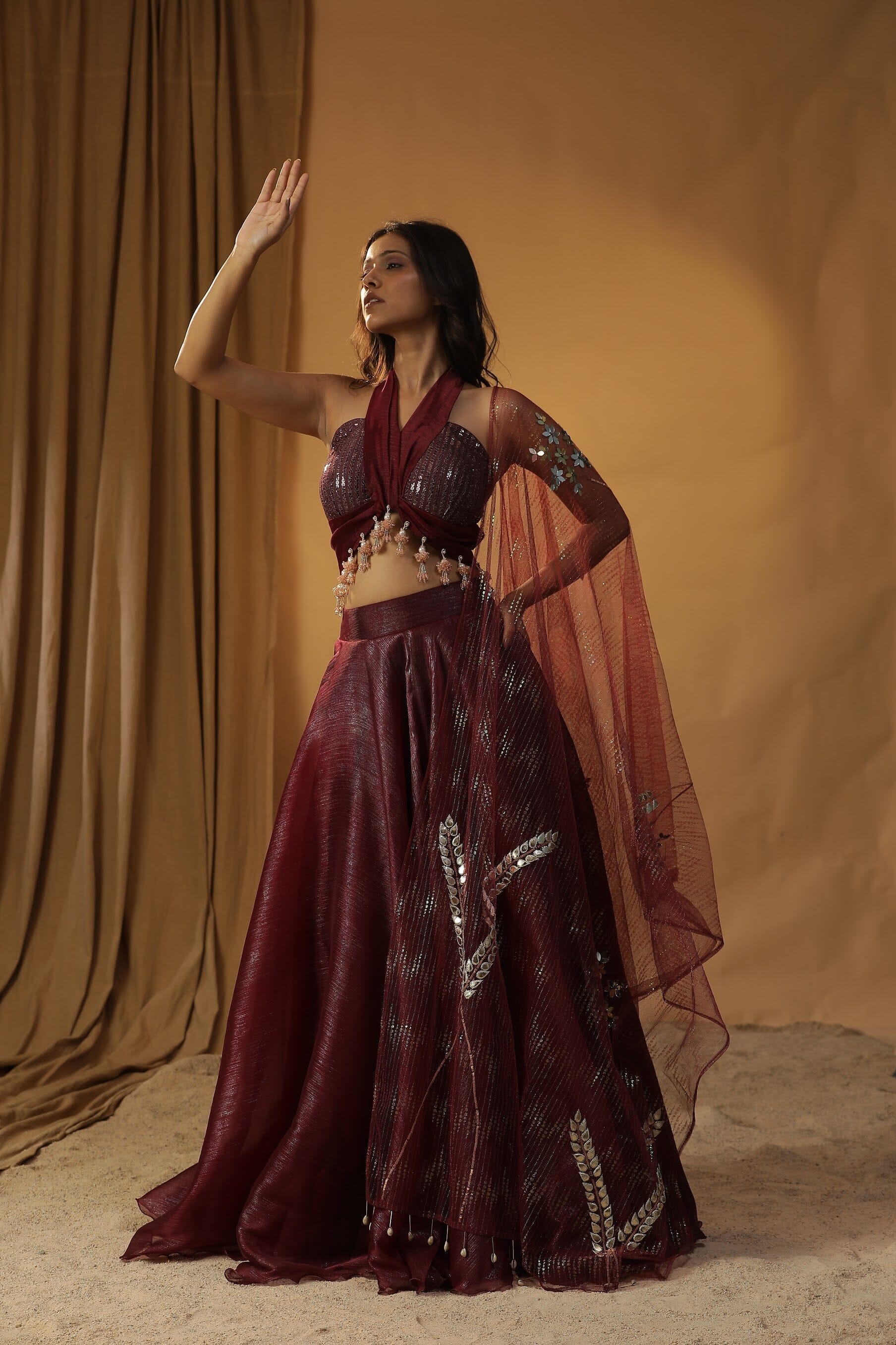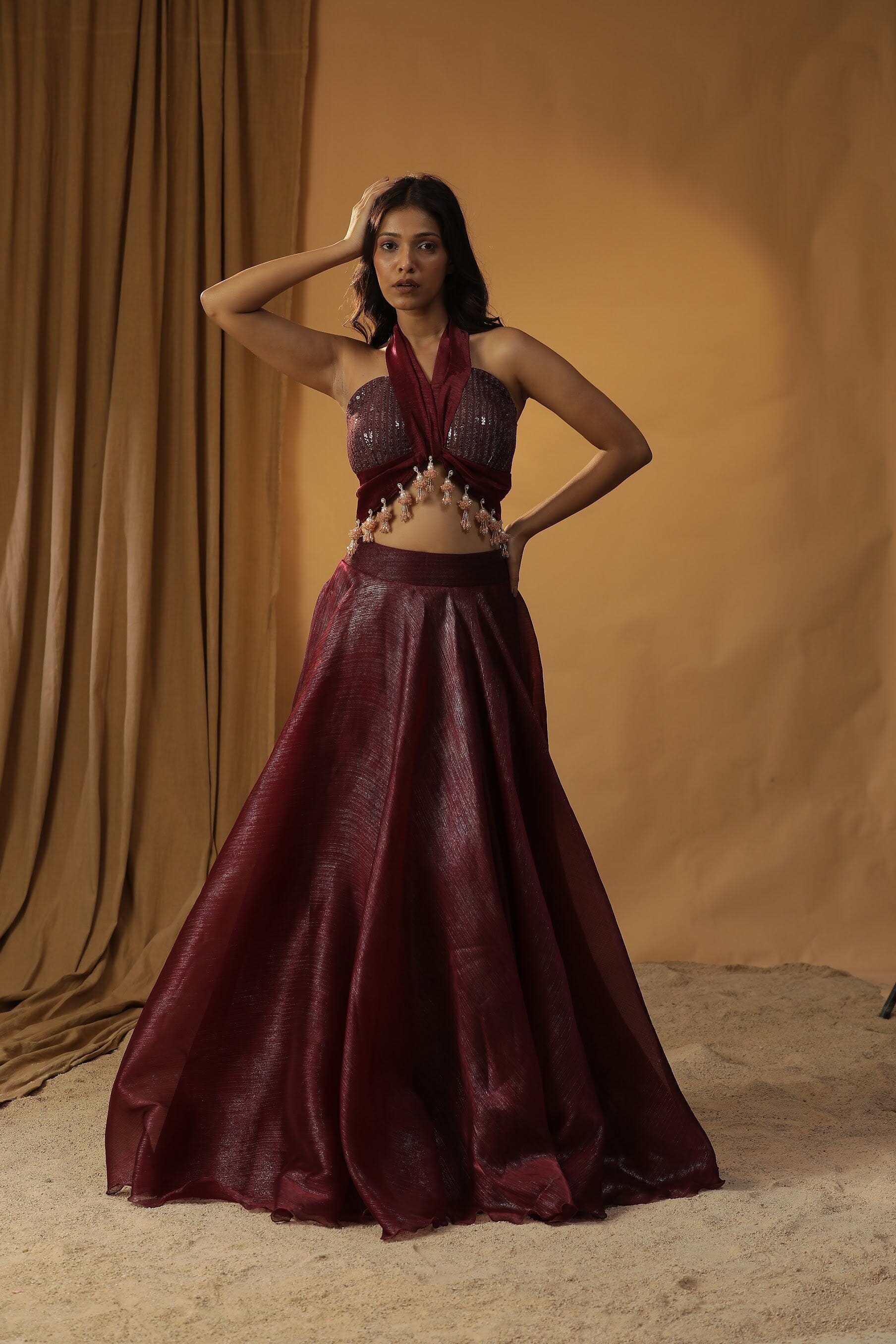 Featuring our Maroon Organza lehenga set with halter neck blouse. Comes with organza skirt and dupatta