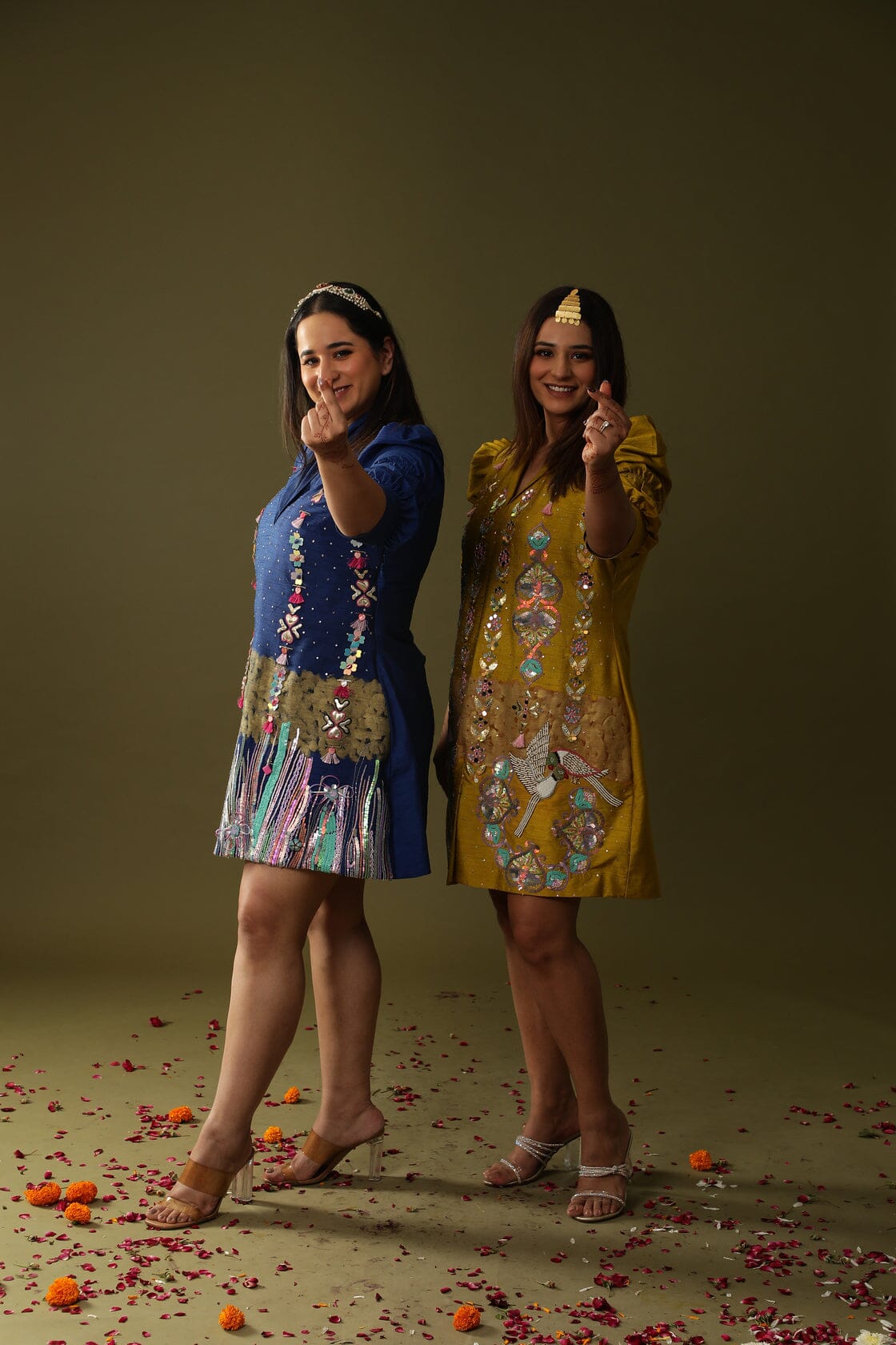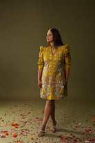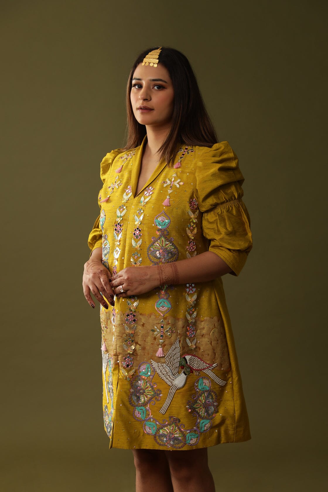 Featuring Mustard green handpainted dress in Raw silk. Detailed with handembroidery and signature arpita sulakshana painting.