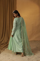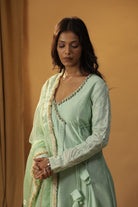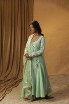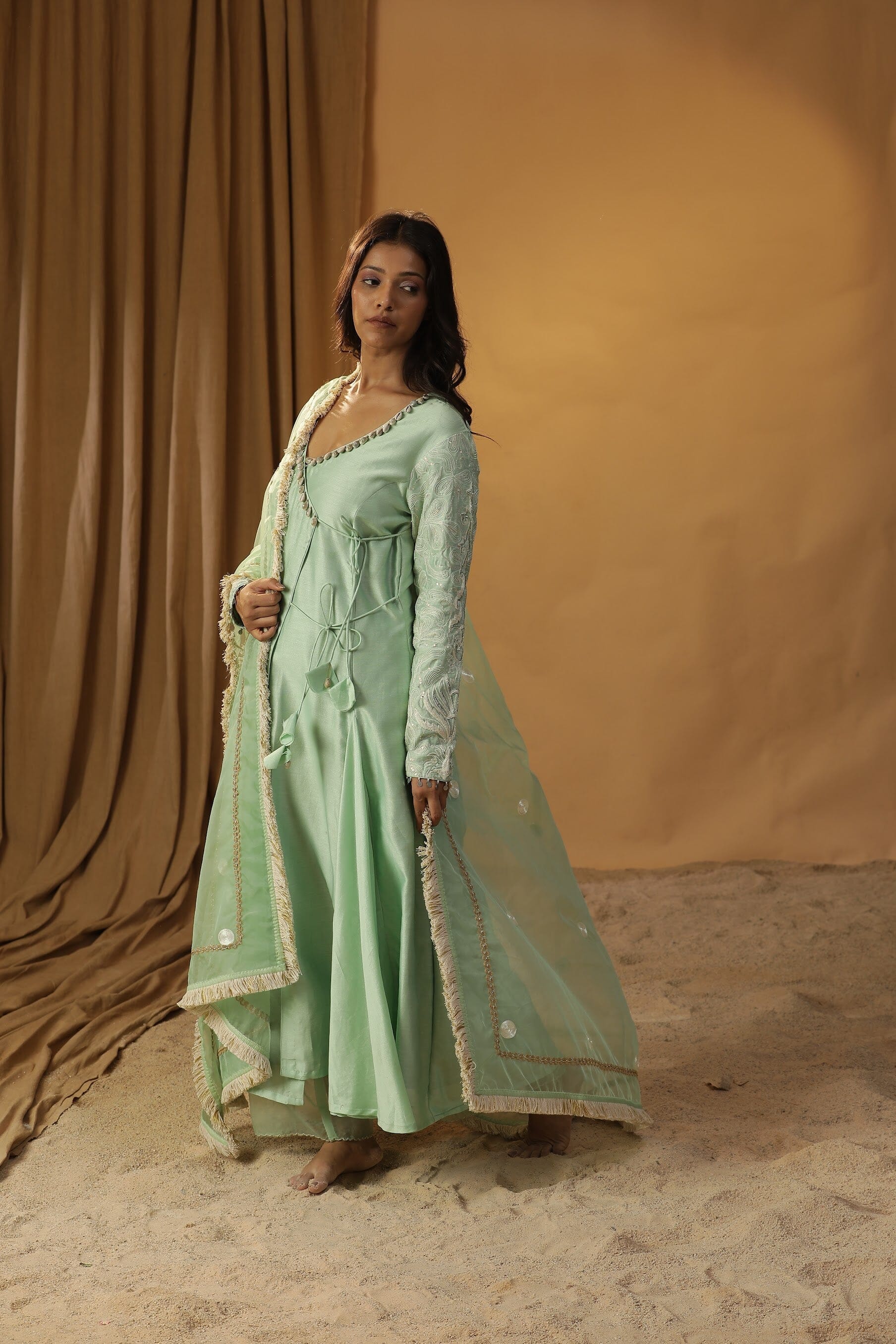 Featuring our pista green angrakha suit set with Dori work all over the sleeves. Comes with pants and organza dupatta