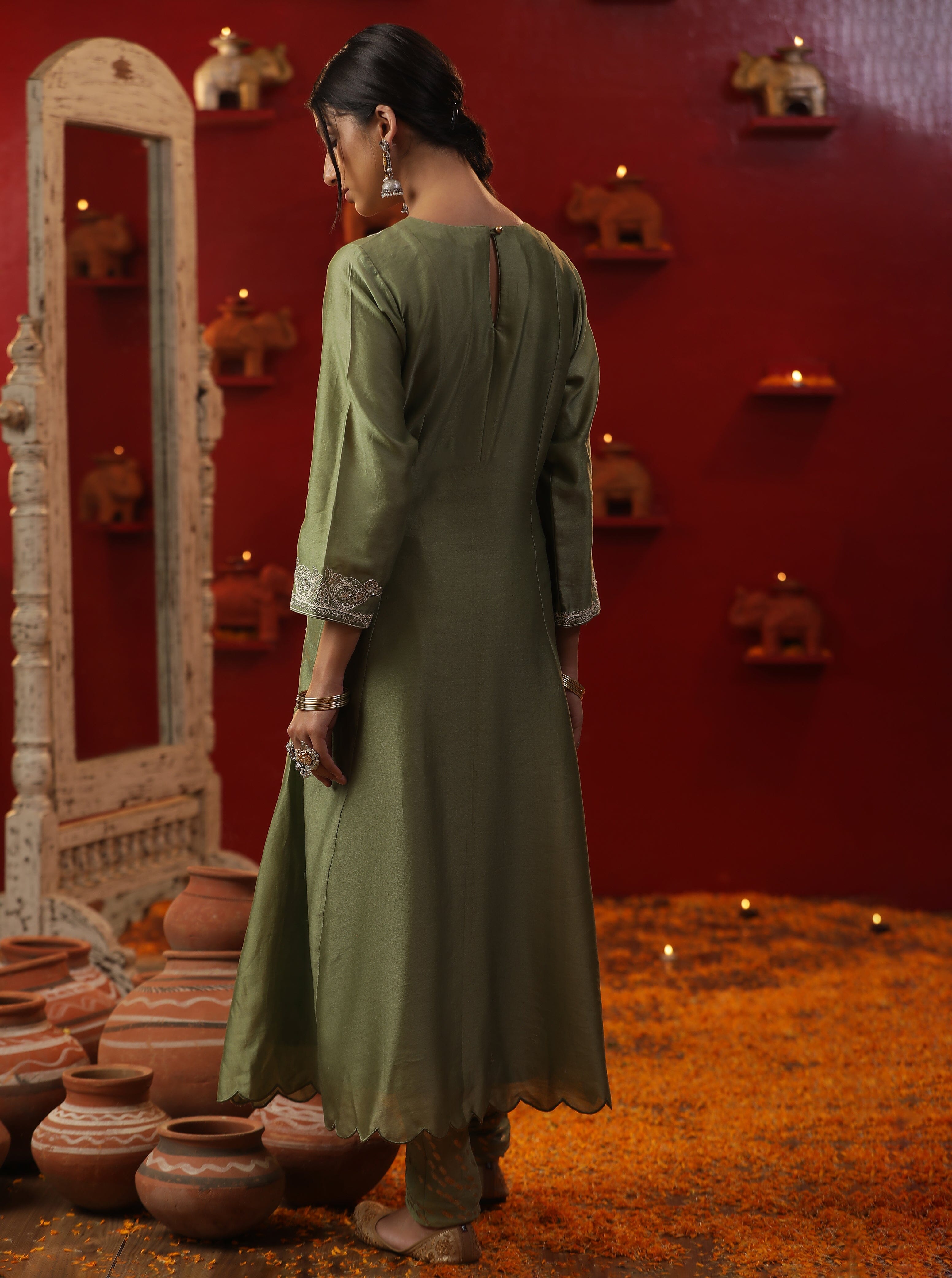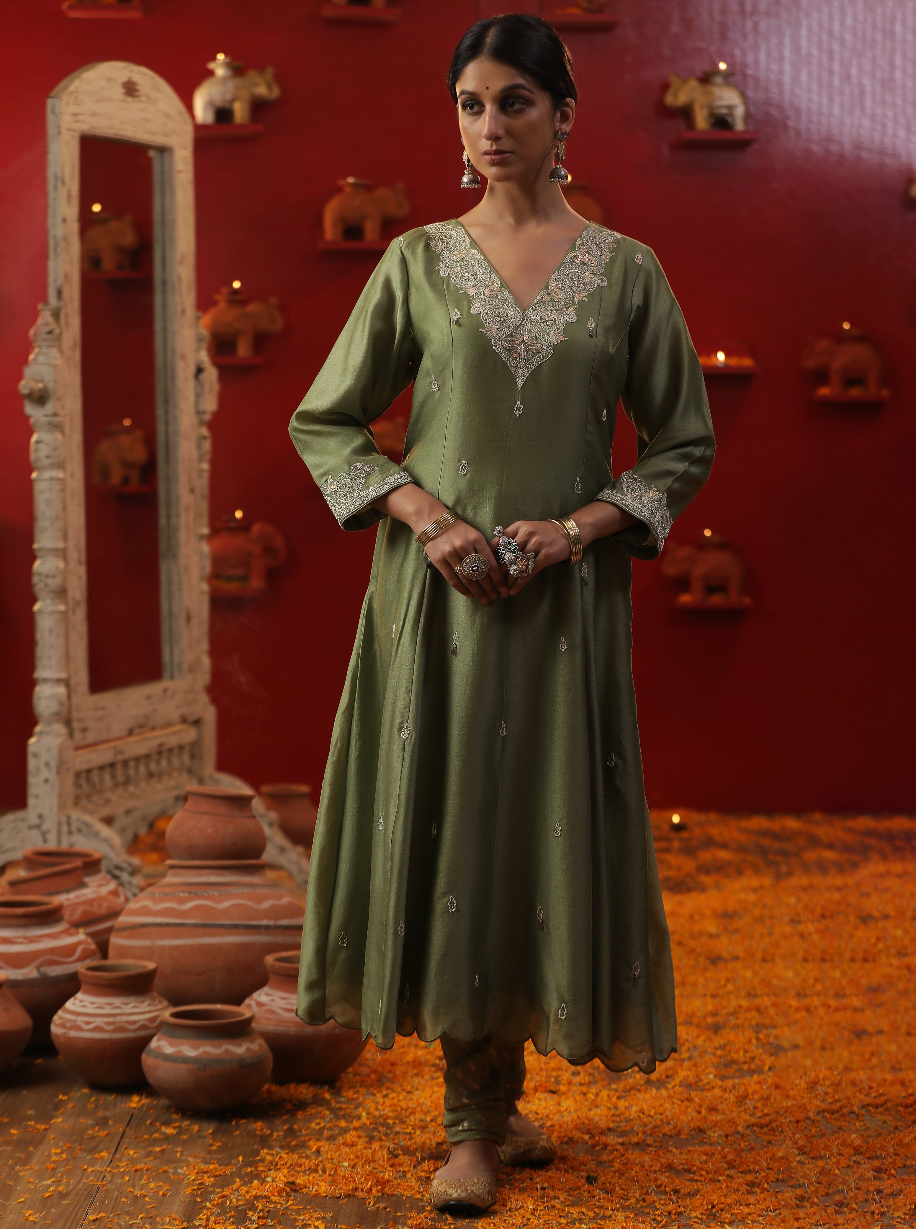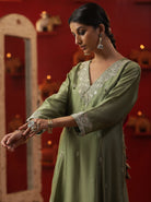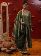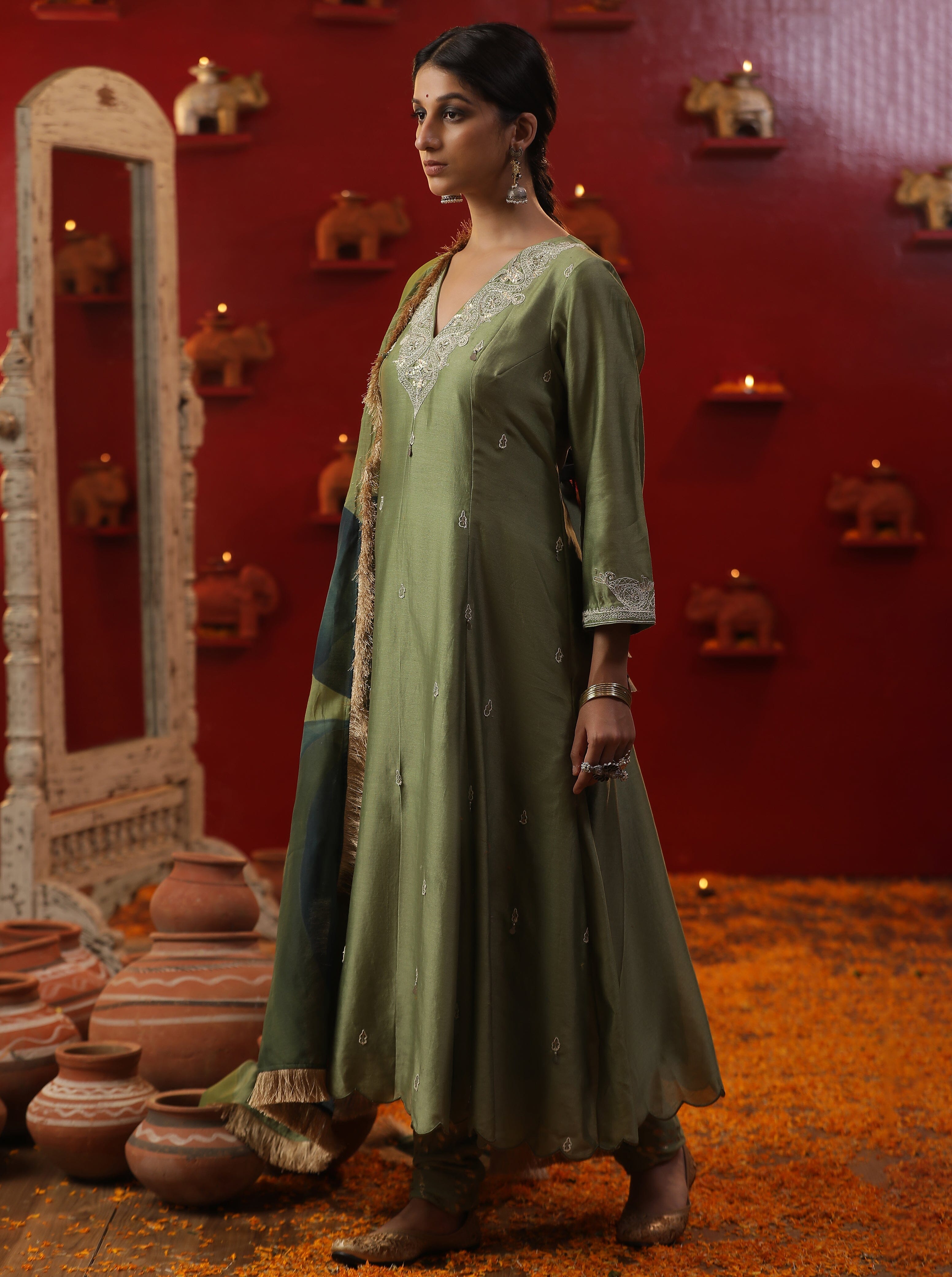 featuring pista green chanderi silk kurta set. Comes with gorgette chuddidar and chanderi handpainted dupatta