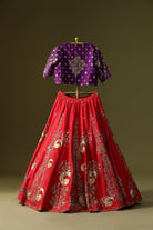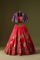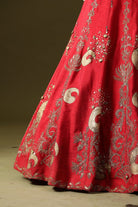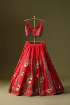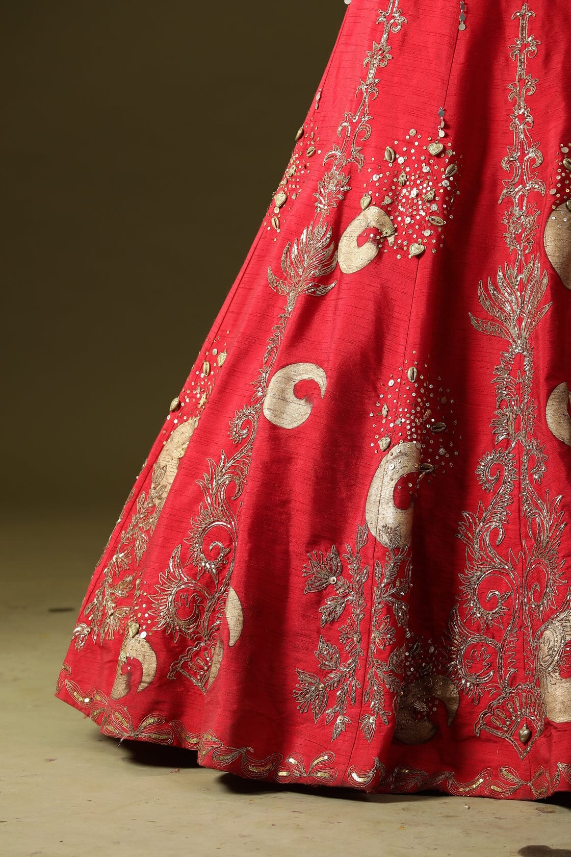 Featuring red raw silk lehnga in handpainting. Comes with hand embroidered blouse and a brocade jacket