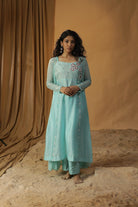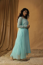 Featuring our sky blue jacket dress with embroidery all over the yolk. Comes with georgette jacket and chanderi tunic.