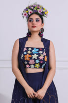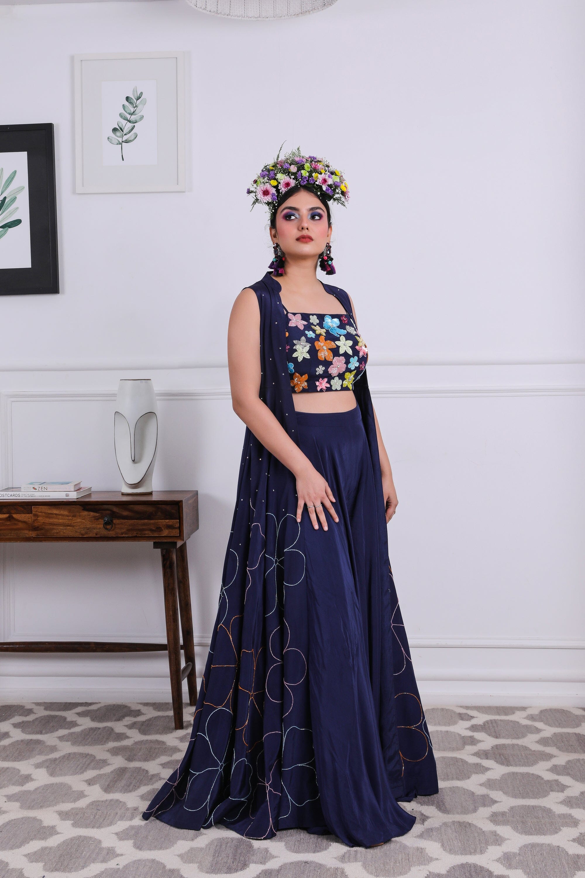 Separates that together make you the show stopper of any event, be it day, or night. Astral Blue embroidered cape, floral crop top complete with flared pants.