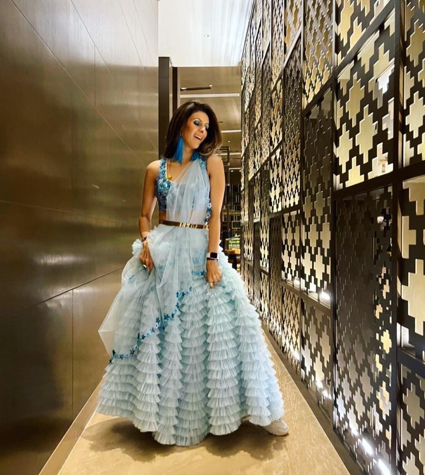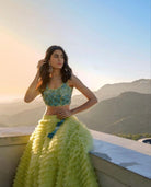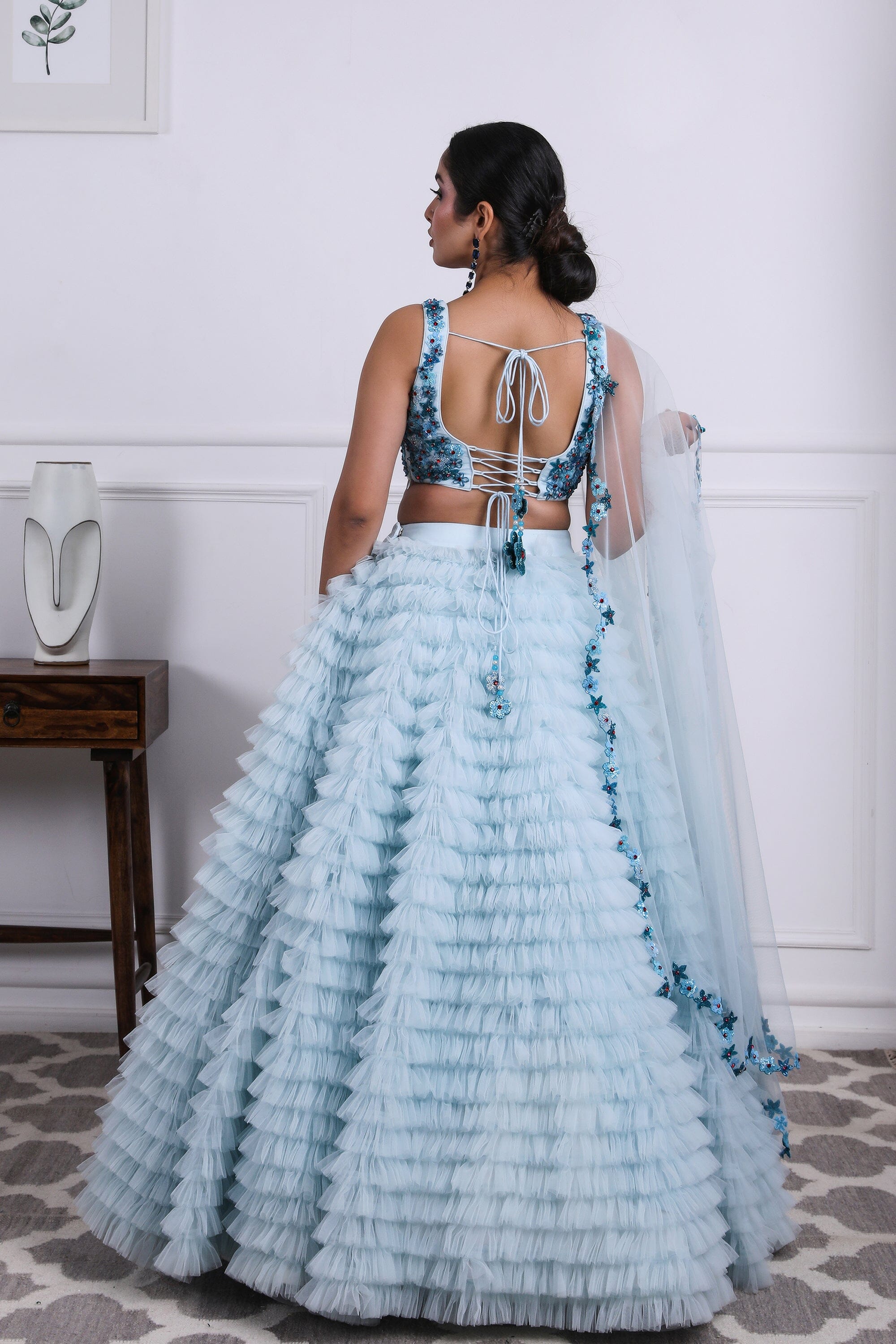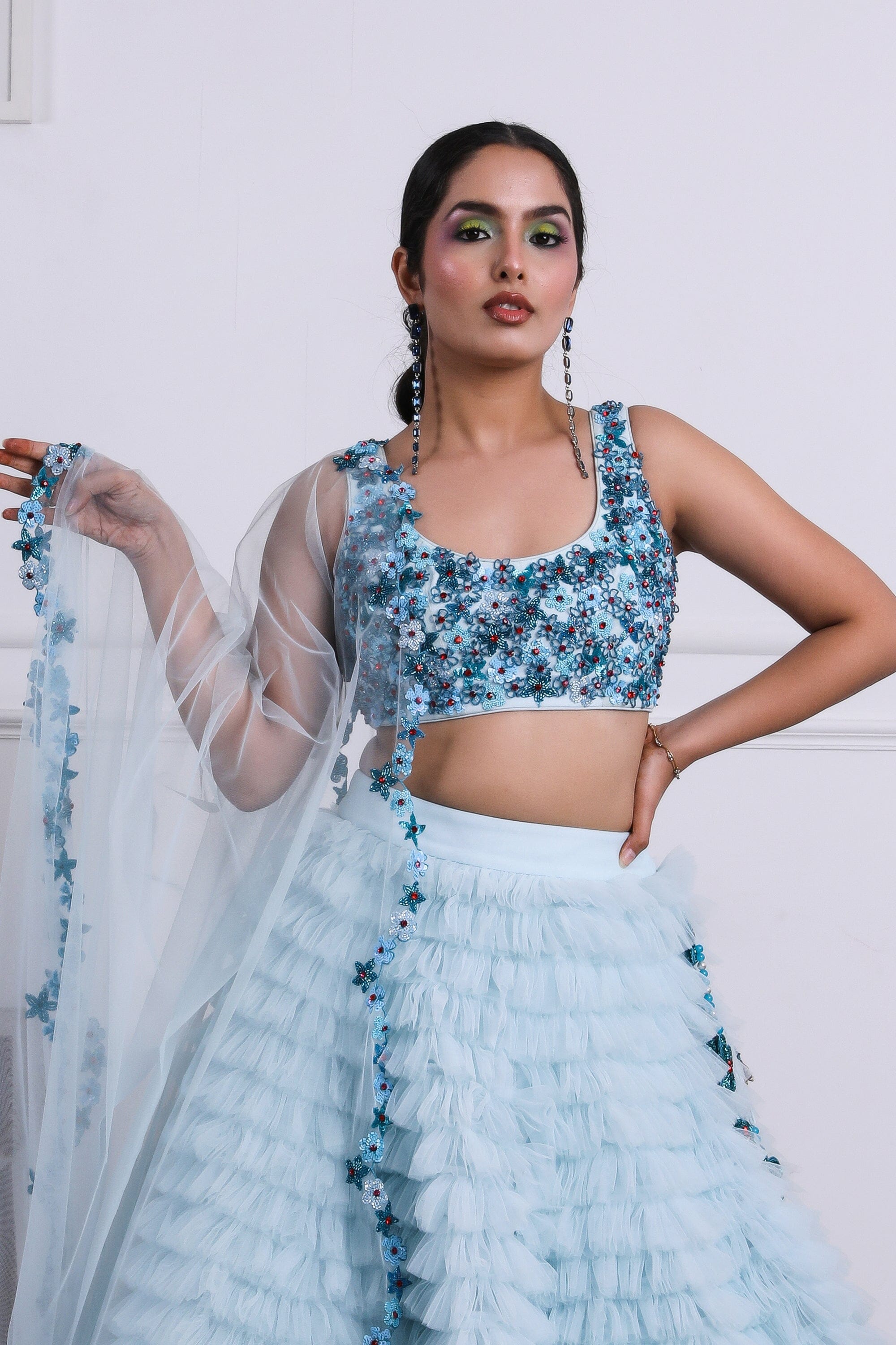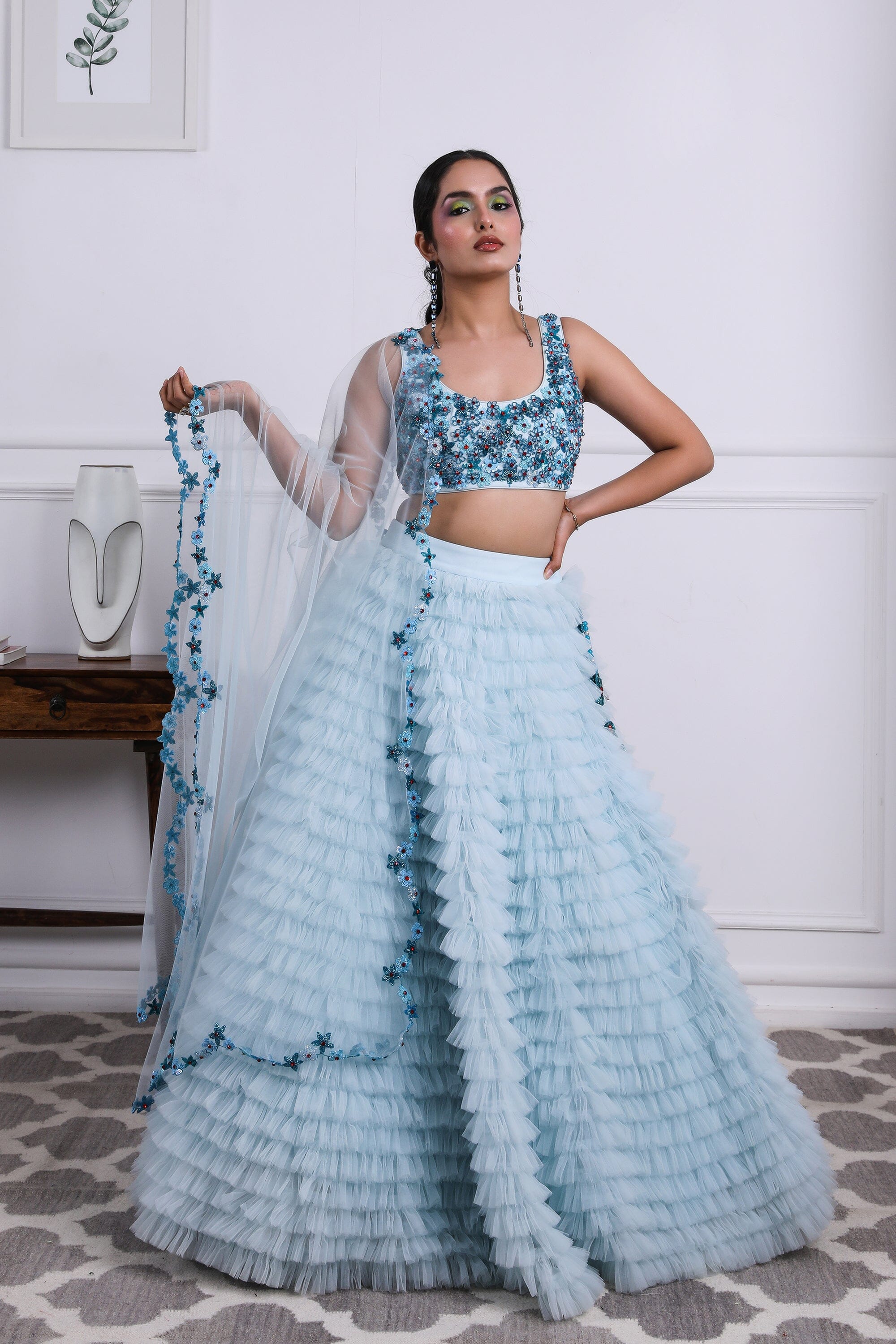 Icy blue tulle ruffled lehnga with tonal 3D embellished floral blouse, complete with our signature cutwork duppatta and hangings.