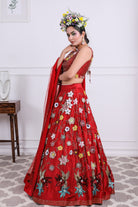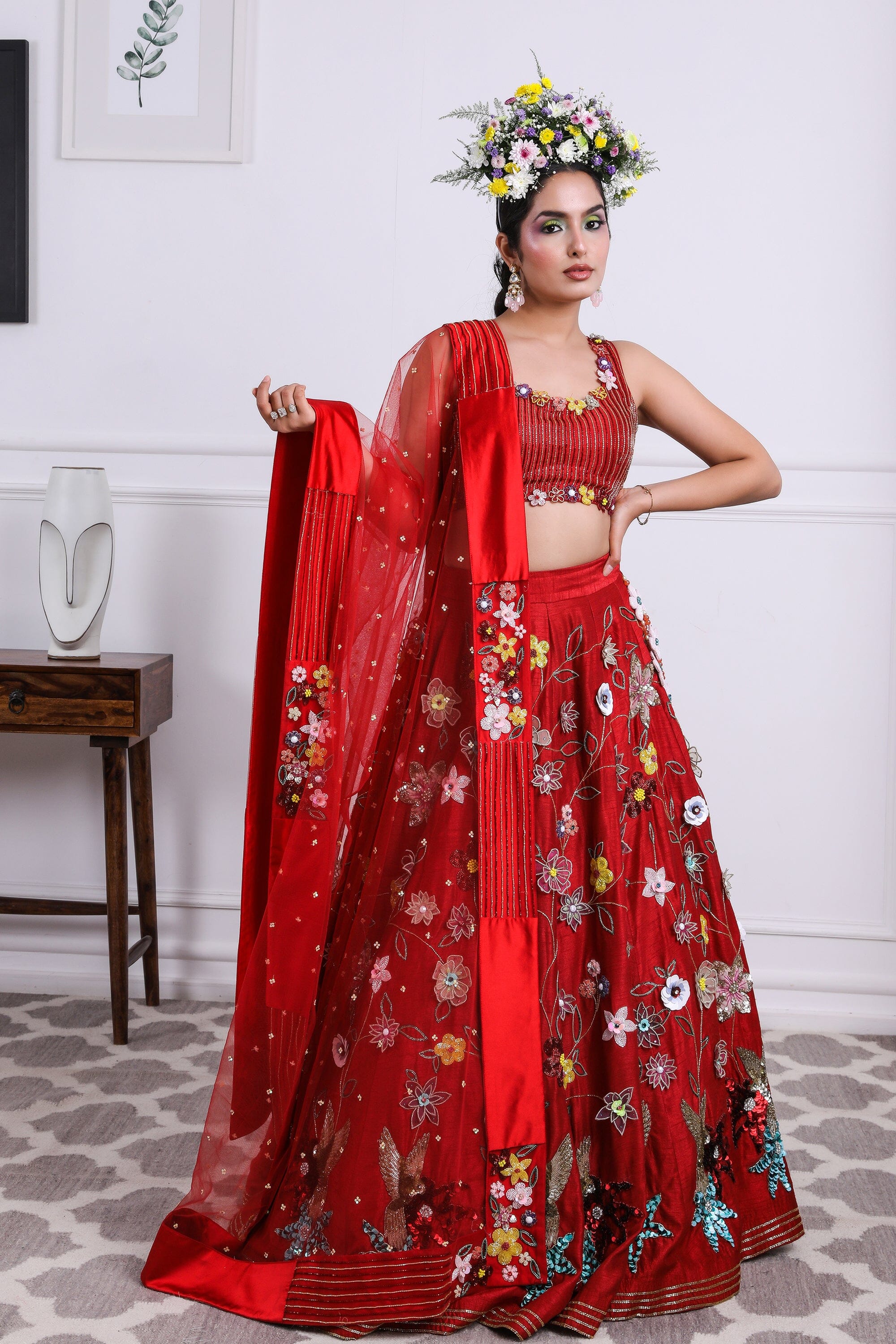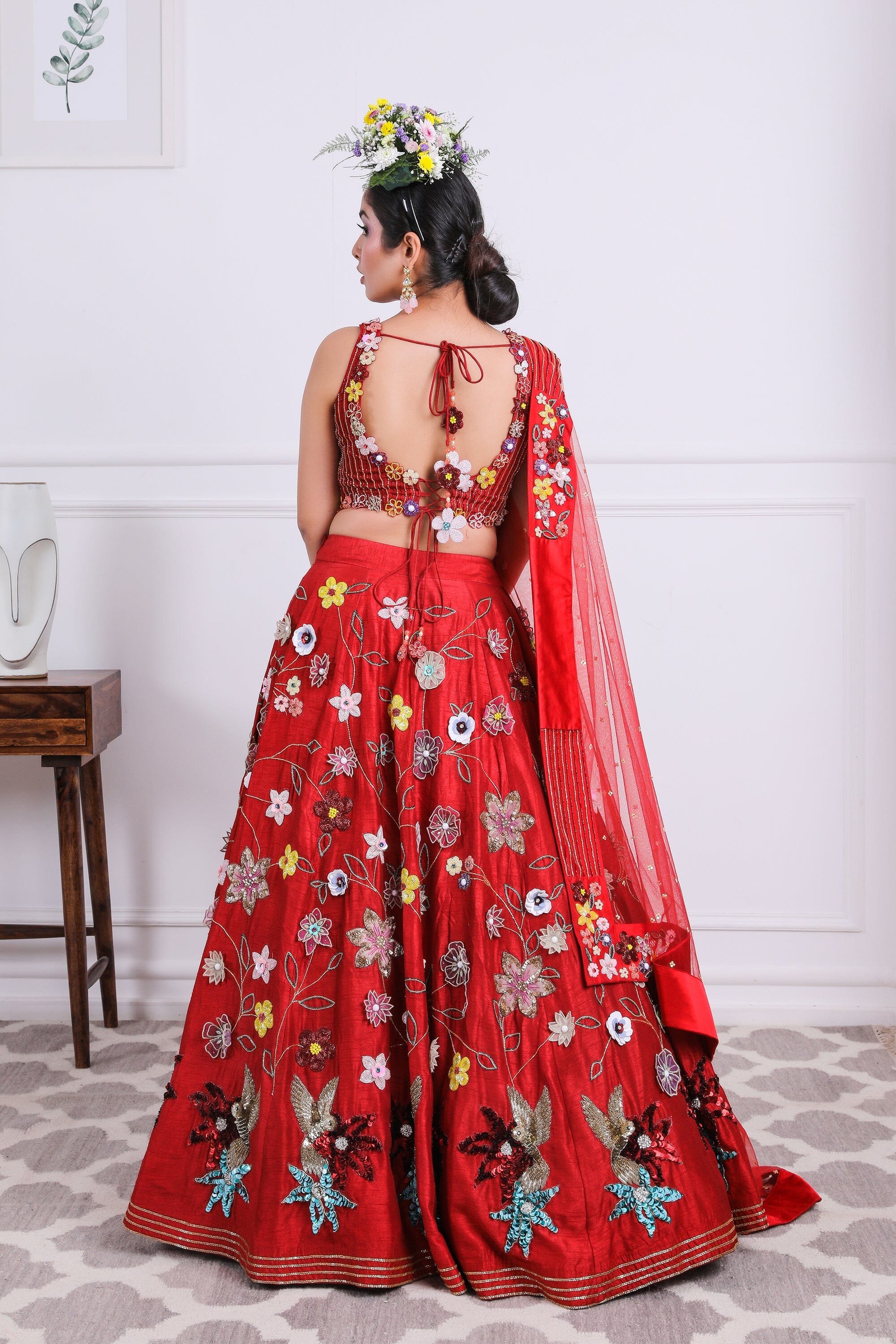 This outfit champions 3D appliqué embroidery on a flared raw silk Lehanga, with a blouse showcasing liner sequin work and floral cut hem and tulle dupatta with all over work