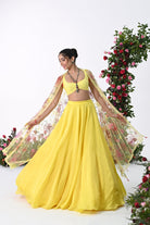 Vibrant yellow satin organza lehnga and blouse paired with heavy hand embroidered duppatta.