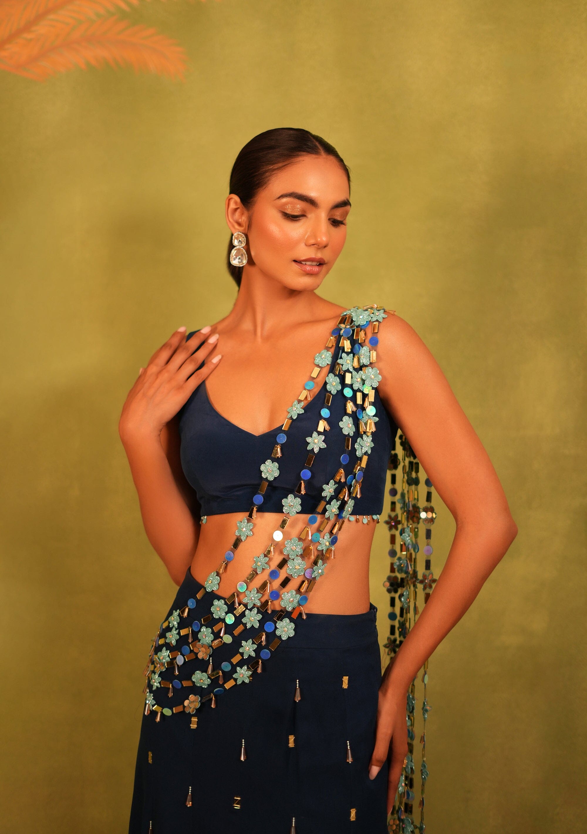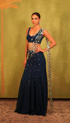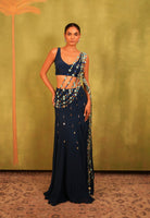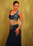This ensemble features a navy blue fish-cut georgette skirt paired with a deep-neck blouse, and an attached pallu crafted from mirror strings and floral embellishments, adding movement, shimmer, and a playful edge to the overall look.