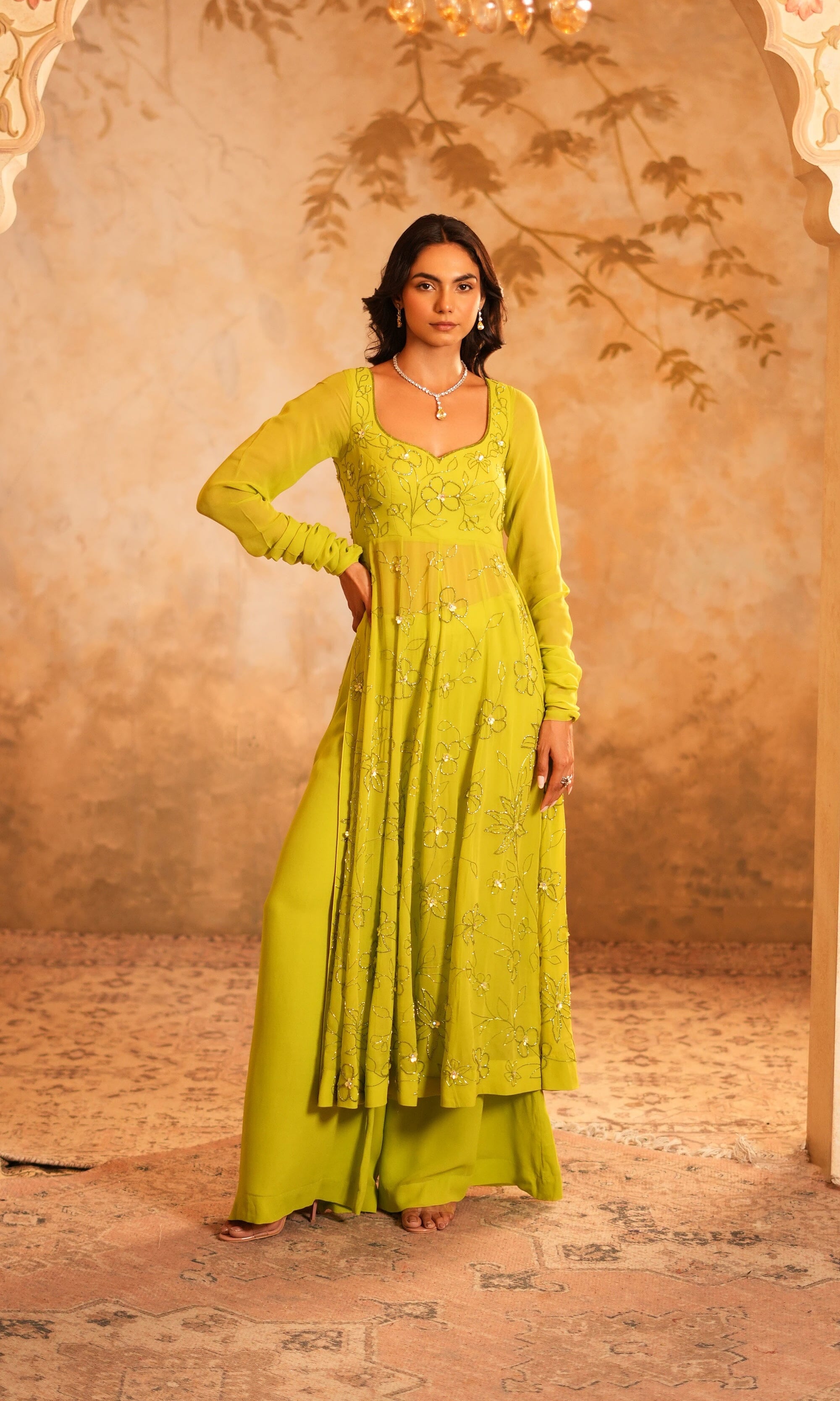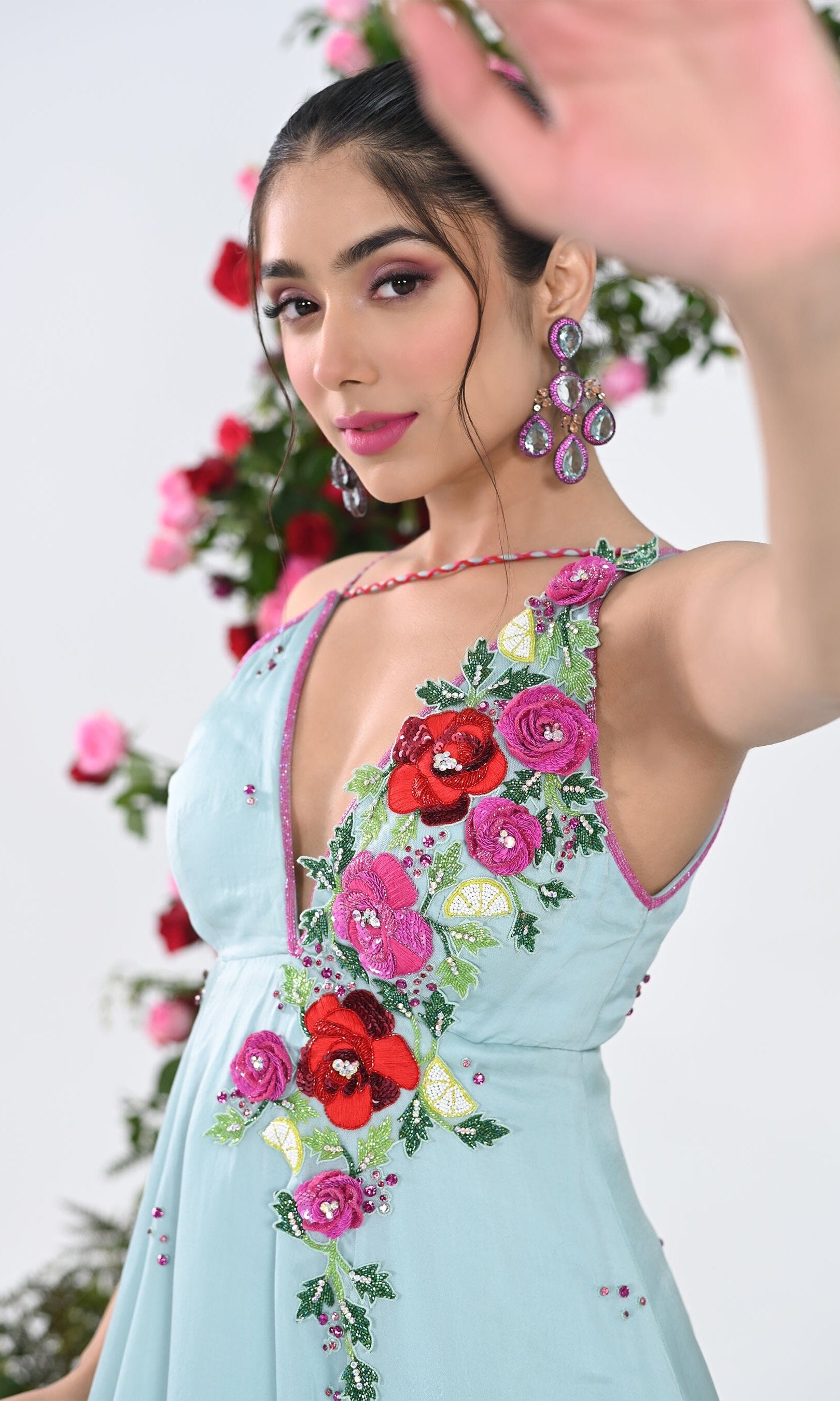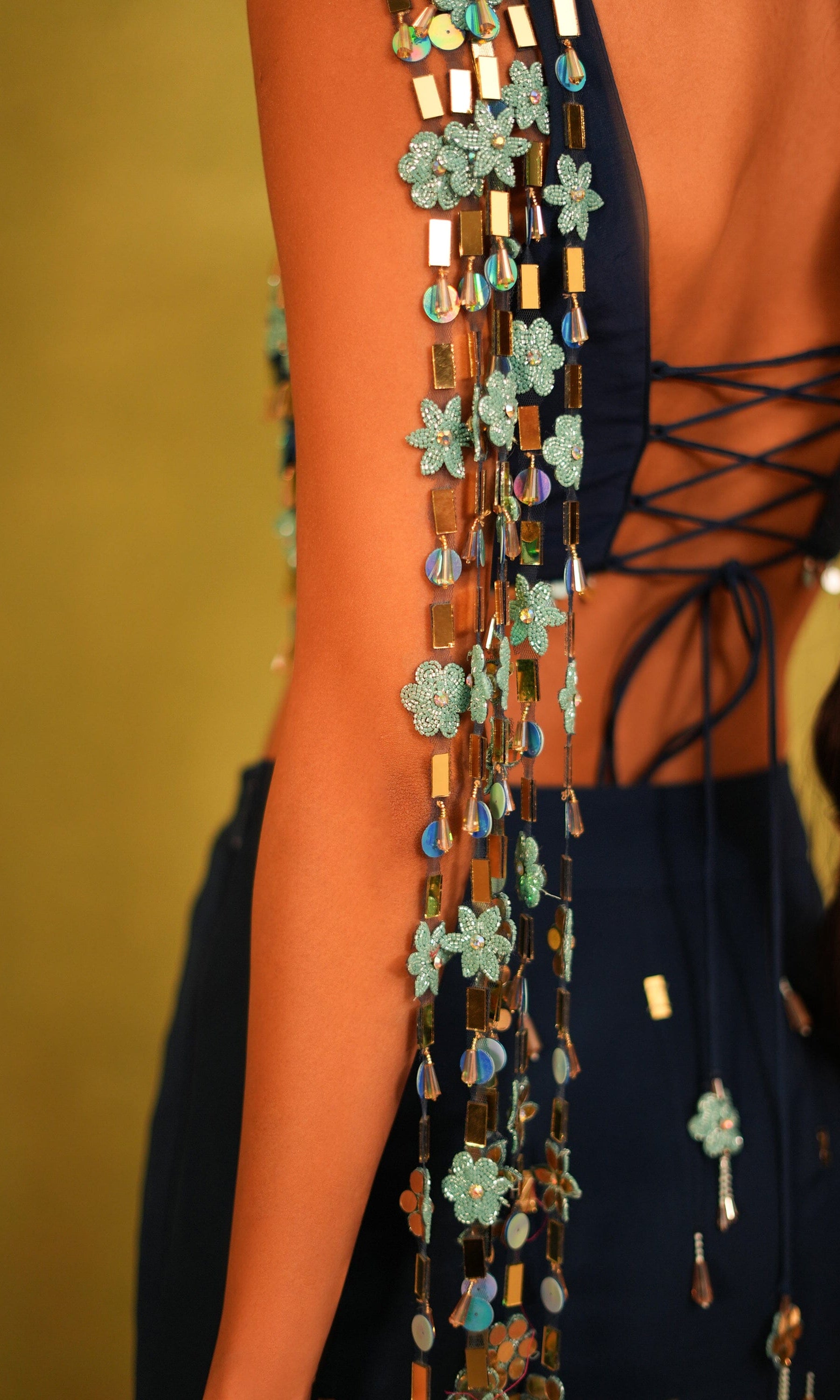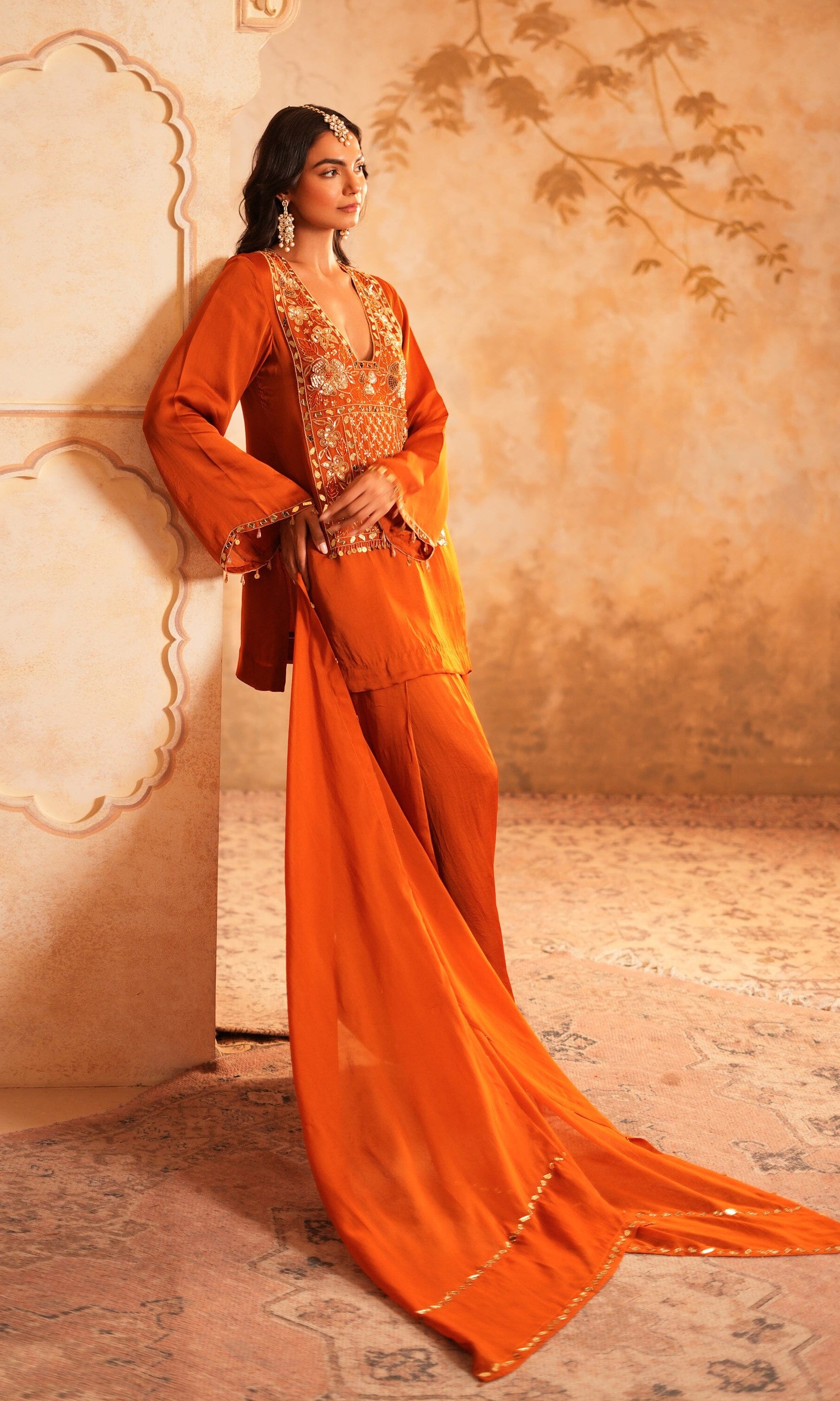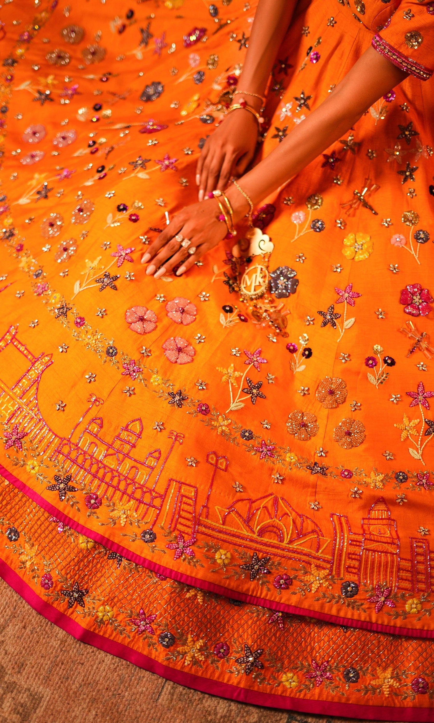 Kiran means rays of sun. The namesake label is based in India. The collection is for anyone who wants to wear something unique and different from the traditional silvers, golds and conventional ethnic motifs, to a design language that celebrates hearty embroidery set in vibrant, eye catching colour palettes and the most fun and joyous silhouettes- and today this brand aesthetic is signatory to the Kiran Kalsi label.