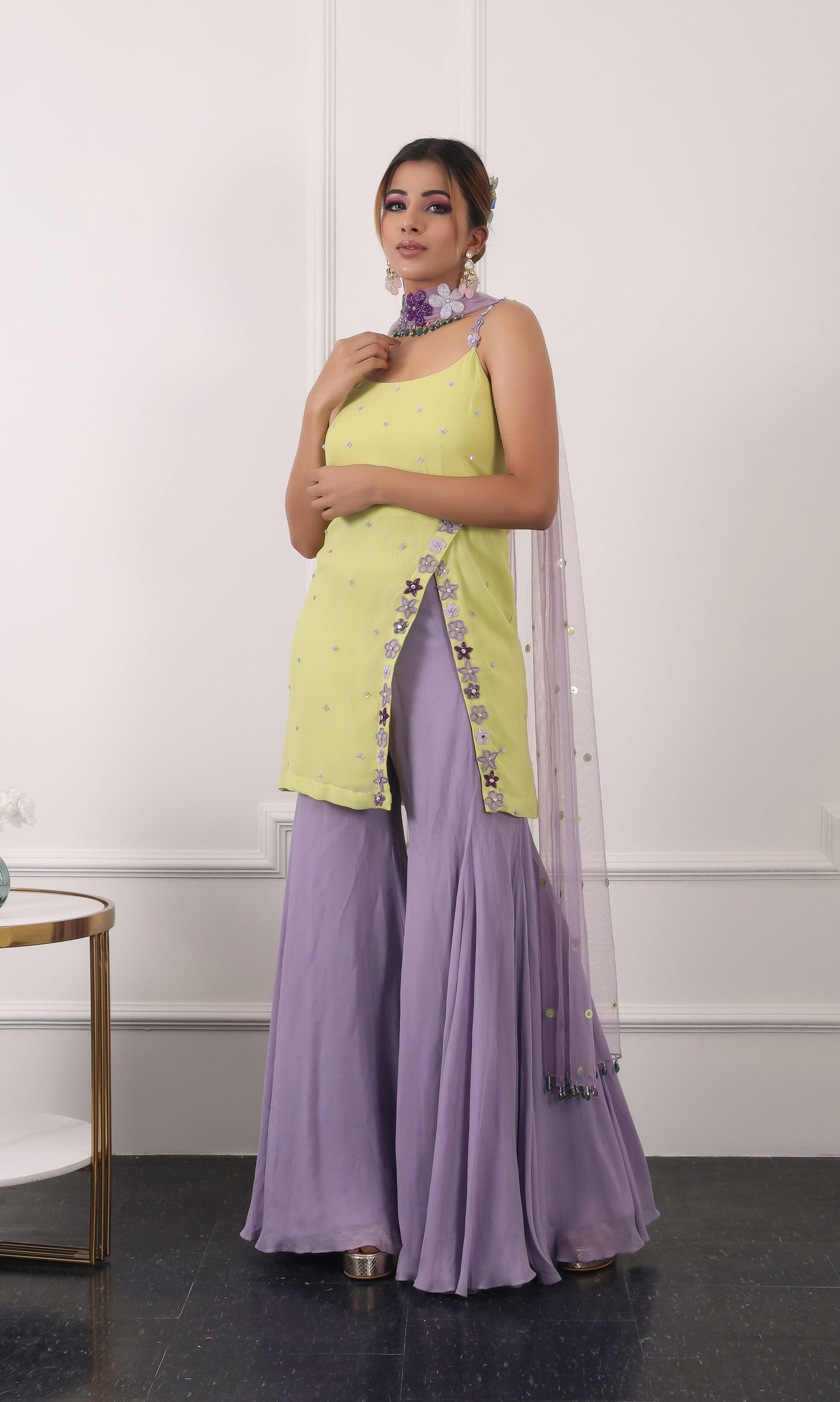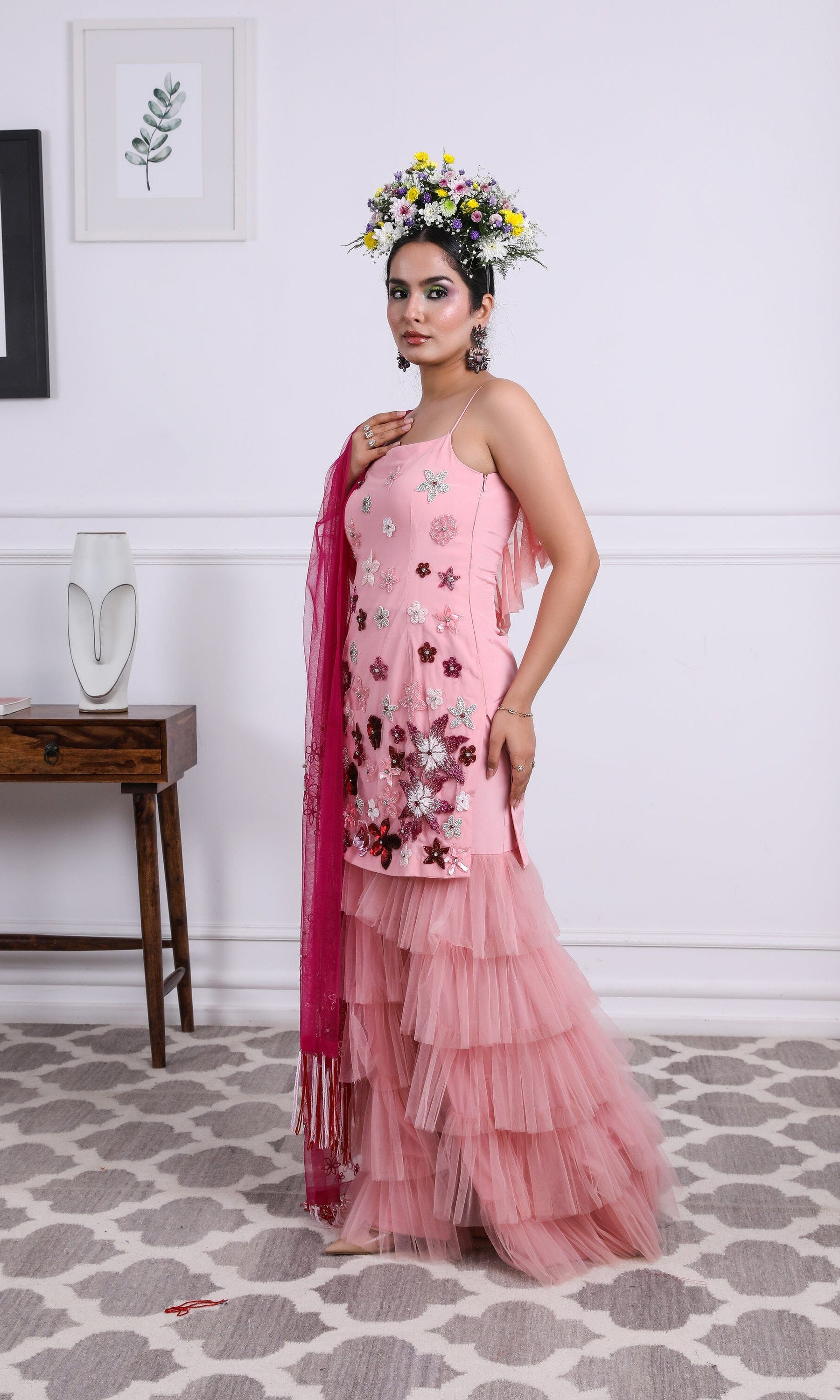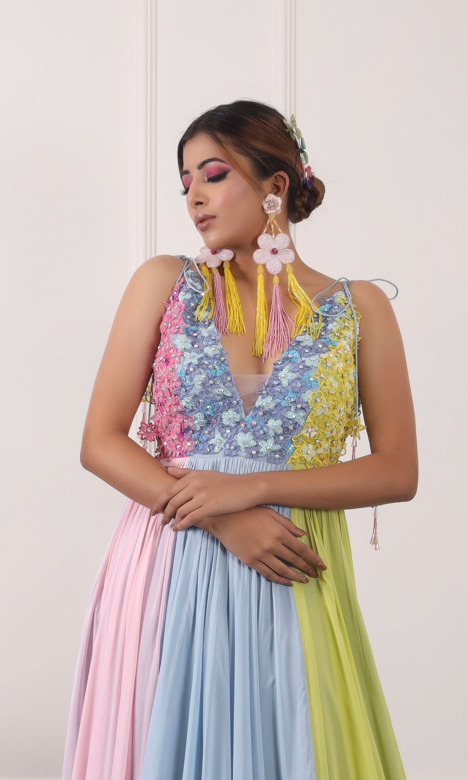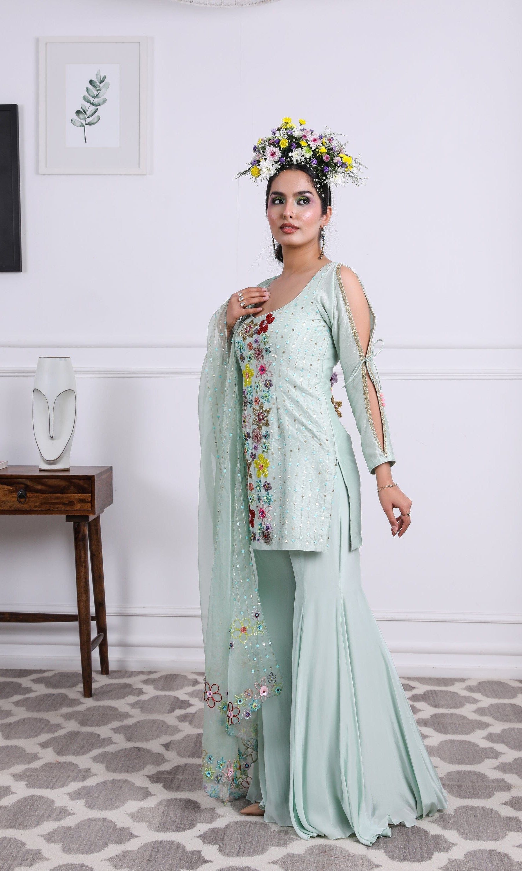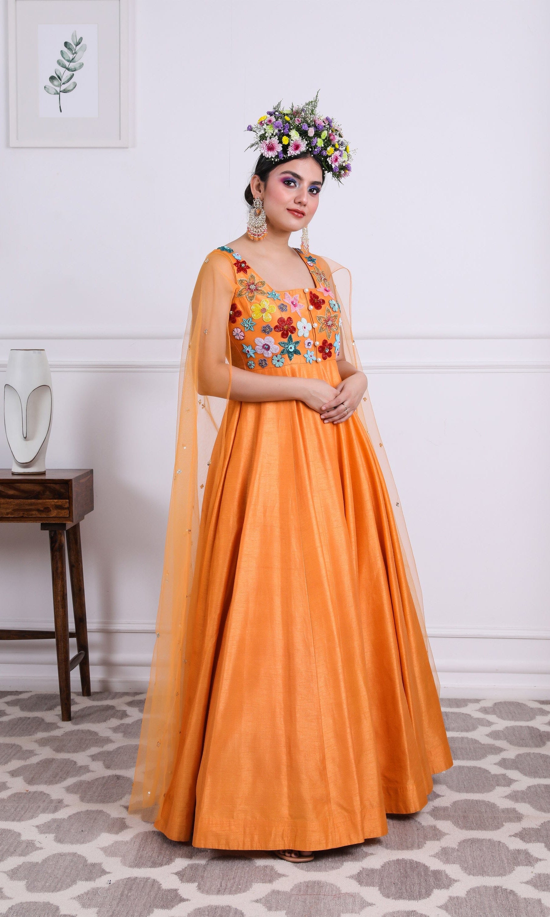 Kiran means rays of sun. The namesake label is based in India. The collection is for anyone who wants to wear something unique and different from the traditional silvers, golds and conventional ethnic motifs, to a design language that celebrates hearty embroidery set in vibrant, eye catching colour palettes and the most fun and joyous silhouettes- and today this brand aesthetic is signatory to the Kiran Kalsi label.