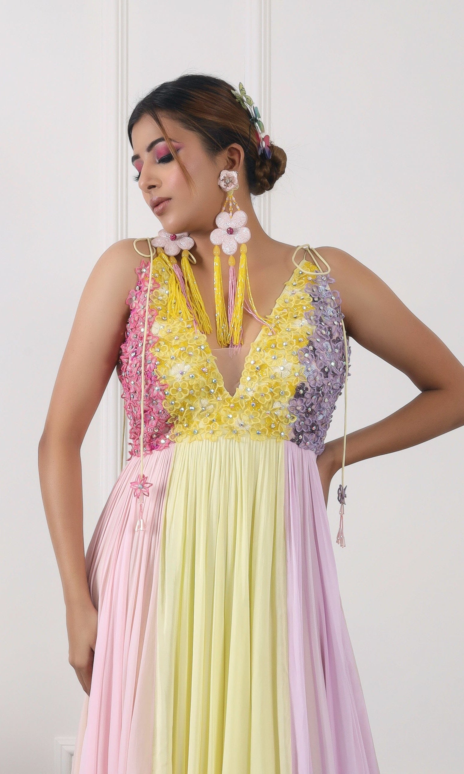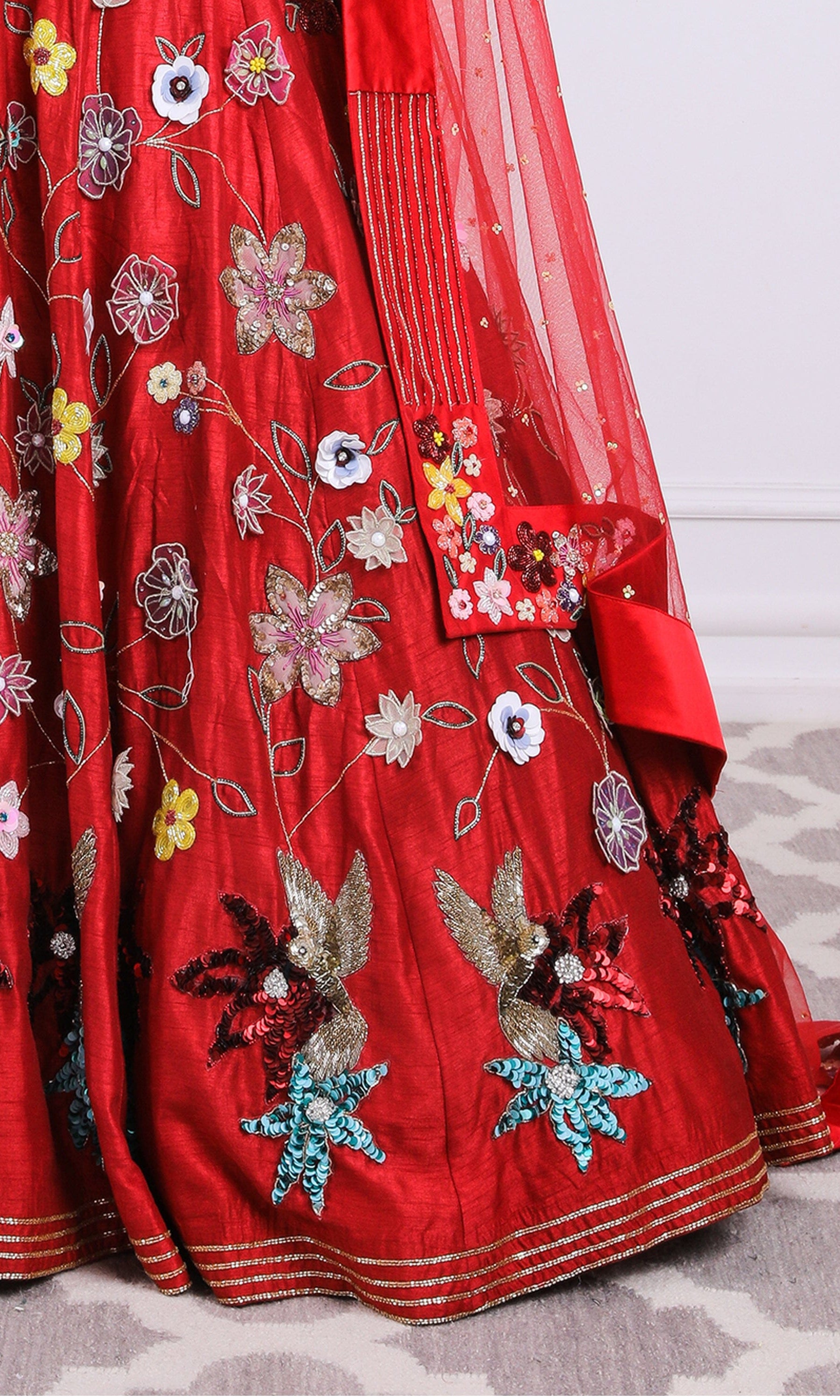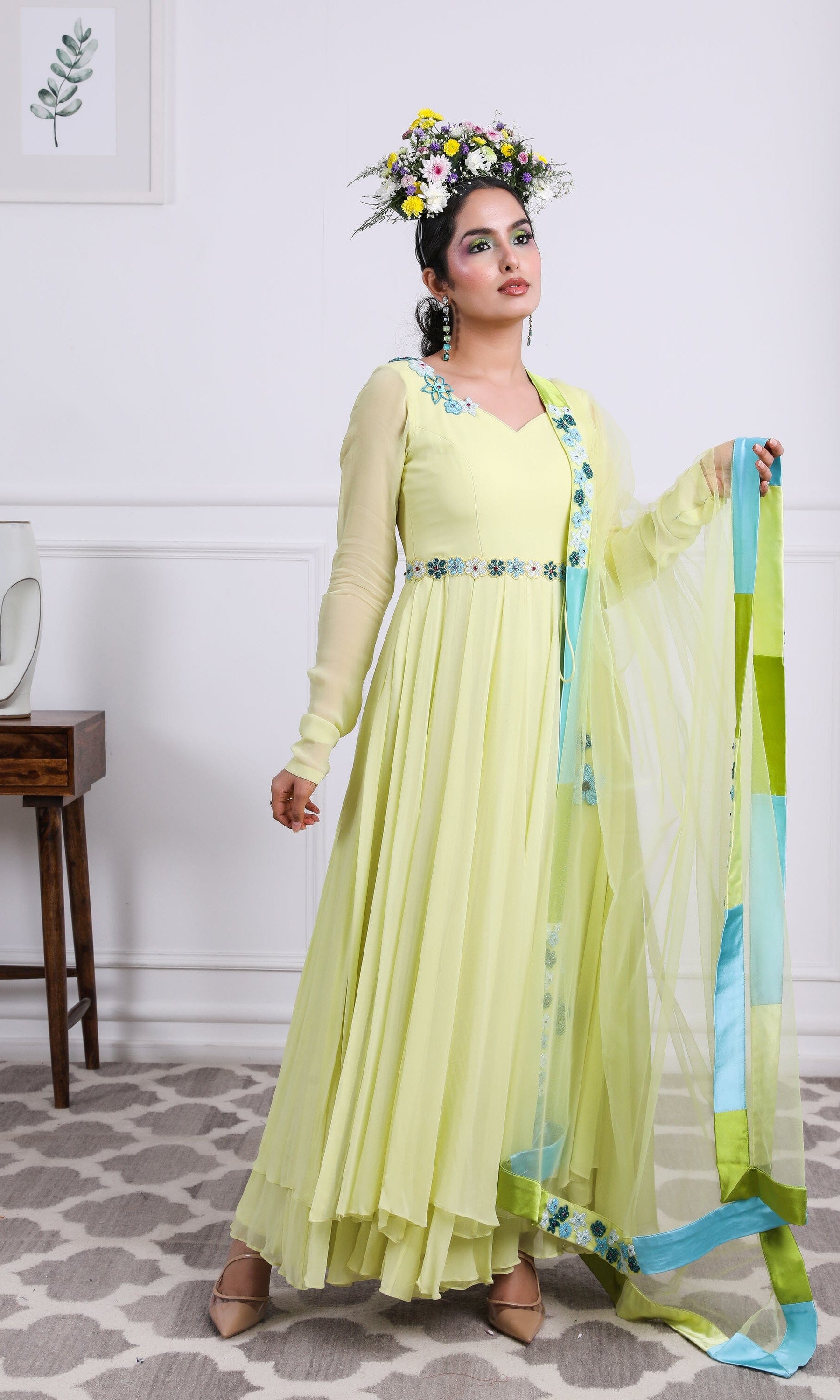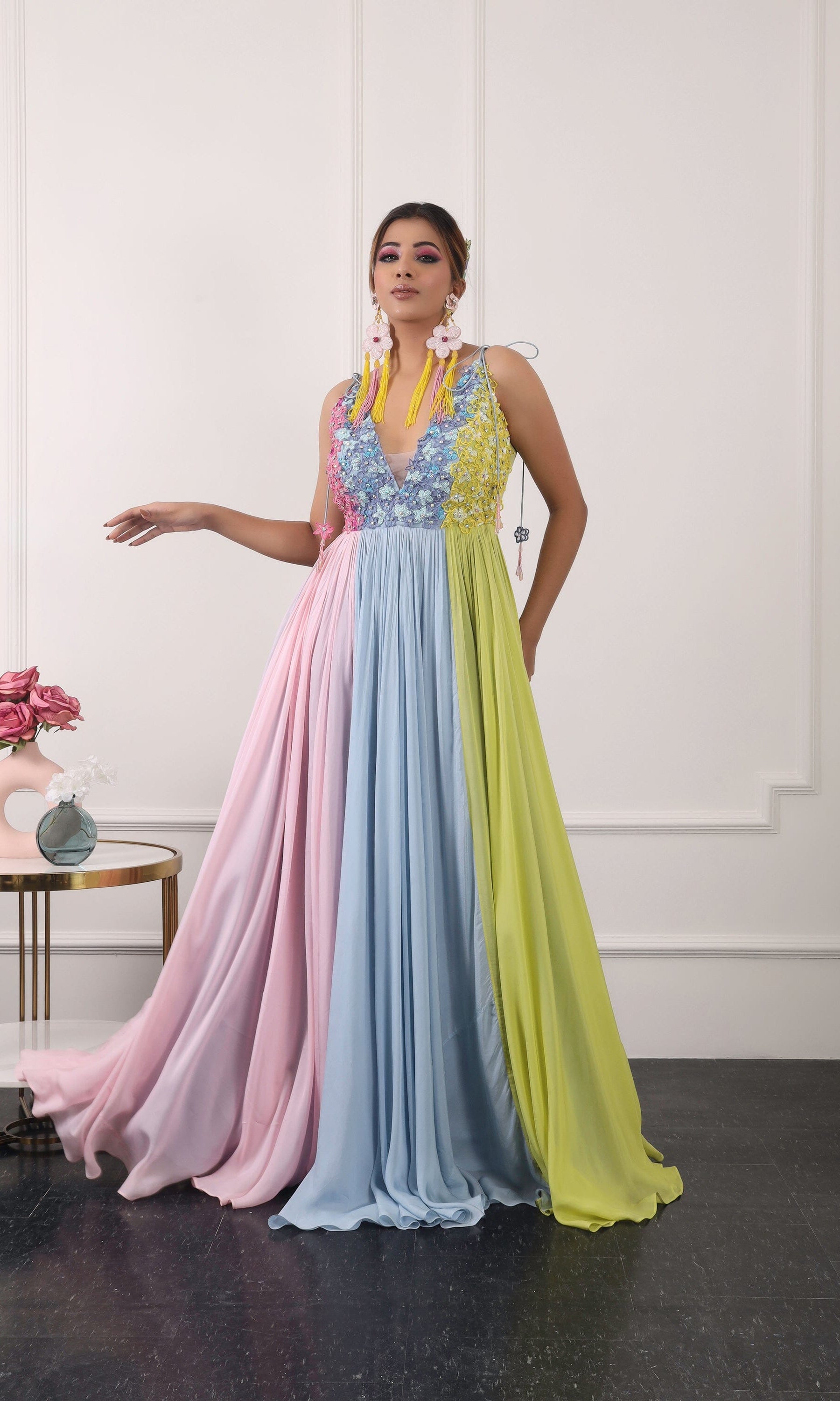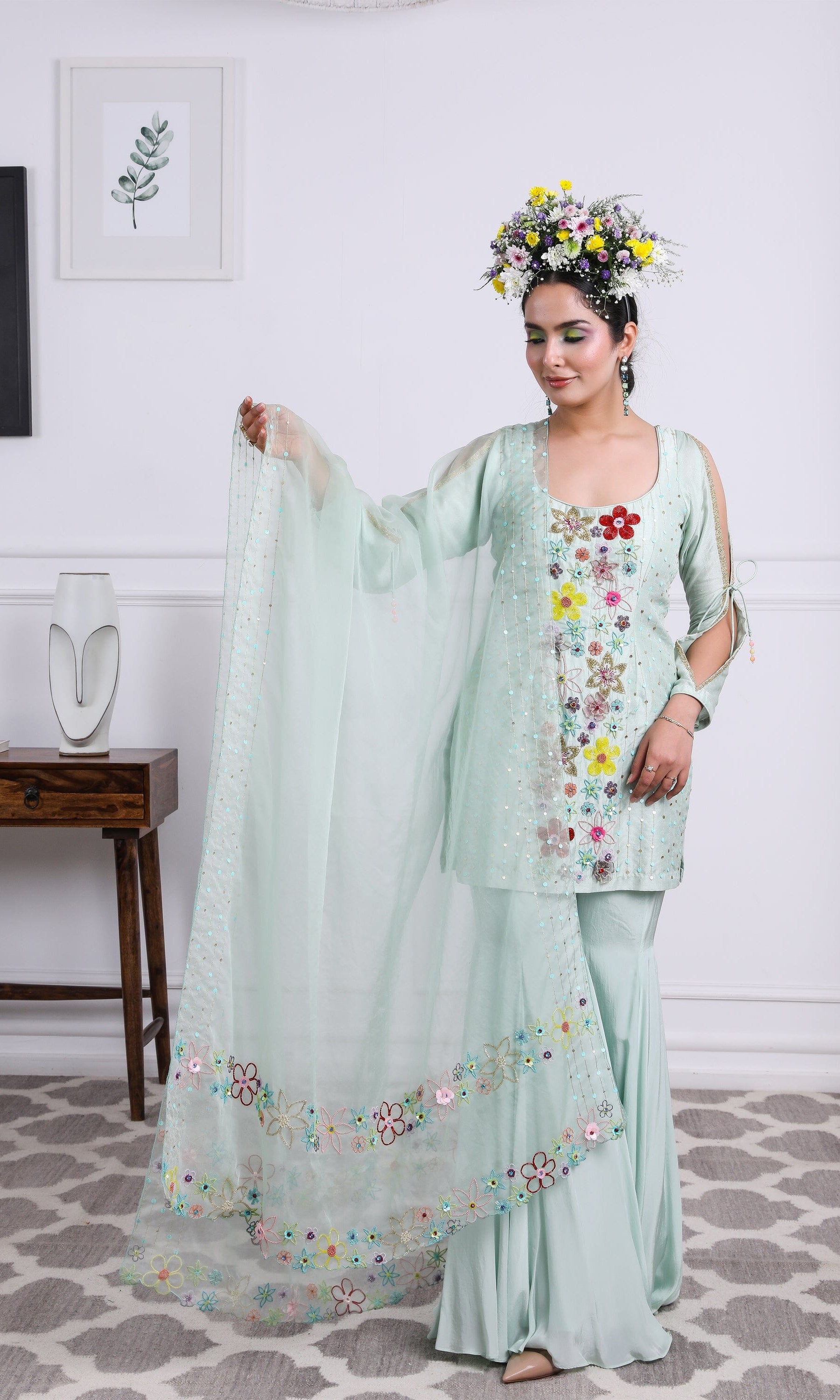Kiran means rays of sun. The namesake label is based in India. The collection is for anyone who wants to wear something unique and different from the traditional silvers, golds and conventional ethnic motifs, to a design language that celebrates hearty embroidery set in vibrant, eye catching colour palettes and the most fun and joyous silhouettes- and today this brand aesthetic is signatory to the Kiran Kalsi label.