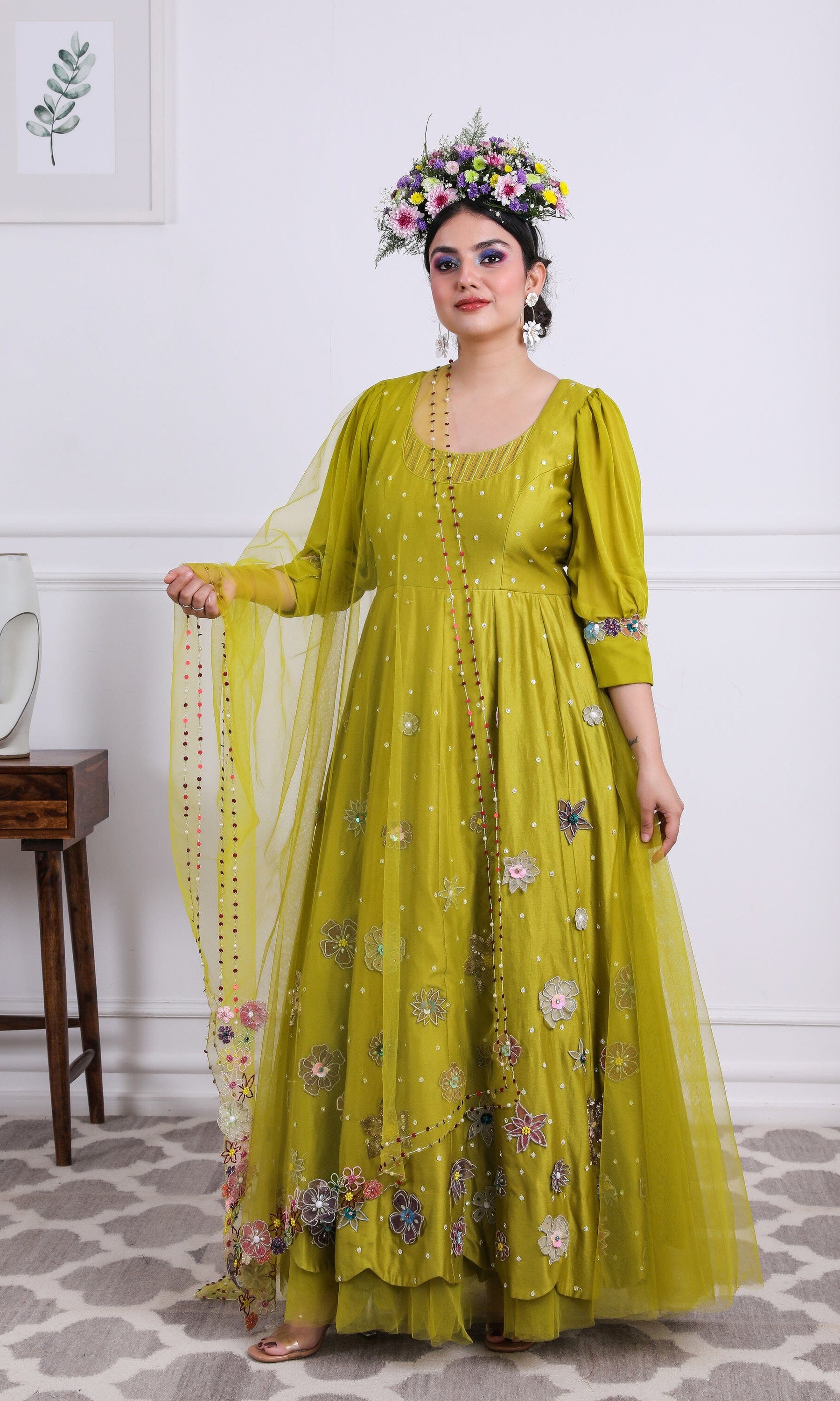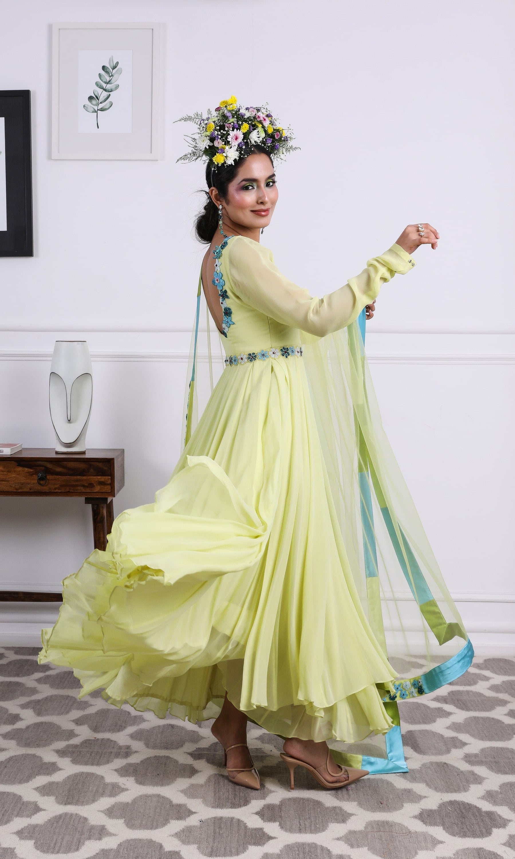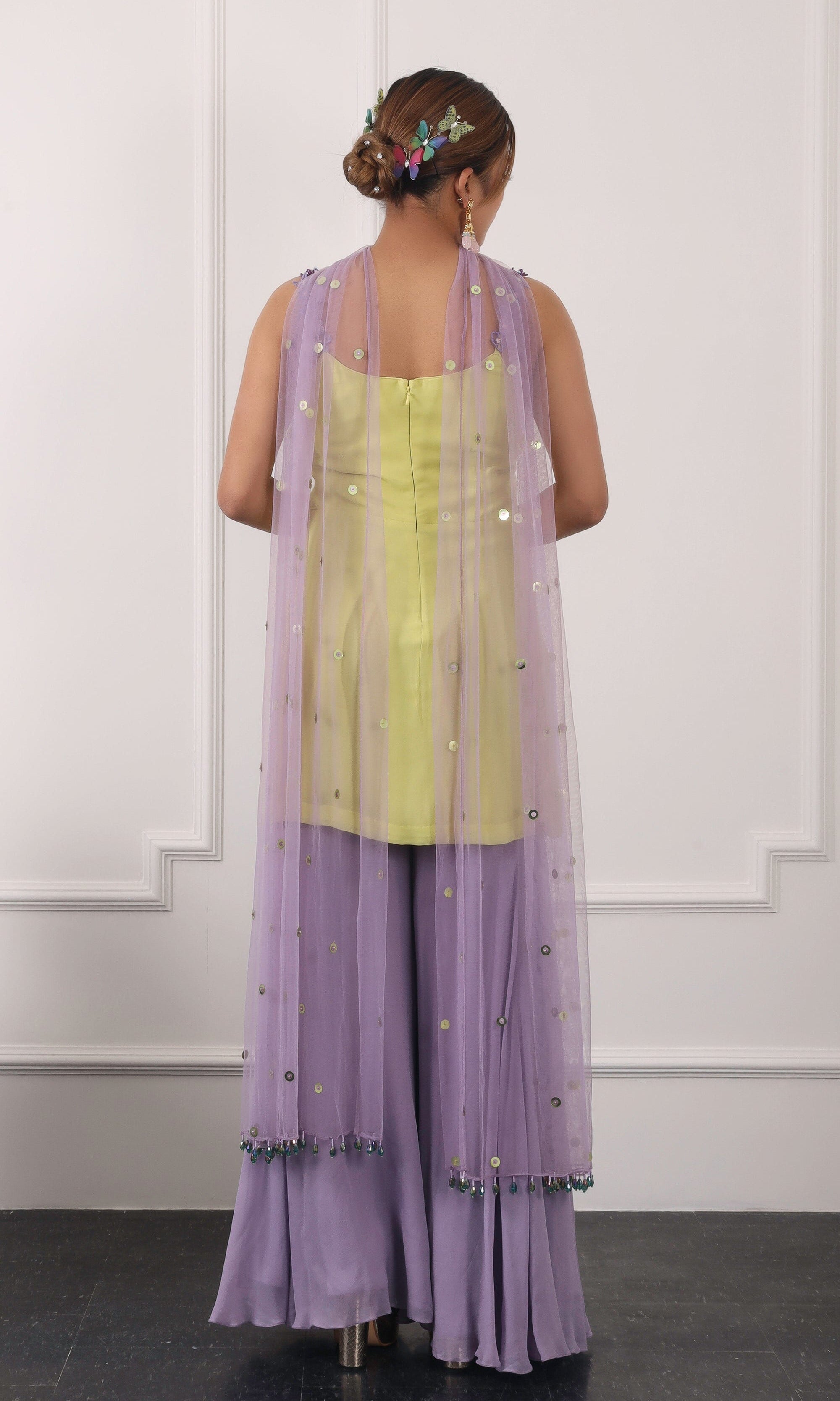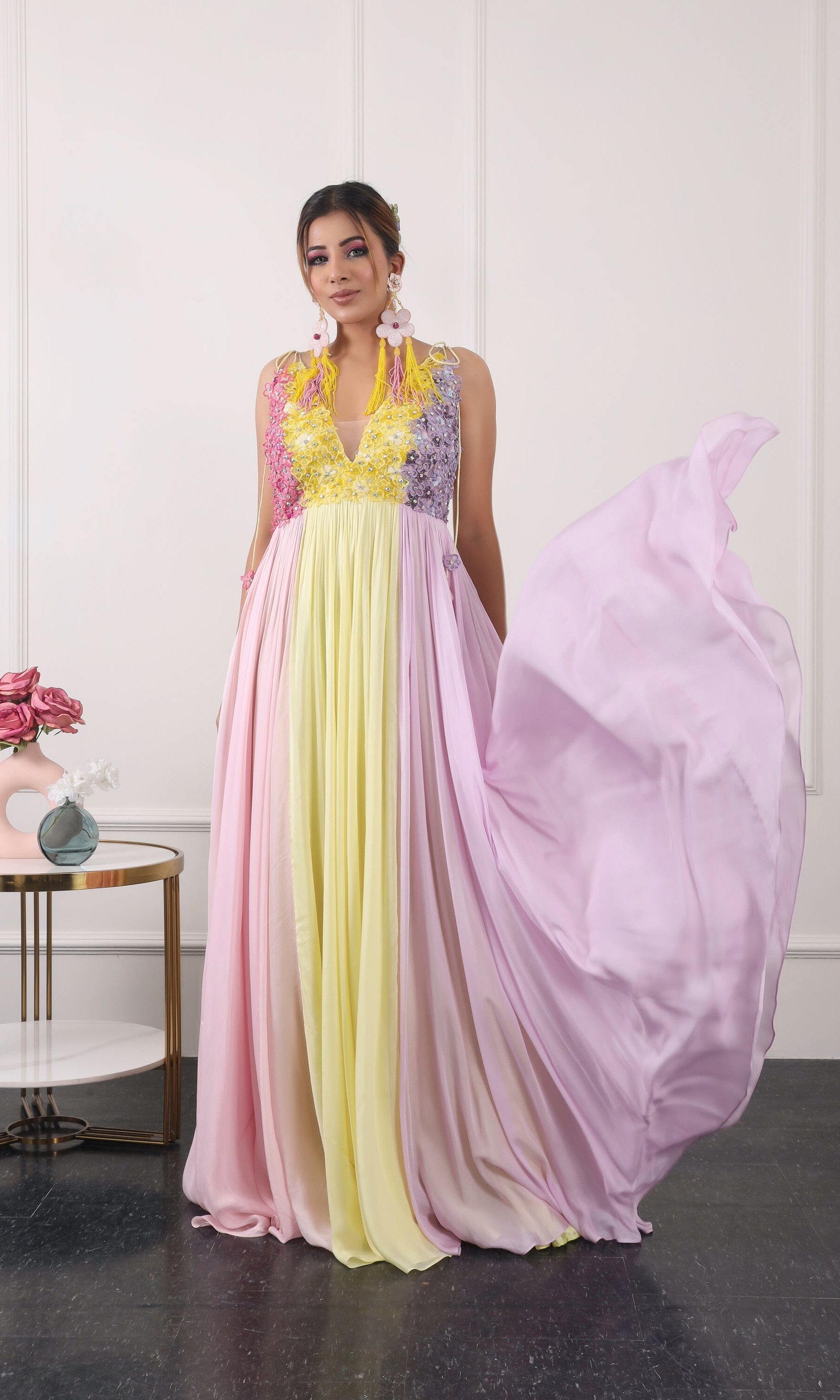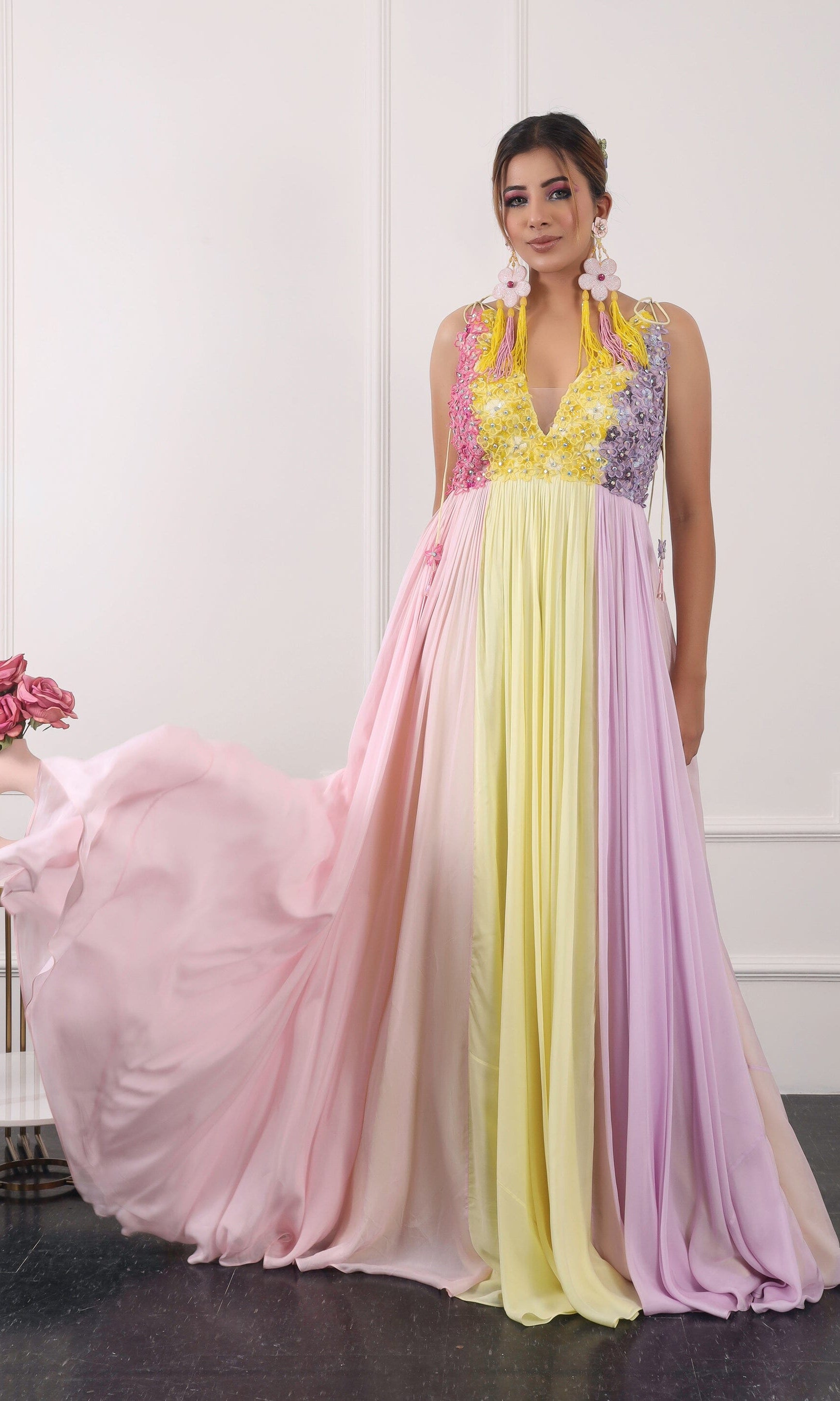 Kiran means rays of sun. The namesake label is based in India. The collection is for anyone who wants to wear something unique and different from the traditional silvers, golds and conventional ethnic motifs, to a design language that celebrates hearty embroidery set in vibrant, eye catching colour palettes and the most fun and joyous silhouettes- and today this brand aesthetic is signatory to the Kiran Kalsi label.
