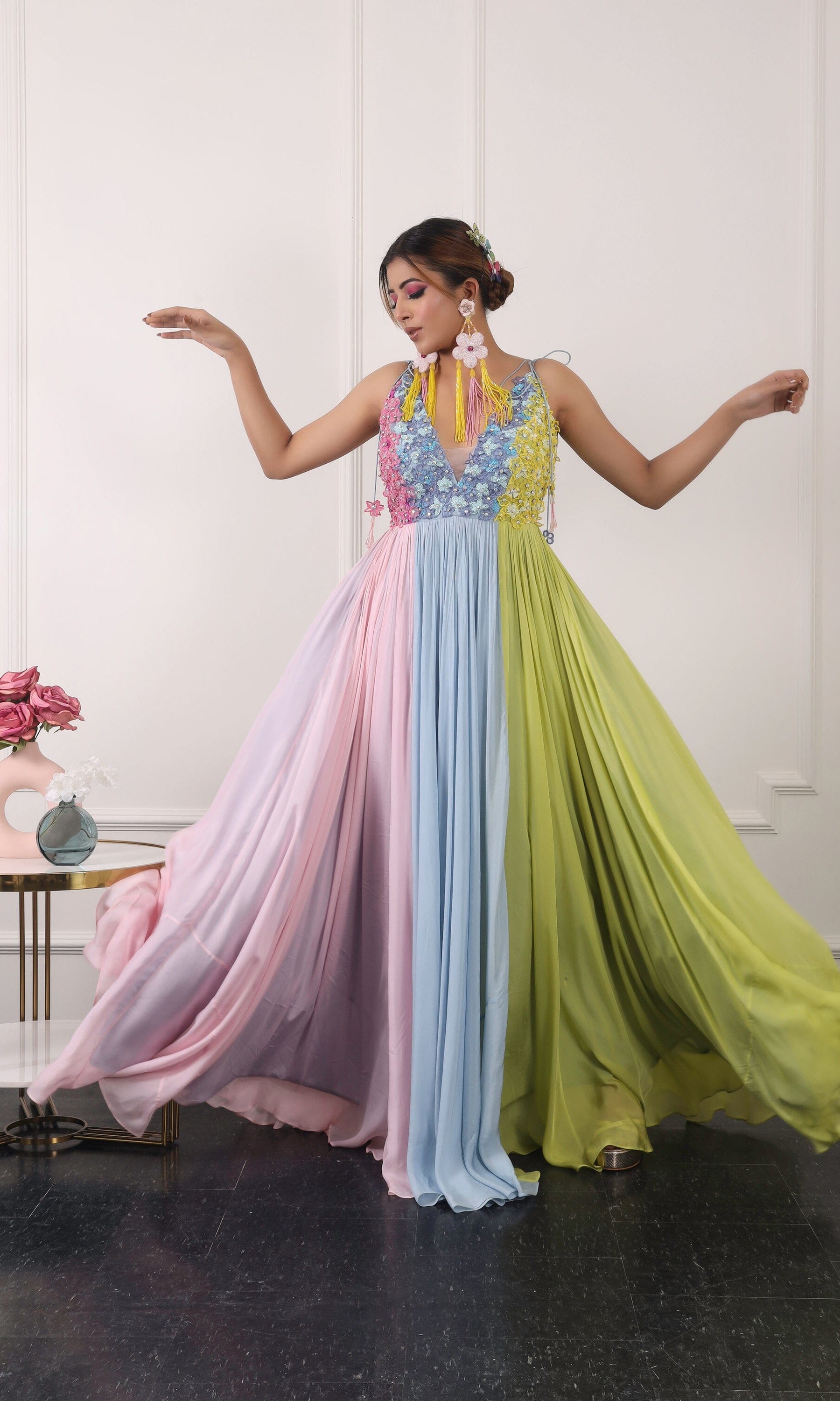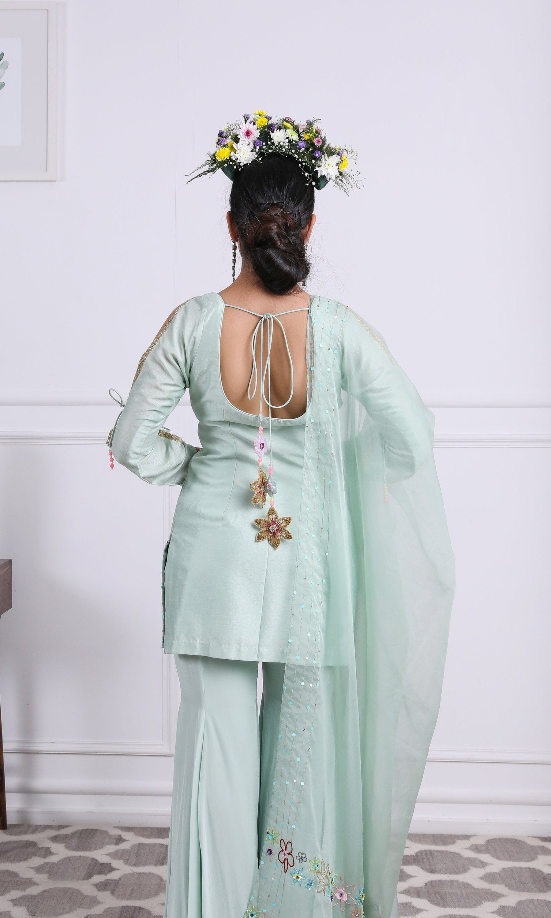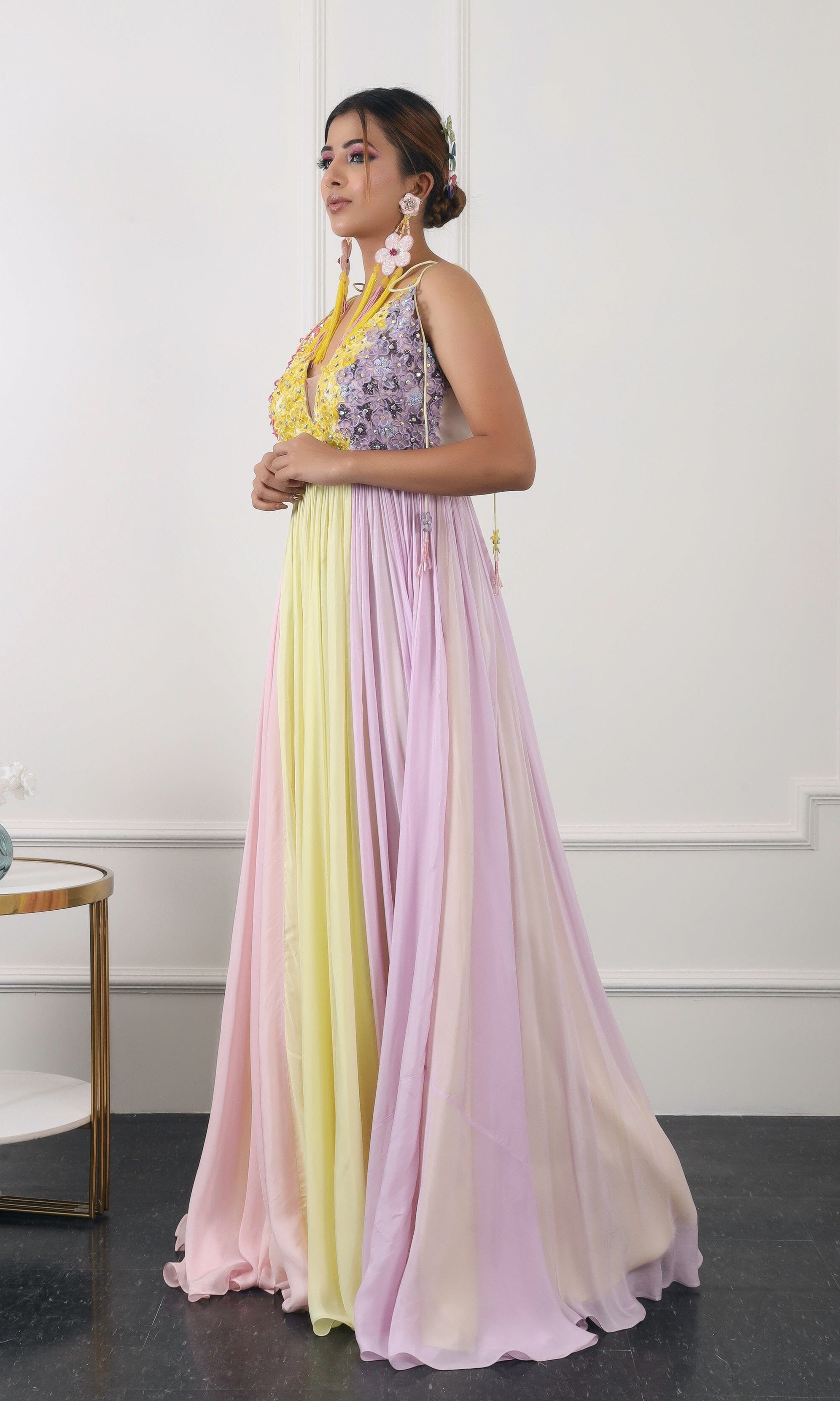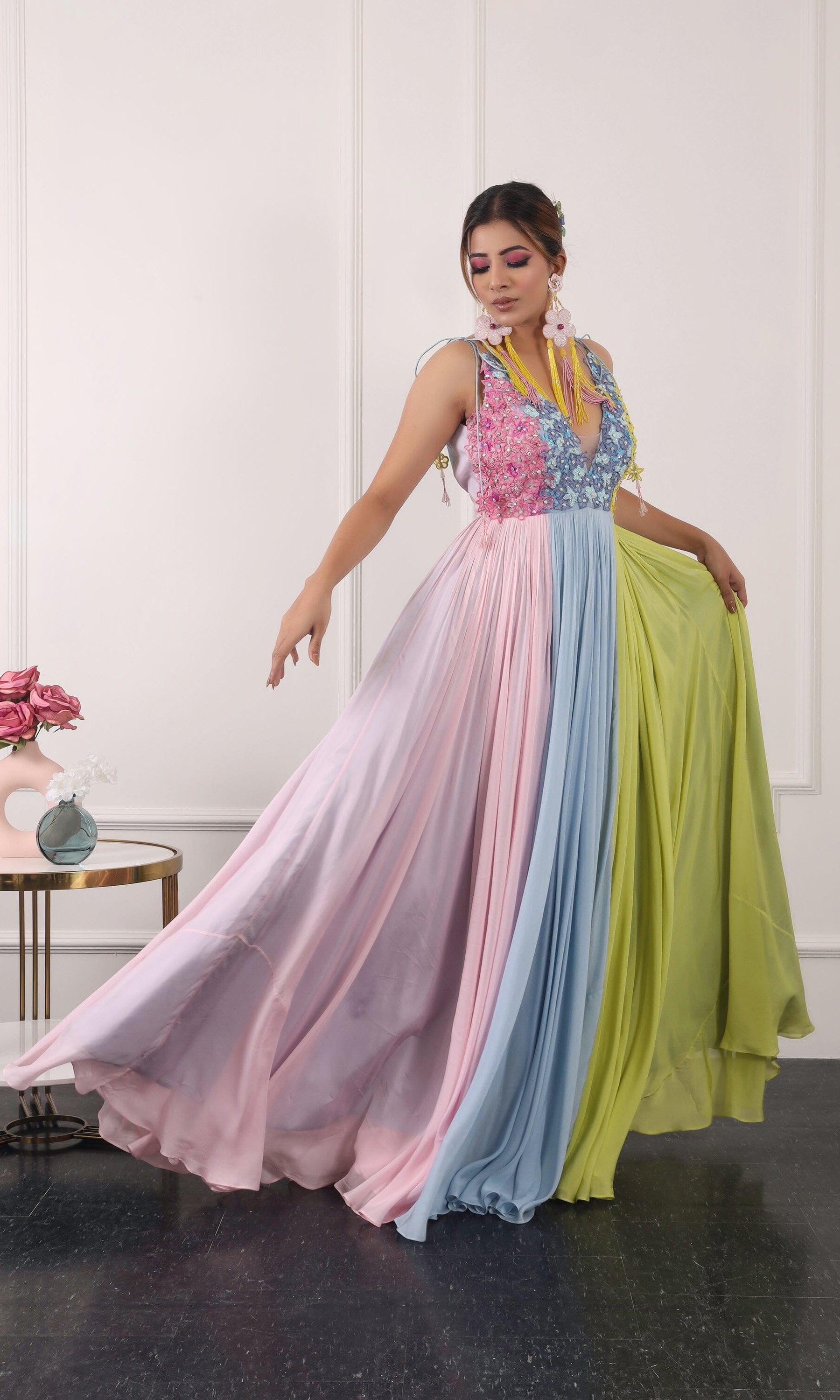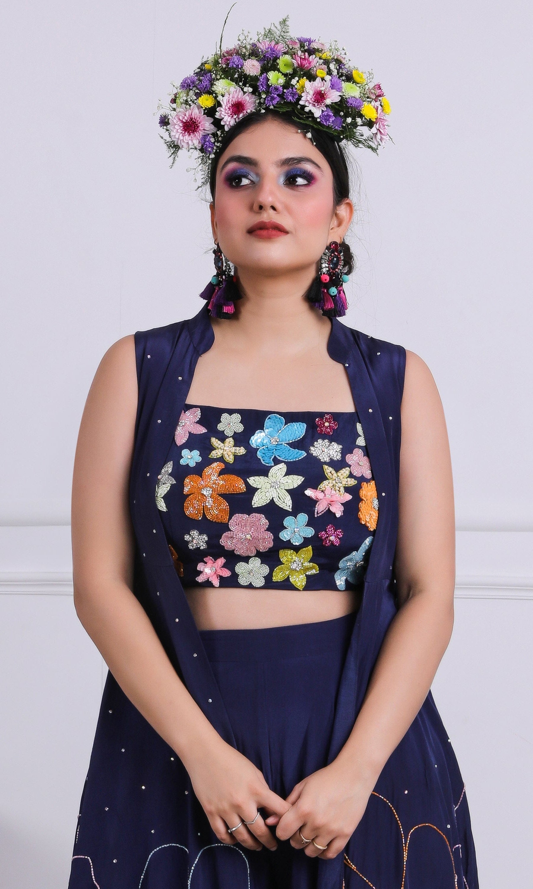 Kiran means rays of sun. The namesake label is based in India. The collection is for anyone who wants to wear something unique and different from the traditional silvers, golds and conventional ethnic motifs, to a design language that celebrates hearty embroidery set in vibrant, eye catching colour palettes and the most fun and joyous silhouettes- and today this brand aesthetic is signatory to the Kiran Kalsi label.