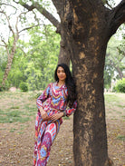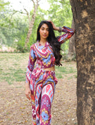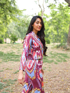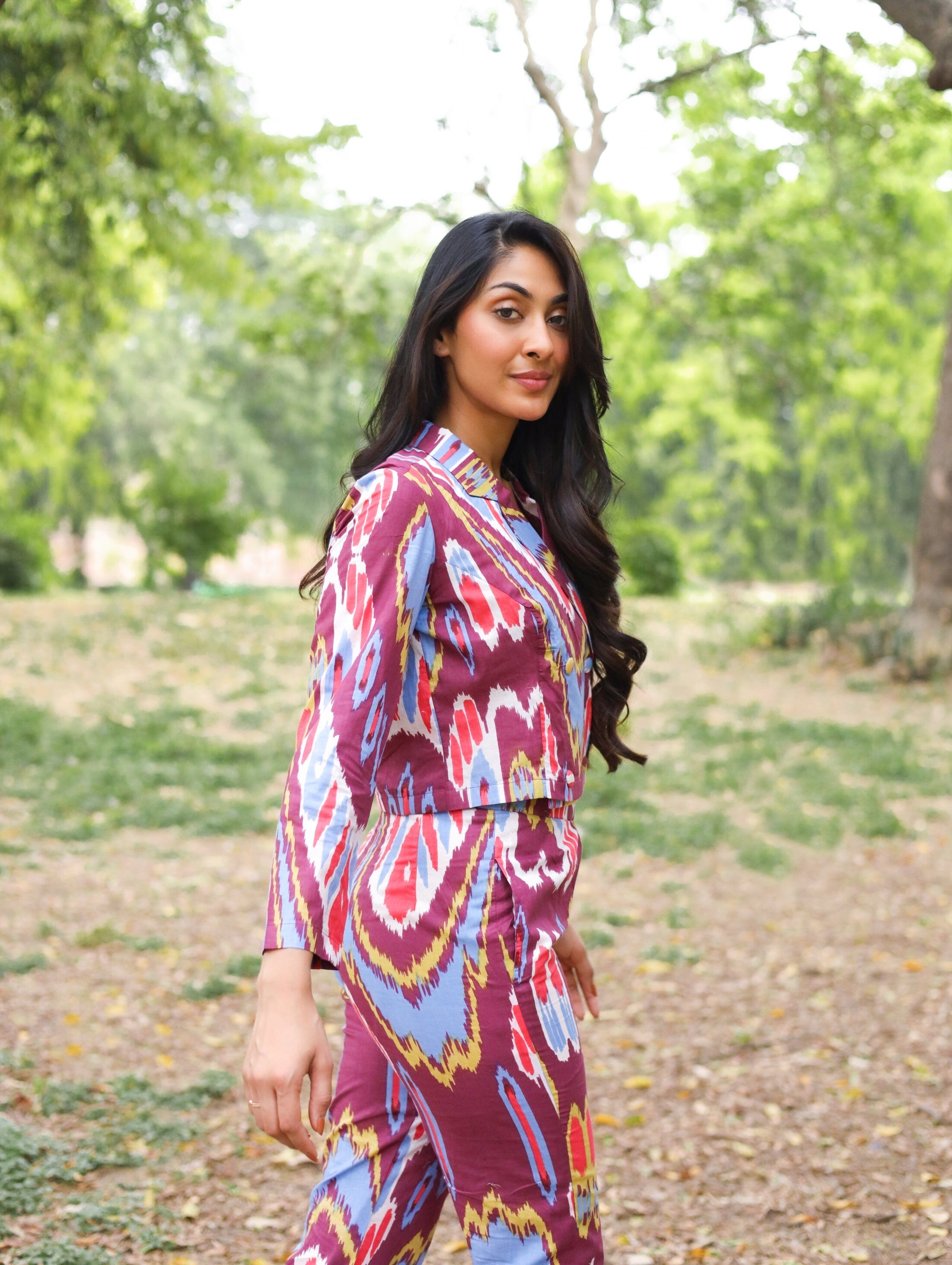 An eclectic Multi Coloured Ikkat print 2 pc Cropped Blazer set with Pants. The sleeves are full length and the pants are tapered at the end with a band at the hem. The Pant have a fixed waistband and a Zip Closure.