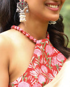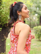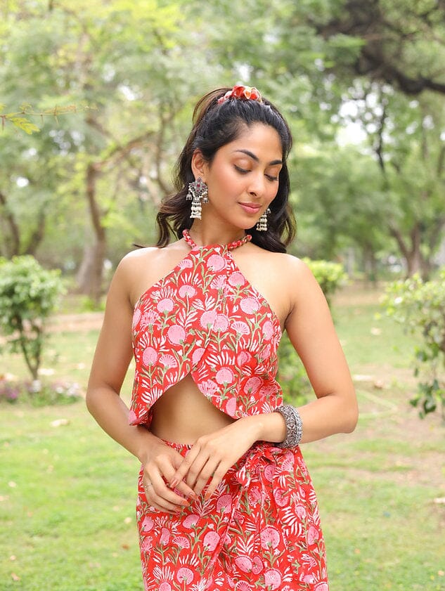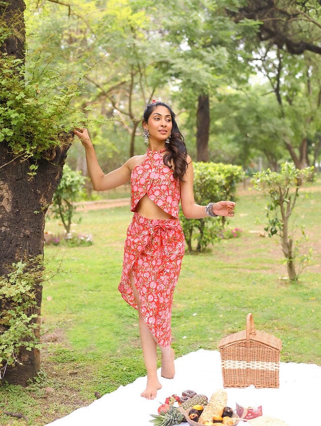A Bright Red floral Print Crop Top Set with a wraop skirt. The perfect pick for summer or your beach days. The top will be longer than the model picture for ease of comfort. The wrap skirt is with adjustable strap so you can wrap it as tight/loose as you like.
