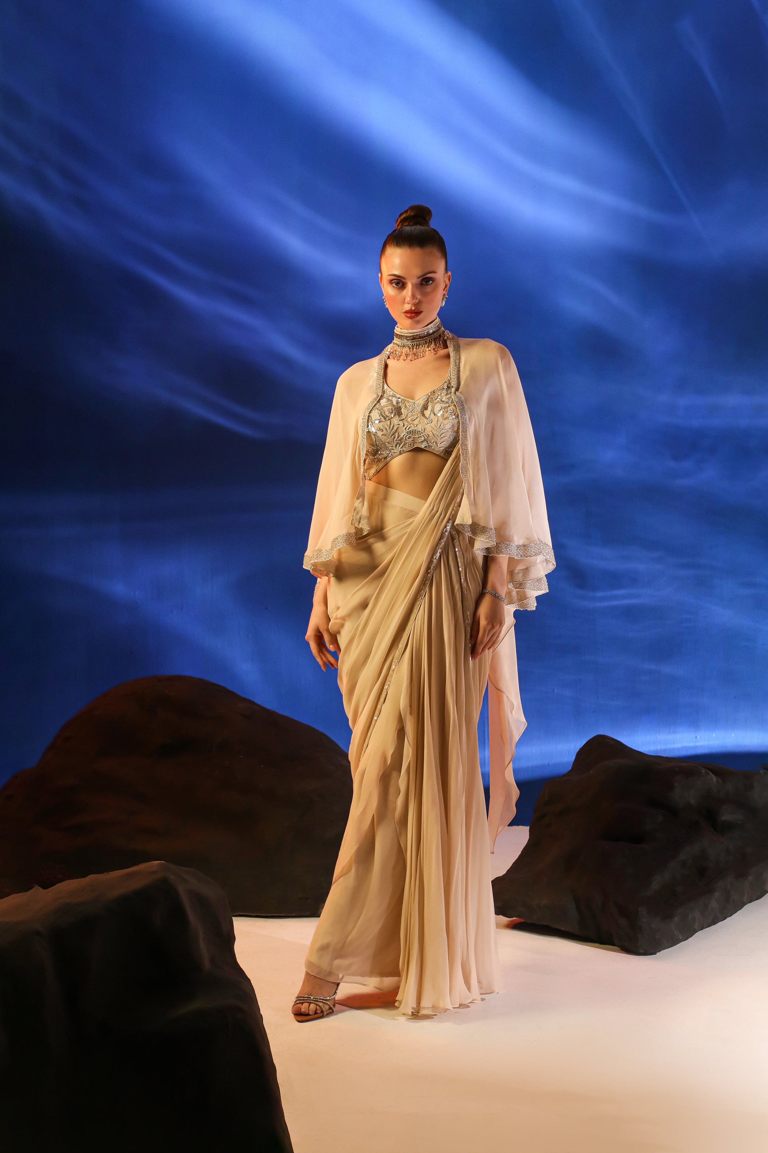 A saree but make it Ceto! Captivating and chic, this ensemble is our interpretation of a modern-day saree that stands apart from the crowd. It features a delicately embroidered halter neck blouse with double draped saree and high-low hemline cape to refine the look further.