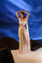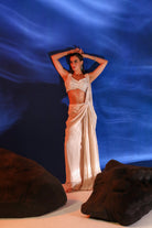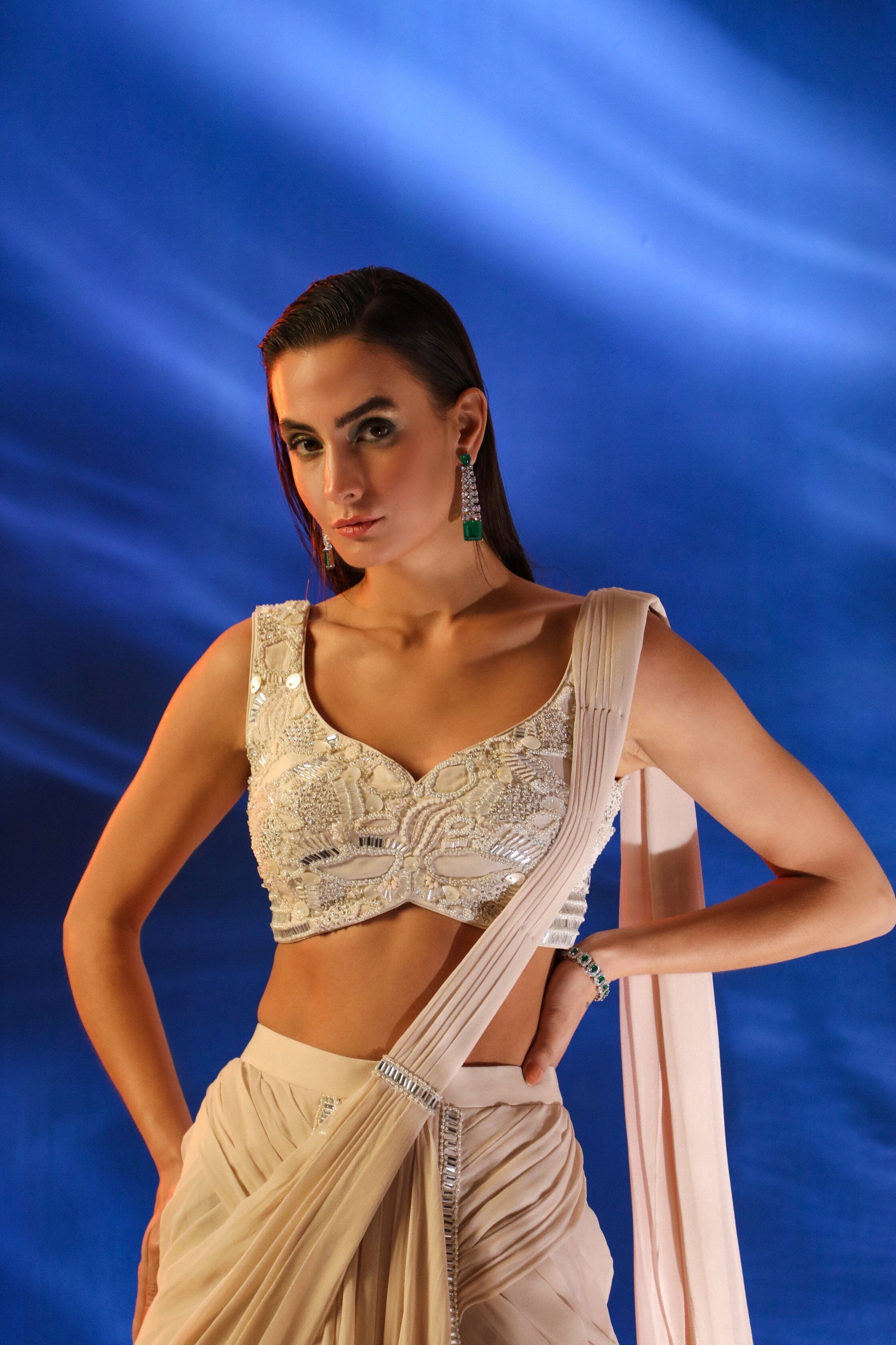 The Nerida saree is a an all-time favourite ensemble. Inspired by the intricate elegance of the world unknown to us, it is designed and created in a muted peach hue, featuring a finely embroidered blouse that complements a uniquley draped saree. Pair it with minimal accesories and sleek hair to achieve a perfectly edgy look.