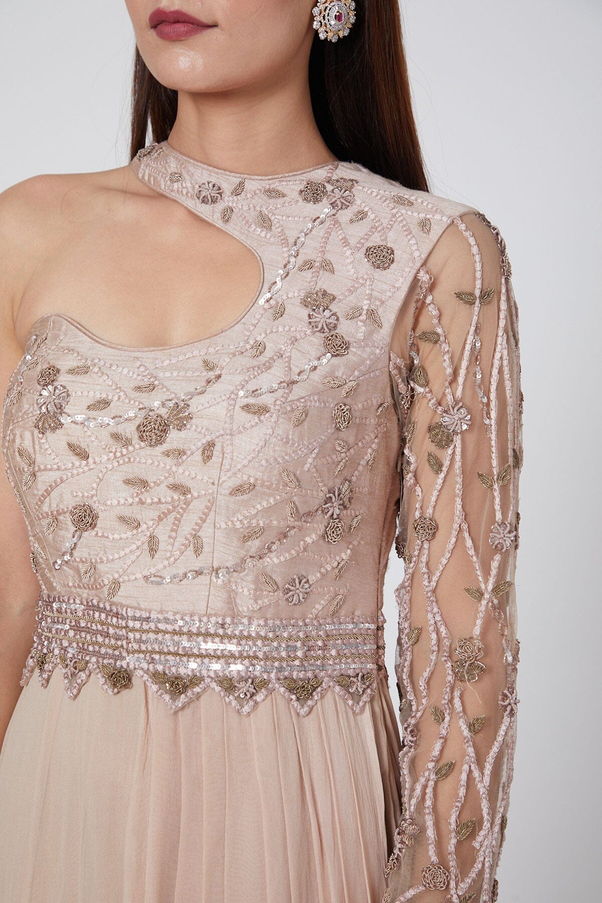 Pastel peach gown with novel neckline, intricate details on sleeves, and frilled skirt.