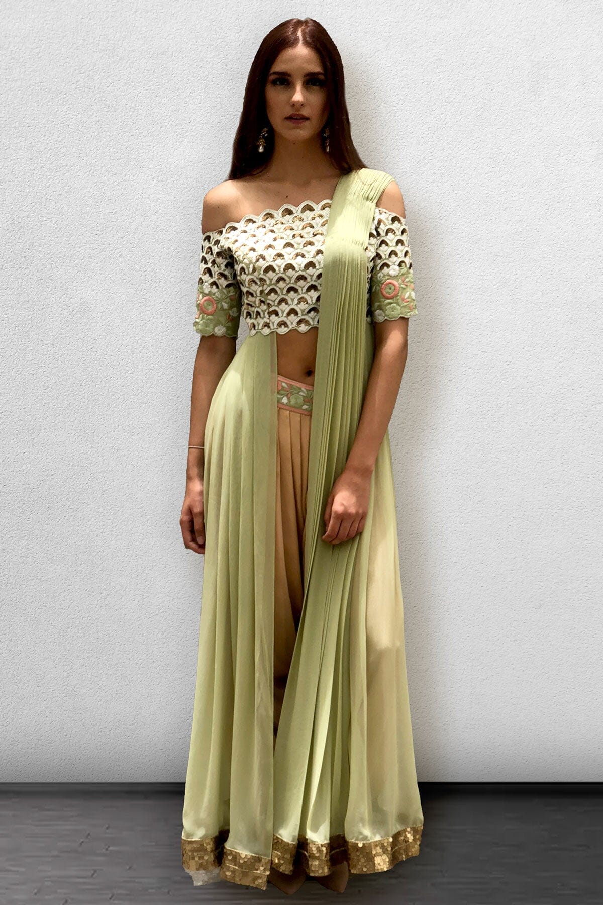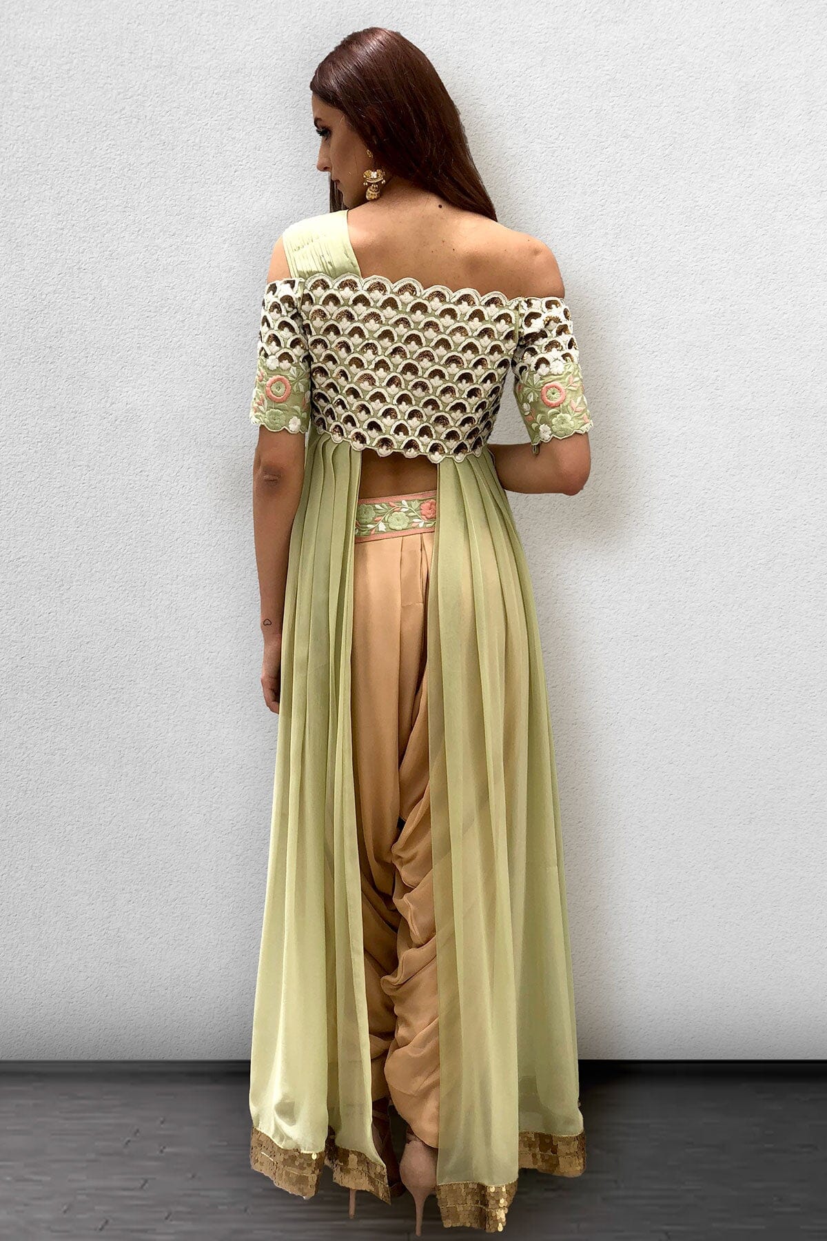 A peach and mint green Dhoti salwar set with an off-shoulder top made of Georgette.