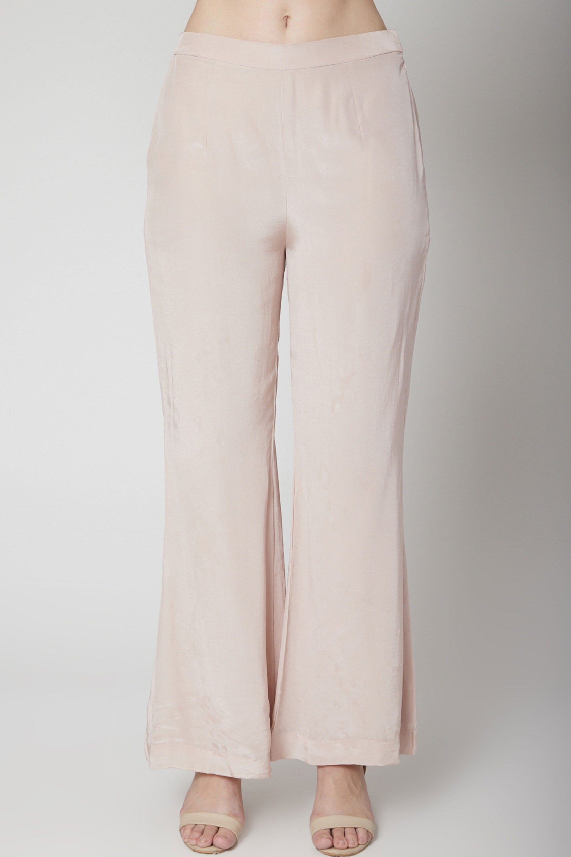 Featuring a peach off-shoulder top in silk crepe base with dabka embroidery. It is paired with matching fitted pants.