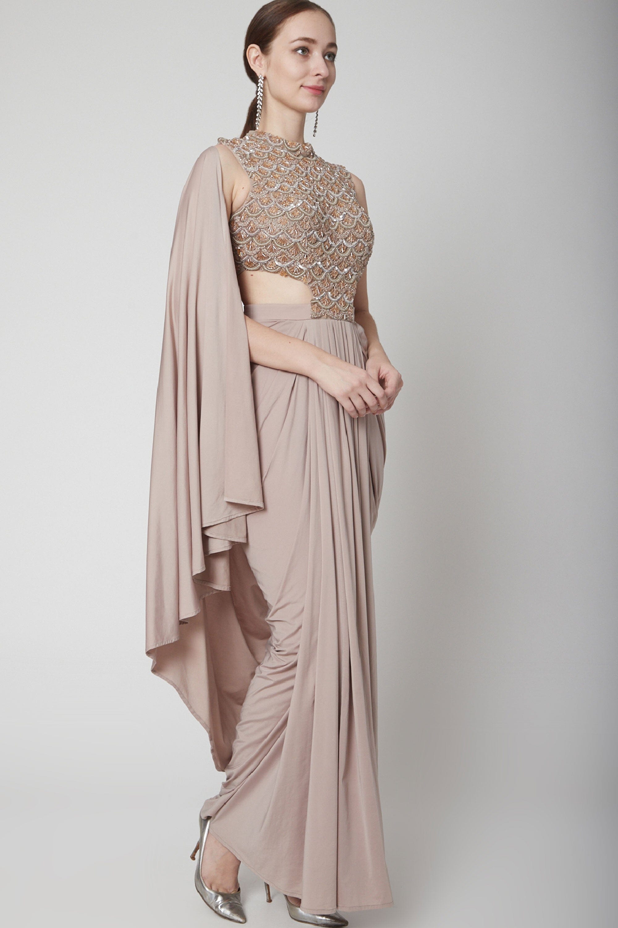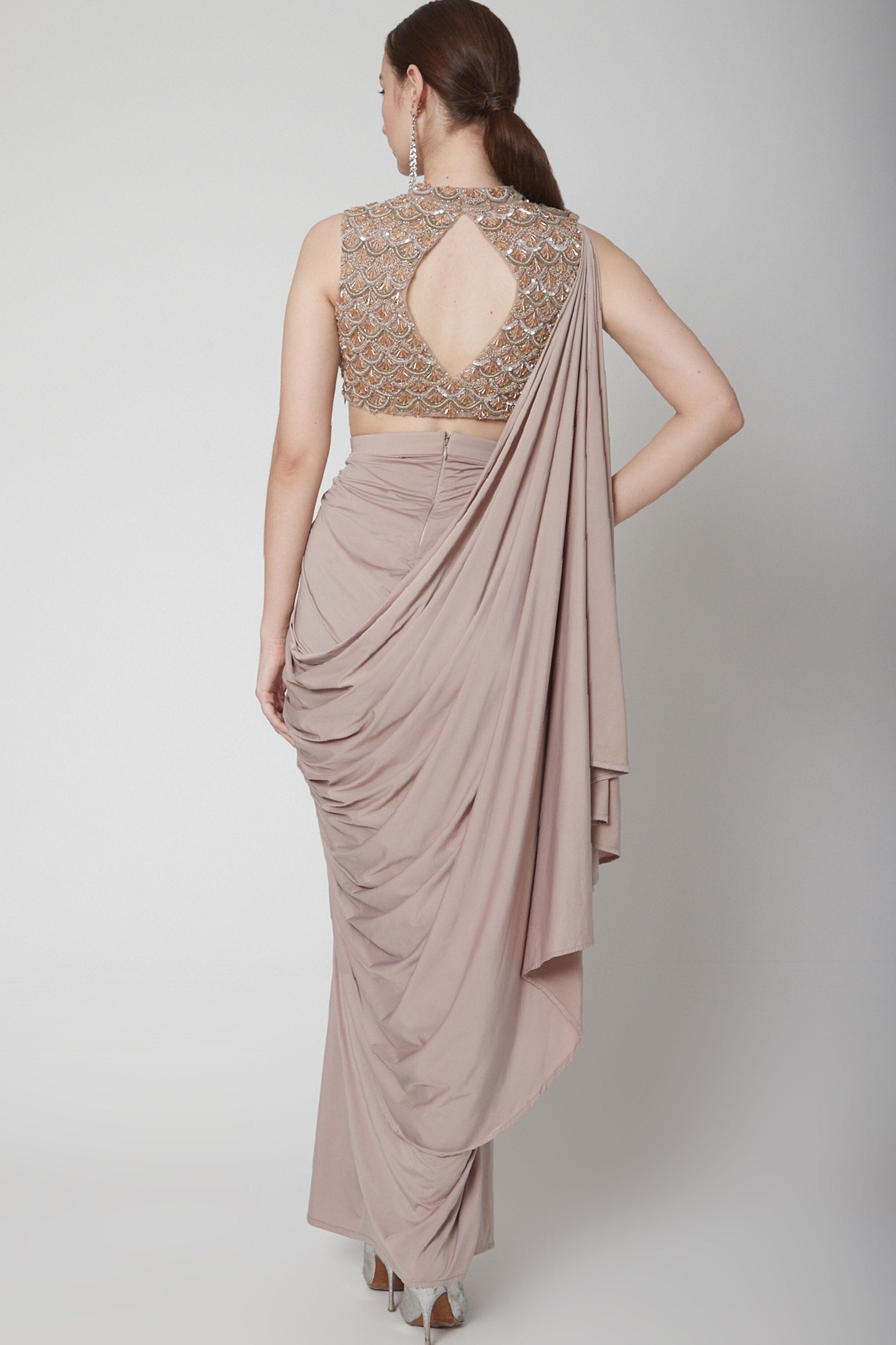 Featuring a rose gold draped saree in lycra base with Katori and sequins embroidery. It has cutouts on both sides.