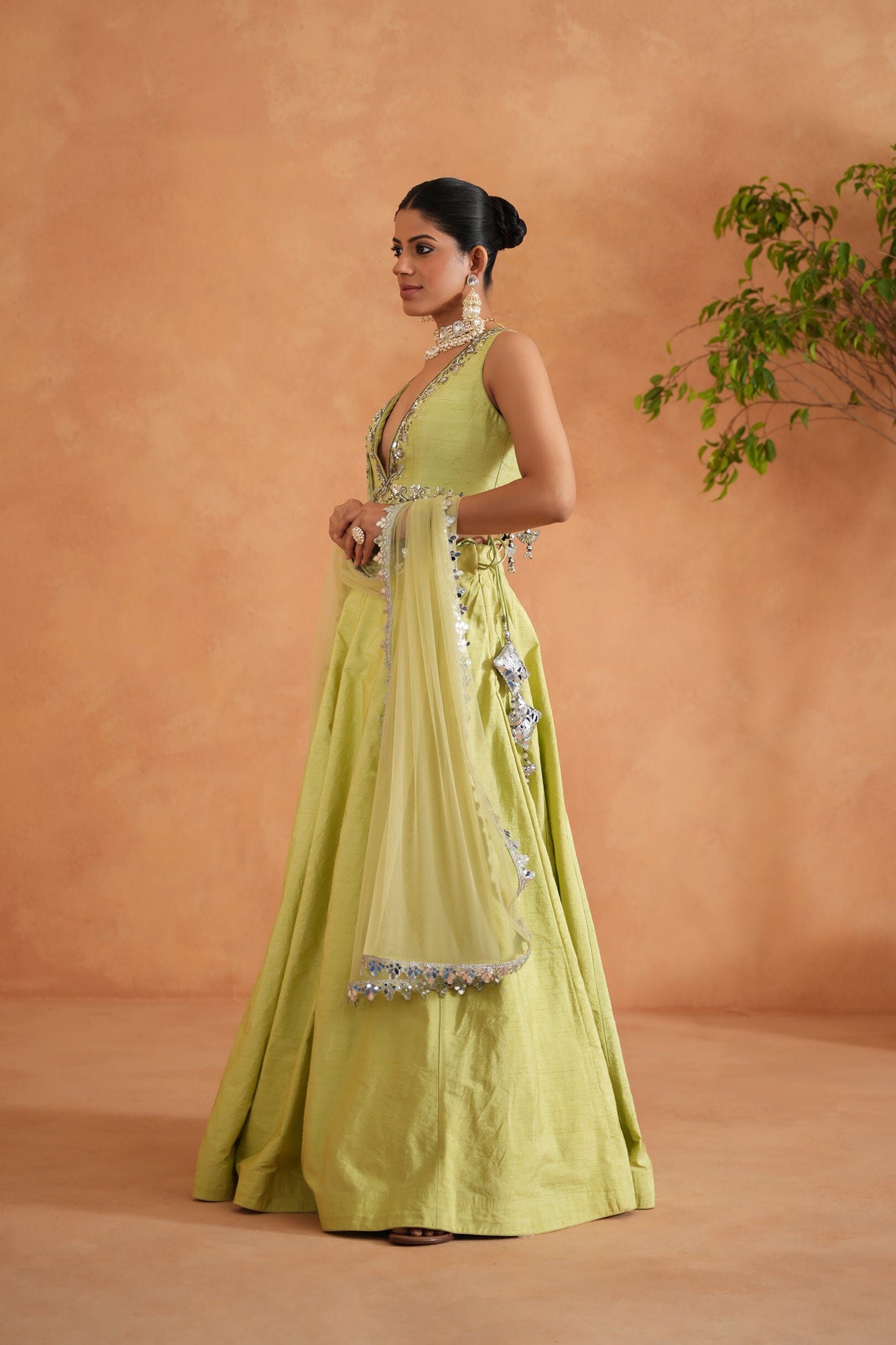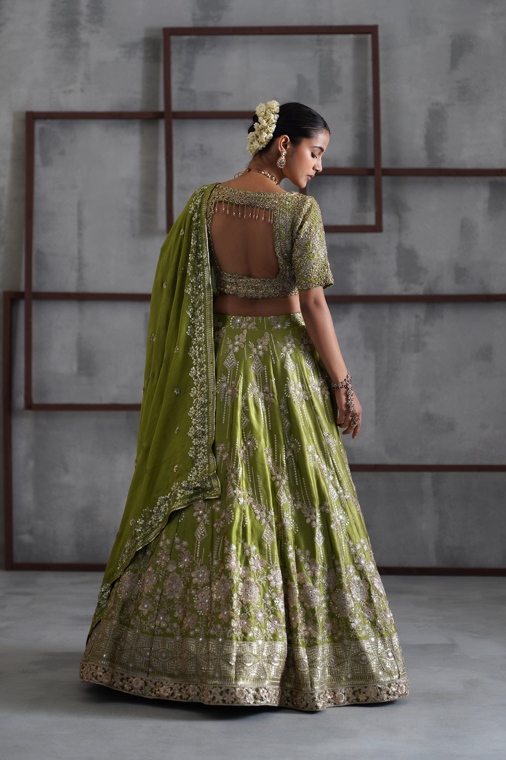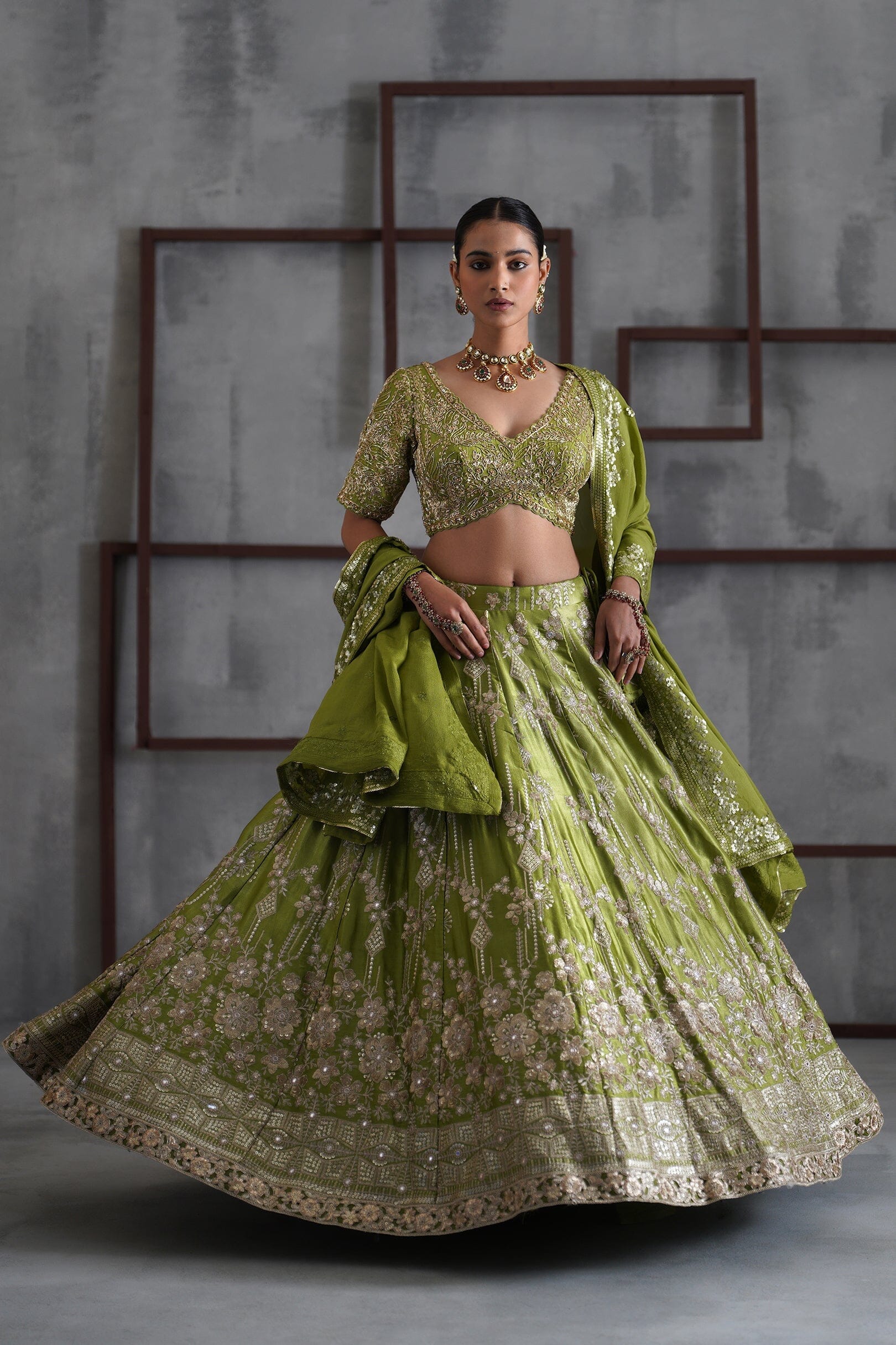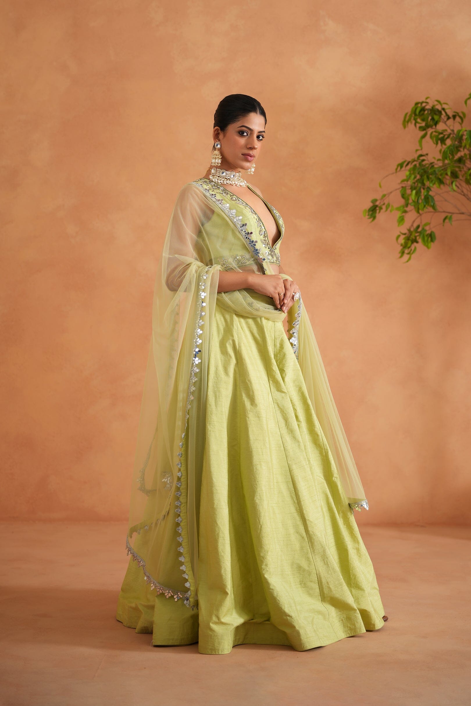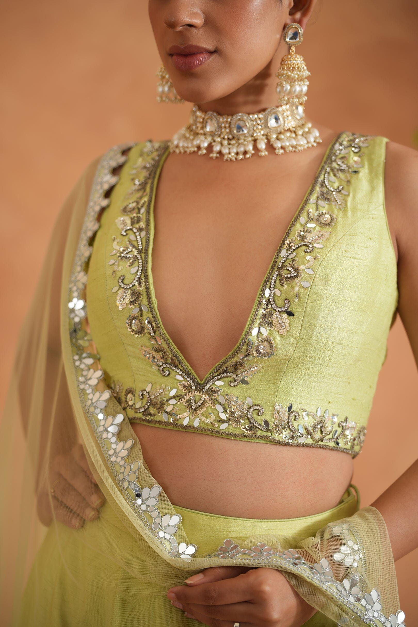 Lime Yellow Embroidered Blouse, Lehenga and Dupatta
