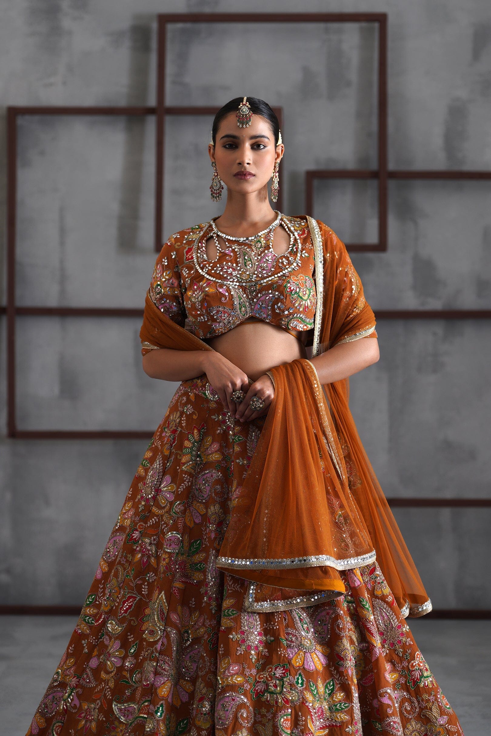 Orange Embroidered Bustier, Banarsi Lehenga and Dupatta