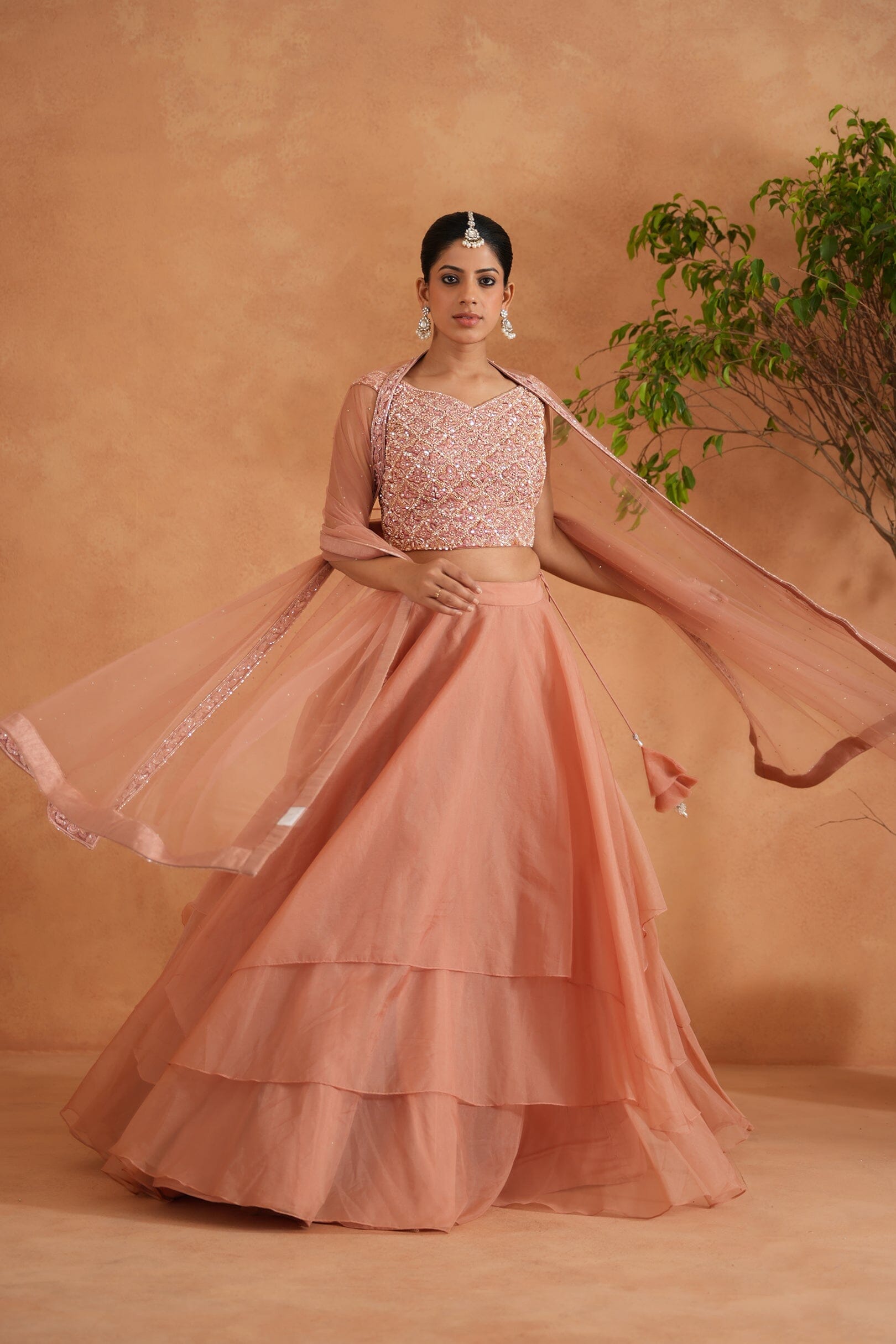 Peach Embroidered Blouse, Lehenga and Dupatta